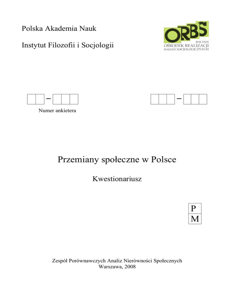 Polska Akademia Nauk Instytut Filozofii i Socjologii __ __ Numer ankietera Przemiany społeczne w Polsce Kwestionariusz P M Zespół Porównawczych Analiz Nierówności Społecznych Warszawa, 2008 A. Wprowadzenie A01-02. Na początek chciał(a)bym porozmawiać o P. sytuacji życiowej. Czy obecnie wykonuje P. jakąkolwiek pracę zarobkową? Chodzi tu nie tylko o pracę na etacie, ale także o prace dorywcze, na własny rachunek, w indywidualnym gospodarstwie rolnym i wszelkie inne, w tym także prace nierejestrowane. (1 – R. obecnie nie pracuje) (2 – R. obecnie pracuje) → A04 A03. A czy w ostatnim roku pracował(a) P. choćby przez pewien czas w indywidualnym gospodarstwie rolnym, niekoniecznie swoim? (1-tak) Jeżeli R jest rolnikiem na własnym gospodarstwie → C01 (s.5), jeśli nie → D04 (s. 09) (0-nie) → E08 (s. 13) A04. Ludzie często teraz miewają więcej niż jedną pracę, podejmują wiele zajęć zarobkowych, w tym - choćby okresowo - różne prace dorywcze. Czy obecnie ma P.: (1) tylko jedną pracę, Wpisz w A05 liczbę 1, a następnie → A06A-Jedna praca (2) czy więcej prac? A05. Ile różnych prac i zajęć zarobkowych P. obecnie wykonuje? Liczba prac → A06B-Więcej prac INSTRUKCJA 1: Przepisz liczbę prac w INSTRUKCJI 2 s. 4, INSTRUKCJI 3 na s. 7 i INSTRUKCJI 4 na s. 11. A06A - Jedna praca. Interesuje nas ta P. praca. Proszę dokładnie zapoznać się z tą kartą. [Wręczyć kartę SYTUACJA PRACY]. Proszę powiedzieć, które z wymienionych określeń dotyczy P. pracy. [Wpisać poniżej]. A06B - Więcej prac. Interesuje nas najpierw ta P. praca, która zajmuje P. najwięcej czasu. Proszę dokładnie zapoznać się z tą kartą. [Wręczyć kartę SYTUACJA PRACY]. Proszę powiedzieć, które z wymienionych określeń dotyczy tej P. pracy. [Wpisać poniżej]. Kod z karty SYTUACJA PRACY Jeżeli pierwsza cyfra = 1→ B01 Jeżeli pierwsza cyfra = 2→ C01 (s. 5) Jeżeli pierwsza cyfra = 3→ D01 (s. 9) 1 B. Praca najemna B01. Od kiedy pracuje P. w tej firmie (zakładzie pracy)? Proszę podać rok i miesiąc. Uwaga: Zakład pracy oznacza konkretne miejsce pracy R, np. nie PKP, a PKP-Cargo, PKP-Intercity. Miesiąc Rok B02. Kiedy powstała ta firma (ten zakład pracy)? Uwaga: Orientacyjnie (działalność w Polsce). (1 - przed drugą wojną światową) (2 - zaraz po wojnie lub w latach 1950-tych) (3 - w okresie 1960–1979) (4 - w latach 1980-tych) (5 -po 1989 roku ) → B02a. W którym roku? (8 – nie wiem) Rok B03. Czym zajmuje się firma (zakład pracy), w której P. pracuje? Co produkuje, jakie świadczy usługi? ................................................................. Puste GUS Puste EKD B04. Ile osób zatrudnia P. firma (zakład pracy)? Liczba osób Max 9997 B05. Proszę podać nazwę P. zawodu i stanowiska oraz wymienić wykonywane przez P. najważniejsze czynności w pracy. Zawód? . . . . . . . . . . . . . . . . . . . . . . . . . . . . . . . . . . . . . . . . . . . . . . . . . . . . . . . . . . Stanowisko? . . . . . . . . . . . . . . . . . . . . . . . . . . . . . . . . . . . . . . . . . . . . . . . . . . . . . . Czynności? . . . . . . . . . . . . . . . . . . . . . . . . . . . . . . . . . . . . . . . . . . . . . . . . . . . . . . . ................................................................. Puste SKZ Puste ISCO 2 B06. Kiedy rozpoczął(ęła) P. pracę na obecnym stanowisku? Proszę podać rok i miesiąc. Rok Miesiąc B07. Czy na obecnym stanowisku rozpoczął P. pracę: (1) w wyniku przejścia z innej firmy, czy (2) w wyniku zmiany stanowiska w ramach tej samej firmy? (3 – pierwsza praca) (4 – inne) B08. Czy zanim rozpoczął(ęła) P. pracę na obecnym stanowisku: (1) wcześniej pracował na nim ktoś inny, czy (2) nigdy nikt na nim nie pracował (zostało utworzone)? (8 — nie wiem) B09. Czy zajmuje P. stanowisko kierownicze? (1-tak) (0-nie) → B12 B10. Ile osób P. podlega - bezpośrednio lub pośrednio? Liczba osób Max 9997 B11. Czy kieruje P: (1) osobami, które same mają podwładnych, czy (2) wyłącznie osobami, które nie mają podwładnych? B12. Ile godzin w tygodniu zajmuje P. ta praca? Chodzi nam o średnią w roku i o czas rzeczywisty, a nie podany w umowie o pracę. Uwaga: Jeżeli R wykonuje tę prace krócej niż rok, chodzi o średnią tygodniową w tym okresie. Max 97 Uwaga: Jeżeli nienormowany czas pracy, „praktycznie cały czas” lub „trudno powiedzieć” pytać o wielkość przybliżoną. Liczba godzin B13. Czy jest to praca na umowę: (1) na czas określony i na pełnym etacie → B16, (2) na czas określony i na niepełnym etacie → B16 (3) na czas nieokreślony i na pełnym etacie, czy (4) na czas nieokreślony i na niepełnym etacie? (5 – inna sytuacja) Uwaga: Kategoria „na czas określony” obejmuje „na dany okres”, „na okres próbny” i „na okres wykonania konkretnej pracy”. Na pełnym etacie = w pełnym wymiarze godzin. 3 B14. Ludzie często obawiają się utraty pracy. A jak jest w P. przypadku? Czy utratę pracy uważa P. za: (1) prawie niemożliwą lub całkiem niemożliwą → B19 (2) mało prawdopodobną, → B19 (3) dość prawdopodobną, czy (4) za pewną lub prawie pewną? (8 – nie wiem, trudno powiedzieć) B15. Czy ewentualna utrata pracy mogłaby nastąpić w P. przypadku w przeciągu najbliższego roku? (1-tak) → B19 (0-nie) → B19 (8-inne) B16. Na jaki okres została zawarta umowa? Proszę podać liczbę miesięcy. Liczba miesięcy B17. Za ile miesięcy umowa się kończy? Liczba miesięcy B18. Czy po tym okresie spodziewa się P. (1) rozstania z pracodawcą, (2) przedłużenia umowy na czas określony, czy też (3) podpisania z obecnym pracodawcą umowy na czas nieokreślony? (4 – inna sytuacja) (8 – nie wiem, trudno powiedzieć) B19. Proszę powiedzieć, ile obecnie wynoszą P. przeciętne miesięczne zarobki na rękę z tej pracy. Proszę wziąć pod uwagę średnią z ostatnich trzech miesięcy, uwzględniając wszystkie dochody uzyskiwane z tej pracy, w tym ew