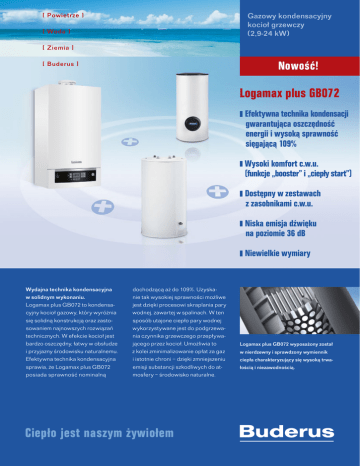 Gazowy kondensacyjny kocioł grzewczy (2,9-24 kW) [ Powietrze ] [ Woda ] [ Ziemia ] Nowość! [ Buderus ] Logamax plus GB072 Efektywna technika kondensacji gwarantująca oszczędność energii i wysoką sprawność sięgającą 109% Wysoki komfort c.w.u. (funkcje „booster” i „ciepły start”) Dostępny w zestawach z zasobnikami c.w.u. Niska emisja dźwięku na poziomie 36 dB Niewielkie wymiary Wydajna technika kondensacyjna w solidnym wykonaniu. Logamax plus GB072 to kondensacyjny kocioł gazowy, który wyróżnia się solidną konstrukcją oraz zastosowaniem najnowszych rozwiązań technicznych. W efekcie kocioł jest bardzo oszczędny, łatwy w obsłudze i przyjazny środowisku naturalnemu. Efektywna technika kondensacyjna sprawia, że Logamax plus GB072 posiada sprawność nominalną dochodzącą aż do 109%. Uzyskanie tak wysokiej sprawności możliwe jest dzięki procesowi skraplania pary wodnej, zawartej w spalinach. W ten sposób utajone ciepło pary wodnej wykorzystywane jest do podgrzewania czynnika grzewczego przepływającego przez kocioł. Umożliwia to z kolei zminimalizowanie opłat za gaz i istotnie chroni − dzięki zmniejszeniu emisji substancji szkodliwych do atmosfery − środowisko naturalne. Ciepło jest naszym żywiołem Logamax plus GB072 wyposażony został w nierdzewny i sprawdzony wymiennik ciepła charakteryzujący się wysoką trwałością i niezawodnością. Gazowy kondensacyjny kocioł grzewczy Logamax plus GB072 (2,9-24 kW) Logamax plus GB072 – wysoka jakość za rozsądne pieniądze AS P R AW N O Ś Ć Decyzja o zakupie kotła Logamax plus GB072 opłaca się pod każdym względem. Jego 109% sprawność nominalna osiągana dzięki technice kondensacyjnej, pozwala na znaczną redukcję kosztów ogrzewania. Dodatkowymi zaletami kotła jest jego standardowe wyposażenie, szybki montaż oraz łatwa i intuicyjna obsługa, a wszystko to w bardzo przystępnej cenie. SZ KO ND EN S AC JA = W YŻ Najwyższe parametry pracy. Kocioł Logamax plus GB072 dostępny jest w trzech modelach jednofunkcyjnych i jednym dwufunkcyjnym. Modele jednofunkcyjne o mocach modulowanych do 14, 20 i 24 kW, posiadają niezbędne wyposażenie potrzebne do podłączenia i współpracy z zasobnikami ciepłej wody. Wersja dwufunkcyjna charakteryzuje się mocą 24 kW na cele ogrzewania. Na potrzeby ciepłej wody, moc kotła zwiększono do 30 kW (funkcja „booster”). Bogate wyposażenie w standardzie. Najnowsze kotły Logamax plus GB072, mają w standardowym wyposażeniu Autoryzowany Partner Handlowy: intuicyjny sterownik BC20 z czytelnym i podświetlanym wyświetlaczem LCD. Sterownik posiada m.in. wbudowane funkcje „booster” i „ciepły start” dodatkowo podwyższające komfort użytkowania ciepłej wody. Standardowe wyposażenie kotłów GB072 stanowią m.in. palnik wykonany ze stali szlachetnej, wbudowane i pojemne naczynie wzbiorcze (12 litrów), przyłączeniowa płyta montażowa U-MA oraz adapter z króćcami pomiarowymi, umożliwiający łatwe i szybkie podłączenie przewodów powietrzno-spalinowych. „Nigdy nie sądziłam, że zaawansowana technika grzewcza może być dostępna za przystępną cenę. Logamax plus GB072 jest tego najlepszym przykładem”. Zalety kotła Logamax plus GB072: oszczędność energii i wysoka sprawność sięgająca 109% dzięki efektywnej technice kondensacji Szeroki wybór systemów regulacji. Do sterowania kotłem według temperatury zewnętrznej, wystarczy sterownik BC20. Dodatkowo Logamax plus GB072 przystosowany jest do współpracy z nowoczesnym systemem regulacji Logamatic EMS, dającym możliwość sterowania bezprzewodowego (maksymalnie do 3 obiegów grzewczych), czy z zaawansowanym systemem Logamatic 4000 dając możliwość sterowania wieloma obiegami grzewczymi. Bogata oferta pakietowa. Aby ułatwić kompletację elementów systemu, modele jednofunkcyjne Logamax plus GB072 dostępne są w atrakcyjnych cenowo zestawach z zasobnikami c.w.u. i różnorodną automatyką. wysoki komfort c.w.u. (funkcje „booster” i „ciepły start”) współpraca z nowoczesnymi systemami regulacji Logamatic EMS oraz Logamatic 4000 emisja dźwięku na poziomie 36 dB mały pobór mocy elektrycznej w stanie gotowości (< 2W) niewielkie wymiary Logamax plus Zakres mocy nominalnej Moc na cele c.w.u. Sprawność Wymiary (wys./szer./gł.) Ciężar (kW) (kW) (%) (mm) (kg) GB072-24 GB072-24K* 6,6-23,8 6,6-23,8 30 30 do 109 840/440/350 43 44 Logamax plus Zakres mocy nominalnej Moc na cele c.w.u. Sprawność Wymiary (wys./szer./gł.) Ciężar (kW) (kW) (%) (mm) (kg) GB072-14 GB072-20 2,9-14,2 4,7-20,6 15 24 do 109 840/440/350 43 * kocioł dwufunkcyjny Buderus Technika Grzewcza Sp. z o.o., ul. Krucza 6, 62-080 Tarnowo Podgórne•tel.: +48 61 816 71 00•fax: +48 61 816 71 60•e-mail: [email protected] • www.buderus.pl