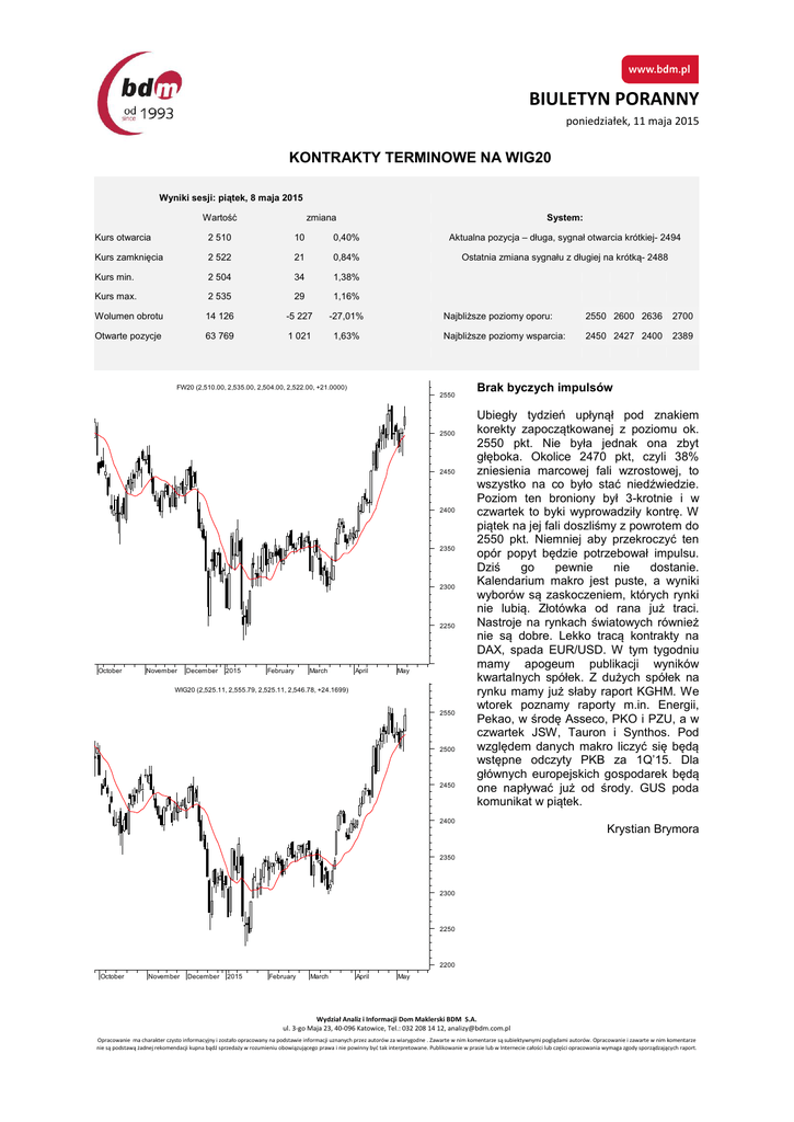 BIULETYN PORANNY poniedziałek, 11 maja 2015 KONTRAKTY TERMINOWE NA WIG20 Wyniki sesji: piątek, 8 maja 2015 Wartość System: zmiana Kurs otwarcia 2 510 10 0,40% Aktualna pozycja – długa, sygnał otwarcia krótkiej- 2494 Kurs zamknięcia 2 522 21 0,84% Ostatnia zmiana sygnału z długiej na krótką- 2488 Kurs min. 2 504 34 1,38% Kurs max. 2 535 29 1,16% Wolumen obrotu 14 126 -5 227 -27,01% Otwarte pozycje 63 769 1 021 1,63% Najbliższe poziomy oporu: 2550 2600 2636 2700 Najbliższe poziomy wsparcia: 2450 2427 2400 2389 FW20 (2,510.00, 2,535.00, 2,504.00, 2,522.00, +21.0000) 2550 2500 2450 2400 2350 2300 2250 October November December 2015 February March April May WIG20 (2,525.11, 2,555.79, 2,525.11, 2,546.78, +24.1699) 2550 2500 2450 Brak byczych impulsów Ubiegły tydzień upłynął pod znakiem korekty zapoczątkowanej z poziomu ok. 2550 pkt. Nie była jednak ona zbyt głęboka. Okolice 2470 pkt, czyli 38% zniesienia marcowej fali wzrostowej, to wszystko na co było stać niedźwiedzie. Poziom ten broniony był 3-krotnie i w czwartek to byki wyprowadziły kontrę. W piątek na jej fali doszliśmy z powrotem do 2550 pkt. Niemniej aby przekroczyć ten opór popyt będzie potrzebował impulsu. Dziś go pewnie nie dostanie. Kalendarium makro jest puste, a wyniki wyborów są zaskoczeniem, których rynki nie lubią. Złotówka od rana już traci. Nastroje na rynkach światowych również nie są dobre. Lekko tracą kontrakty na DAX, spada EUR/USD. W tym tygodniu mamy apogeum publikacji wyników kwartalnych spółek. Z dużych spółek na rynku mamy już słaby raport KGHM. We wtorek poznamy raporty m.in. Energii, Pekao, w środę Asseco, PKO i PZU, a w czwartek JSW, Tauron i Synthos. Pod względem danych makro liczyć się będą wstępne odczyty PKB za 1Q’15. Dla głównych europejskich gospodarek będą one napływać już od środy. GUS poda komunikat w piątek. 2400 Krystian Brymora 2350 2300 2250 2200 October November December 2015 February March April May Wydział Analiz i Informacji Dom Maklerski BDM S.A. ul. 3-go Maja 23, 40-096 Katowice, Tel.: 032 208 14 12, [email protected] Opracowanie ma charakter czysto informacyjny i zostało opracowany na podstawie informacji uznanych przez autorów za wiarygodne . Zawarte w nim komentarze są subiektywnymi poglądami autorów. Opracowanie i zawarte w nim komentarze nie są podstawą żadnej rekomendacji kupna bądź sprzedaży w rozumieniu obowiązującego prawa i nie powinny być tak interpretowane. Publikowanie w prasie lub w Internecie całości lub części opracowania wymaga zgody sporządzających raport. BIULETYN PORANNY poniedziałek, 11 maja 2015 RYNEK AKCJI Wyniki sesji: piątek, 8 maja 2015 52 tygodnie Indeks Kurs otwarcia Kurs zamknięcia Zmiana [%] Kurs min. Kurs max. Zakres wahań Obrót [mln PLN] Kurs max. Kurs min. WIG20 2 559,9 2 225,9 2 525,11 2 546,78 0,96% 2 525,11 2 555,79 30,7 672,3 WIG30 2 782,4 2 408,2 2 751,59 2 766,70 0,89% 2 749,67 2 773,48 23,8 707,7 mWIG40 3 946,6 3 217,9 3 940,18 3 946,11 0,45% 3 931,56 3 946,61 15,1 120,7 sWIG80 14 063,9 11 281,0 13 959,95 14 063,90 0,76% 13 959,32 14 063,90 104,6 38,2 WIG-PL 58 998,6 50 804,7 58 840,32 58 998,61 0,83% 58 840,32 58 998,61 158,3 830,4 WIG 57 460,4 49 321,8 57 064,04 57 379,45 0,82% 57 051,18 57 460,44 409,3 844,2 Spółka ALIOR BANK zmiana % względem WIG30 zmiana % Cena [PLN] 91,11 Mkt Cap [mln PLN] dzienna 1M 3M 6M dzienna 1M 3M 6M 6 607 0,2% 7,2% 9,0% 21,5% -0,7% 3,3% -1,1% 14,8% 13,8% ASSECOPOL 59,50 4 939 0,0% -2,0% 14,9% 20,5% -0,9% -5,9% 4,7% BANK HANDLOWY 112,95 14 758 0,9% 2,1% 3,5% 2,6% 0,1% -1,8% -6,6% -4,1% BOGDANKA 86,88 2 955 1,0% 4,7% -11,1% -20,0% 0,1% 0,7% -21,2% -26,7% -7,3% BORYSZEW 6,36 1 526 1,3% 6,5% 6,9% -0,6% 0,4% 2,6% -3,2% BZ WBK 381,95 37 903 1,4% 6,7% 16,1% -1,4% 0,5% 2,8% 6,0% -8,1% CCC 186,00 7 142 -2,1% 6,2% 16,8% 26,1% -3,0% 2,3% 6,7% 19,4% CYFROWY POLSAT 25,55 16 340 -0,8% 2,7% 12,3% 0,2% -1,7% -1,2% 2,2% -6,5% ENEA 16,83 7 429 1,3% 1,8% 0,2% 3,3% 0,4% -2,2% -9,9% -3,5% EUROCASH 38,24 5 303 0,8% 6,2% 2,5% 21,4% -0,1% 2,3% -7,6% 14,7% GRUPA AZOTY 85,45 8 476 3,0% 0,6% 23,6% 44,8% 2,1% -3,4% 13,5% 38,1% GTC 6,27 2 203 1,1% 10,8% 36,3% 8,3% 0,2% 6,9% 26,2% 1,6% ING BSK 146,60 19 073 -0,3% 0,8% 3,6% 1,2% -1,2% -3,2% -6,5% -5,5% JSW 14,25 1 673 1,4% -15,6% -30,1% -38,2% 0,5% -19,5% -40,2% -44,9% KERNEL 35,75 2 849 1,1% -8,6% 18,0% 54,6% 0,2% -12,5% 7,9% 47,9% KGHM 129,90 25 980 1,6% 8,9% 14,0% 4,6% 0,8% 5,0% 3,9% -2,1% LOTOS 30,94 5 720 1,7% 1,8% 29,7% 26,3% 0,8% -2,1% 19,6% 19,5% 7 326,50 13 416 2,4% 7,7% -7,7% -17,9% 1,5% 3,8% -17,8% -24,6% 483,70 20 417 -0,1% 5,6% 11,9% 0,8% -0,9% 1,7% 1,7% -5,9% NETIA 6,00 2 089 2,4% 7,0% 1,2% 8,3% 1,5% 3,0% -8,9% 1,6% ORANGE POLSKA 10,03 13 163 -0,1% -0,9% 13,3% 1,1% -1,0% -4,8% 3,2% -5,6% PEKAO 194,05 50 932 0,5% 4,0% 5,3% 9,6% -0,4% 0,1% -4,8% 2,9% PGE 20,20 37 769 0,0% -1,8% 3,7% -6,3% -0,9% -5,8% -6,4% -13,0% PGNIG 6,63 39 117 1,5% 12,6% 49,3% 33,7% 0,6% 8,6% 39,2% 27,0% PKNORLEN 68,00 29 084 2,4% 7,9% 25,2% 55,0% 1,5% 4,0% 15,1% 48,3% PKOBP 37,70 47 125 1,2% 10,9% 16,4% 3,9% 0,3% 7,0% 6,2% -2,9% PZU 477,00 41 190 1,3% -3,8% -2,9% -2,9% 0,4% -7,7% -13,0% -9,6% SYNTHOS 4,84 6 405 0,6% 2,3% 12,3% 16,3% -0,3% -1,6% 2,2% 9,6% TAURON 4,85 8 500 -0,6% 2,8% -2,2% -8,3% -1,5% -1,2% -12,3% -15,0% TVN 17,69 6 240 -0,6% 4,4% 2,4% 20,3% -1,5% 0,5% -7,7% 13,6% LPP mBANK Wydział Analiz i Informacji Dom Maklerski BDM S.A. ul. 3-go Maja 23, 40-096 Katowice, Tel.: 032 208 14 12, [email protected] Opracowanie ma charakter czysto informacyjny i zostało opracowany na podstawie informacji uznanych przez autorów za wiarygodne . Zawarte w nim komentarze są subiektywnymi poglądami autorów. Opracowanie i zawarte w nim komentarze nie są podstawą żadnej rekomendacji kupna bądź sprzedaży w rozumieniu obowiązującego prawa i nie powinny być tak interpretowane. Publikowanie w prasie lub w Internecie całości lub części opracowania wymaga zgody sporządzających raport. BIULETYN PORANNY poniedziałe