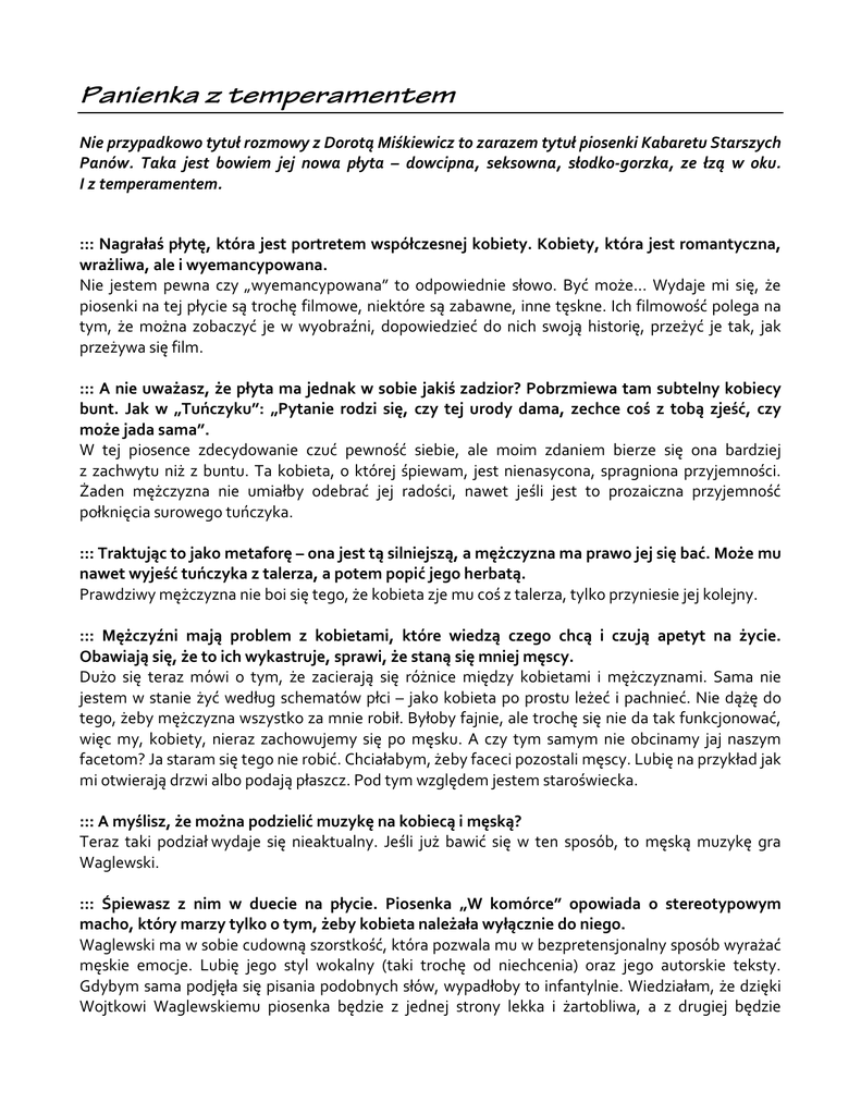Panienka z temperamentem Nie przypadkowo tytuł rozmowy z Dorotą Miśkiewicz to zarazem tytuł piosenki Kabaretu Starszych Panów. Taka jest bowiem jej nowa płyta – dowcipna, seksowna, słodko-gorzka, ze łzą w oku. I z temperamentem. ::: Nagrałaś płytę, która jest portretem współczesnej kobiety. Kobiety, która jest romantyczna, wrażliwa, ale i wyemancypowana. Nie jestem pewna czy „wyemancypowana” to odpowiednie słowo. Być może... Wydaje mi się, że piosenki na tej płycie są trochę filmowe, niektóre są zabawne, inne tęskne. Ich filmowość polega na tym, że można zobaczyć je w wyobraźni, dopowiedzieć do nich swoją historię, przeżyć je tak, jak przeżywa się film. ::: A nie uważasz, że płyta ma jednak w sobie jakiś zadzior? Pobrzmiewa tam subtelny kobiecy bunt. Jak w „Tuńczyku”: „Pytanie rodzi się, czy tej urody dama, zechce coś z tobą zjeść, czy może jada sama”. W tej piosence zdecydowanie czuć pewność siebie, ale moim zdaniem bierze się ona bardziej z zachwytu niż z buntu. Ta kobieta, o której śpiewam, jest nienasycona, spragniona przyjemności. Żaden mężczyzna nie umiałby odebrać jej radości, nawet jeśli jest to prozaiczna przyjemność połknięcia surowego tuńczyka. ::: Traktując to jako metaforę – ona jest tą silniejszą, a mężczyzna ma prawo jej się bać. Może mu nawet wyjeść tuńczyka z talerza, a potem popić jego herbatą. Prawdziwy mężczyzna nie boi się tego, że kobieta zje mu coś z talerza, tylko przyniesie jej kolejny. ::: Mężczyźni mają problem z kobietami, które wiedzą czego chcą i czują apetyt na życie. Obawiają się, że to ich wykastruje, sprawi, że staną się mniej męscy. Dużo się teraz mówi o tym, że zacierają się różnice między kobietami i mężczyznami. Sama nie jestem w stanie żyć według schematów płci – jako kobieta po prostu leżeć i pachnieć. Nie dążę do tego, żeby mężczyzna wszystko za mnie robił. Byłoby fajnie, ale trochę się nie da tak funkcjonować, więc my, kobiety, nieraz zachowujemy się po męsku. A czy tym samym nie obcinamy jaj naszym facetom? Ja staram się tego nie robić. Chciałabym, żeby faceci pozostali męscy. Lubię na przykład jak mi otwierają drzwi albo podają płaszcz. Pod tym względem jestem staroświecka. ::: A myślisz, że można podzielić muzykę na kobiecą i męską? Teraz taki podział wydaje się nieaktualny. Jeśli już bawić się w ten sposób, to męską muzykę gra Waglewski. ::: Śpiewasz z nim w duecie na płycie. Piosenka „W komórce” opowiada o stereotypowym macho, który marzy tylko o tym, żeby kobieta należała wyłącznie do niego. Waglewski ma w sobie cudowną szorstkość, która pozwala mu w bezpretensjonalny sposób wyrażać męskie emocje. Lubię jego styl wokalny (taki trochę od niechcenia) oraz jego autorskie teksty. Gdybym sama podjęła się pisania podobnych słów, wypadłoby to infantylnie. Wiedziałam, że dzięki Wojtkowi Waglewskiemu piosenka będzie z jednej strony lekka i żartobliwa, a z drugiej będzie komentować wnikliwie relacje damsko-męskie. Kretyńską sieć, w którą wszyscy się łapiemy. Zawsze dążymy do tego, by posiąść swojego partnera. Szkoda, bo najpiękniejsza w miłości jest akceptacja, szacunek dla odrębności drugiej osoby i zgoda na jej wolność wyboru. ::: Często śpiewasz tonem małej dziewczynki o bardzo poważnych sprawach. Celowo używasz takiego kontrastu? Po prostu mam taki głos. Inna sprawa, że chyba potrzebuję jeszcze trochę czasu, żeby przyzwyczaić się do śpiewania w niższych tonacjach. Kiedyś śpiewałam tylko bardzo wysoko, teraz czuję, że mój głos samoistnie się obniża. A ja zostałam w wysokich tonacjach. ::: Czy to znaczy, że żyjesz na wysokim „c”? W twoich piosenkach widać pragnienie celebrowania życia, ale i lęk przed tym, że „życie jest gdzie indziej”. Śpiewasz w utworze „Ale”: „Żale, tylko te z najgłębszych. Fale, gdy potężny sztorm. Balet, tylko gdy najlepszy. Ale może robisz błąd? Może życie raczej szare jest i w Madrycie leje. Może kino w San Marino i nic się nie dzieje. Może życie całkiem szare jest? Doceń te szarości, odcień życia, odblask też”. Czy potrafisz docenić również te szarości? Szary to mój ulubiony kolor. Dobrze wyczuł to Grzegorz Turnau - autor cytowanych słów. Kiedy pokazałam tekst Ewie Bem, powiedziała, że jest smutny. Zdziwiłam się – przecież szarość jest cudowna. To, co znajduje się pomiędzy czernią a bielą jest różnorodne i prawdziwe. Zresztą w przyrodzie czysta czerń i czysta biel nie występują. ::: Nie szukasz spektakularnych doznań? Codzienność cię nie boli? Czasem mi się nudzi. Jednak moja praca nie polega na tym, że codziennie rano idę do biura i siedzę przy biurku osiem godzin. Gdy wychodzę na scenę, dostaję niezbędną dawkę adrenaliny. Można też spojrzeć na to inaczej: to, czy nudzimy się ze sobą, w swoim życiu, zależy tylko od nas. Chodzi mi o to coś w nas samych, co daje nam siłę, by afirmować życie. Mam taki przebłysk sprzed paru lat: biorę słoik z miodem, robię sobie gorzką herbatę, słodzę ją. Jestem szczęśliwa. A w telefonie przechowuję zdjęcie mojego roweru, Wigry 3. On się rozwala, ledwo już jeździ, bałabym się na nim poruszać po mieście, ale przejażdżki rowerowe po wiejskich drogach w okolicy mojej działki, to dla mnie czysta radość. ::: Nie bywasz Panią Bovary, która zawsze chce czegoś innego niż ma? Każda kobieta czasem pragnie rzeczy, których nie może dostać. To nie musi być problem, jeśli równocześnie potrafi wykonać wewnętrzną pracę i docenić to, co ma. I tego się trzymać. Powiedzieć „halo”, zatrzymaj się, przecież jest całkiem fajnie. Zawsze się nam wydaje, że u sąsiada wiszą lepsze firanki niż u nas. „Kochanie, dlaczego nie mamy takich firanek, jak ma Wiola?”. Mam problem, gdy ktoś mnie pyta, o czym 
