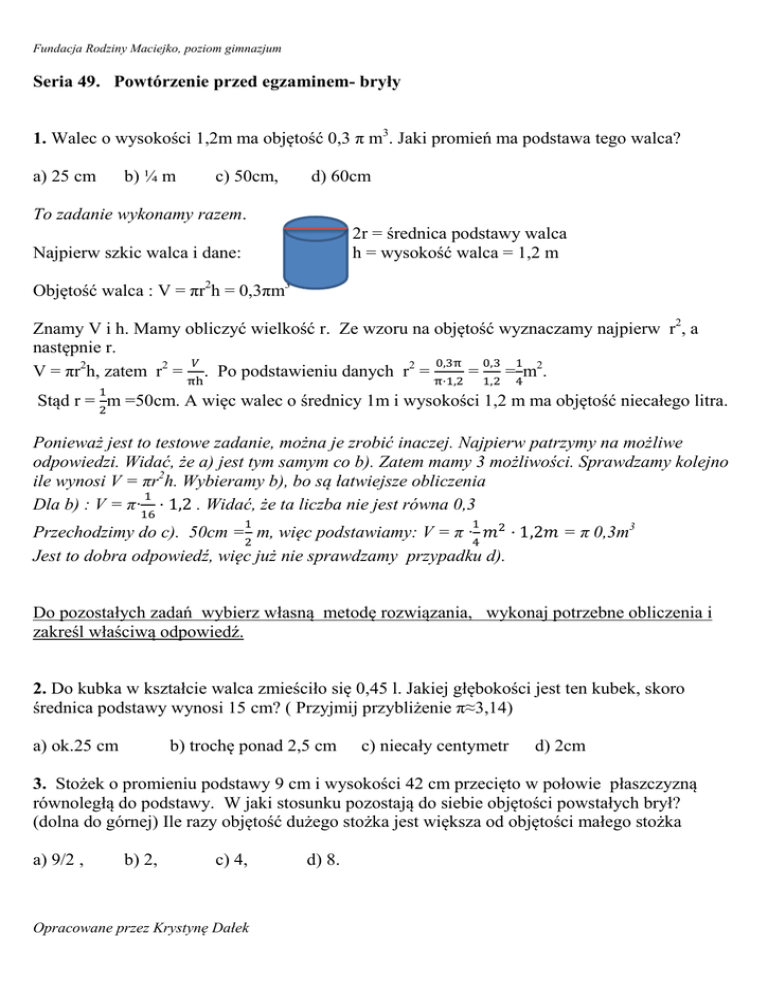 Fundacja Rodziny Maciejko, poziom gimnazjum Seria 49. Powtórzenie przed egzaminem- bryły 1. Walec o wysokości 1,2m ma objętość 0,3 π m3. Jaki promień ma podstawa tego walca? b) ¼ m a) 25 cm c) 50cm, d) 60cm To zadanie wykonamy razem. 2r = średnica podstawy walca h = wysokość walca = 1,2 m Najpierw szkic walca i dane: Objętość walca : V = πr2h = 0,3πm3 Znamy V i h. Mamy obliczyć wielkość r. Ze wzoru na objętość wyznaczamy najpierw r2, a następnie r. 𝑉 0,3π 0,3 1 V = πr2h, zatem r2 = . Po podstawieniu danych r2 = = = m2. πh 1 π·1,2 1,2 4 Stąd r = m =50cm. A więc walec o średnicy 1m i wysokości 1,2 m ma objętość niecałego litra. 2 Ponieważ jest to testowe zadanie, można je zrobić inaczej. Najpierw patrzymy na możliwe odpowiedzi. Widać, że a) jest tym samym co b). Zatem mamy 3 możliwości. Sprawdzamy kolejno ile wynosi V = πr2h. Wybieramy b), bo są łatwiejsze obliczenia 1 Dla b) : V = π· · 1,2 . Widać, że ta liczba nie jest równa 0,3 16 1 1 Przechodzimy do c). 50cm = m, więc podstawiamy: V = π · 𝑚2 · 1,2𝑚 = π 0,3m3 2 4 Jest to dobra odpowiedź, więc już nie sprawdzamy przypadku d). Do pozostałych zadań wybierz własną metodę rozwiązania, wykonaj potrzebne obliczenia i zakreśl właściwą odpowiedź. 2. Do kubka w kształcie walca zmieściło się 0,45 l. Jakiej głębokości jest ten kubek, skoro średnica podstawy wynosi 15 cm? ( Przyjmij przybliżenie π≈3,14) b) trochę ponad 2,5 cm a) ok.25 cm c) niecały centymetr d) 2cm 3. Stożek o promieniu podstawy 9 cm i wysokości 42 cm przecięto w połowie płaszczyzną równoległą do podstawy. W jaki stosunku pozostają do siebie objętości powstałych brył? (dolna do górnej) Ile razy objętość dużego stożka jest większa od objętości małego stożka a) 9/2 , b) 2, c) 4, Opracowane przez Krystynę Dałek d) 8. Fundacja Rodziny Maciejko, poziom gimnazjum 4. Rożek w kształcie stożka o średnicy 20cm nakryto ściśle przylegającą półkulą. Jaka musi być wysokość stożka, aby objętość stożka była równa objętości półkuli? a) 20cm b) 15cm c) 5 cm d) 25cm 5. Ostrosłup ma w podstawie prostokąt 12cm x18cm. Jak jest powierzchnia całkowita tego ostrosłupa, jeśli jego wysokość wynosi 30cm? a) 54√26 +18√109 b) 216+72√26 + 54√109 d) wszystkie odpowiedzi są błędne. Opracowane przez Krystynę Dałek c) 216+54√26 + 18√109