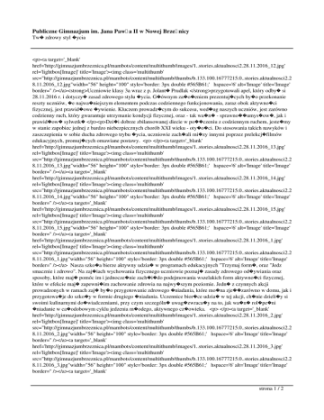 Publiczne Gimnazjum im. Jana Paw�a II w Nowej Brze�nicy Tw� zdrowy styl �ycia <p><a target='_blank' href='http://gimnazjumbrzeznica.pl/mambots/content/multithumb/images/1..stories.aktualnosci2.28.11.2016_12.jpg' rel='lightbox[Image]' title='Image'><img class='multithumb' src="http://gimnazjumbrzeznica.pl/mambots/content/multithumb/thumbs/b.133.100.16777215.0..stories.aktualnosci2.2 8.11.2016_12.jpg"width="56" height="100" style='border: 3px double #565B61;' hspace='6' alt='Image' title='Image' border='' /></a><strong>Uczniowie klasy 3a wraz z p. Jolant� Prudlak </strong>przygotowali apel, który odby� si 28.11.2016 r. i dotyczy� zasad zdrowego stylu �ycia. G�ównym za�o�eniem prezentuj�cych by�o przekonanie reszty uczniów, �e najwa�niejszym elementem podczas codziennego funkcjonowania, zaraz obok aktywno�ci fizycznej, jest prawid�owe �ywienie. Kluczem prowadz�cym do sukcesu, wed�ug naszych uczniów, jest zarówno codzienny ruch, który gwarantuje utrzymanie kondycji fizycznej, oraz - tak wa�n� - sprawno��umys�ow�, jak i prawid�ow� sylwetk� </p><p>Dzi�i dobrze zbilansowanej diecie w po��czeniu z codziennym ruchem, jeste�my w stanie zapobiec jednej z bardzo niebezpiecznych chorób XXI wieku - oty�o�ci. Do stosowania takich nawyków i zaszczepienia w sobie ducha zdrowego trybu �ycia, uczniowie zach�ali mi�zy innymi poprzez prelekcj�filmów edukacyjnych, promuj�cych omawiane postawy. <p> </p><a target='_blank' href='http://gimnazjumbrzeznica.pl/mambots/content/multithumb/images/1..stories.aktualnosci2.28.11.2016_13.jpg' rel='lightbox[Image]' title='Image'><img class='multithumb' src="http://gimnazjumbrzeznica.pl/mambots/content/multithumb/thumbs/b.133.100.16777215.0..stories.aktualnosci2.2 8.11.2016_13.jpg"width="56" height="100" style='border: 3px double #565B61;' hspace='6' alt='Image' title='Image' border='' /></a><a target='_blank' href='http://gimnazjumbrzeznica.pl/mambots/content/multithumb/images/1..stories.aktualnosci2.28.11.2016_14.jpg' rel='lightbox[Image]' title='Image'><img class='multithumb' src="http://gimnazjumbrzeznica.pl/mambots/content/multithumb/thumbs/b.133.100.16777215.0..stories.aktualnosci2.2 8.11.2016_14.jpg"width="56" height="100" style='border: 3px double #565B61;' hspace='6' alt='Image' title='Image' border='' /></a><a target='_blank' href='http://gimnazjumbrzeznica.pl/mambots/content/multithumb/images/1..stories.aktualnosci2.28.11.2016_15.jpg' rel='lightbox[Image]' title='Image'><img class='multithumb' src="http://gimnazjumbrzeznica.pl/mambots/content/multithumb/thumbs/b.133.100.16777215.0..stories.aktualnosci2.2 8.11.2016_15.jpg"width="56" height="100" style='border: 3px double #565B61;' hspace='6' alt='Image' title='Image' border='' /></a><a target='_blank' href='http://gimnazjumbrzeznica.pl/mambots/content/multithumb/images/1..stories.aktualnosci2.28.11.2016_1.jpg' rel='lightbox[Image]' title='Image'><img class='multithumb' src="http://gimnazjumbrzeznica.pl/mambots/content/multithumb/thumbs/b.133.100.16777215.0..stories.aktualnosci2.2 8.11.2016_1.jpg"width="56" height="100" style='border: 3px double #565B61;' hspace='6' alt='Image' title='Image' border='' /></a> Nasza szko�a bierze aktywny udzia� w programach edukacyjnych "Trzymaj form�, oraz "Jedz smacznie i zdrowo". Na zaj�iach wychowania fizycznego uczniowie poznaj� zasady zdrowego od�ywiania oraz sposoby, które maj� pomóc im i jednocze�nie zach�i�do podejmowania wszelakich form aktywno�ci fizycznej, które w efekcie maj� zapewni�im zachowanie zdrowia na najwy�szym poziomie. Jedn� z czynnych akcji prowadzonych w ramach zaj� by�o przygotowanie zdrowego �niadania, które mo�na zje��zarówno w domu, jak i przygotowa�je do szko�y w formie drugiego �niadania. Uczennice bior�ce udzia� w tej akcji, ch�nie dzieli�y si swoimi kulinarnymi do�wiadczeniami, przy czym szczególn� uwag�zwraca�y na to, jak wa�n� rol�pe�ni �niadanie w ca�odobowym cyklu jedzenia m�odego, aktywnego cz�owieka. <p> </p><a target='_blank' href='http://gimnazjumbrzeznica.pl/mambots/content/multithumb/images/1..stories.aktualnosci2.28.11.2016_2.jpg' rel='lightbox[Image]' title='Image'><img class='multithumb' src="http://gimnazjumbrzeznica.pl/mambots/content/multithumb/thumbs/b.133.100.16777215.0..stories.aktualnosci2.2 8.11.2016_2.jpg"width="56" height="100" style='border: 3px double #565B61;' hspace='6' alt='Image' title='Image' border='' /></a><a target='_blank' href='http://gimnazjumbrzeznica.pl/mambots/content/multithumb/images/1..stories.aktualnosci2.28.11.2016_3.jpg' rel='lightbox[Image]' title='Image'><img class='multithumb' src="http://gimnazjumbrzeznica.pl/mambots/content/multithumb/thumbs/b.133.100.16777215.0..stories.aktualnosci2.2 8.11.2016_3.jpg"width="56" height="100" style='border: 3px double #565B61;' hspace='6' alt='Image' title='Image' border='' /></a><a target='_blank' strona 1 / 2 Publiczne Gimnazjum im. Jana Paw�a II w Nowej Brze�nicy Tw� zdrowy styl �ycia href='http://gimnazjumbrzeznica.pl/mambots/content/multithumb/images/1..stories.aktualnosci2.28.11.2016_4 .jpg' rel='lightbox[Image]' title='Image'><img class='multithumb' src="http://gimnazjumbrzeznica.pl/mambots/content/multithumb/thumbs/b.133.100.16777215.0..stories.aktualnosci2.2 8.11.2016_4 .jpg"width="56" height="100" style='border: 3px double #565B61;' hspace='6' alt='Image' title='Image' border='' /></a><a target='_blank' href='http://gimnazjumbrzeznica.pl/mambots/content/multithumb/images/1..stories.aktualnosci2.28.11.2016_5.jpg' rel='lightbox[Image]' title='Image'><img class='multithumb' src="http://gimnazjumbrzeznica.pl/mambots/content/multithumb/thumbs/b.133.100.16777215.0..stories.aktualnosci2.2 8.11.2016_5.jpg"width="56" height="100" style='border: 3px double #565B61;' hspace='6' alt='Image' title='Image' border='' /></a> <p> </p><a target='_blank' href='http://gimnazjumbrzeznica.pl/mambots/co