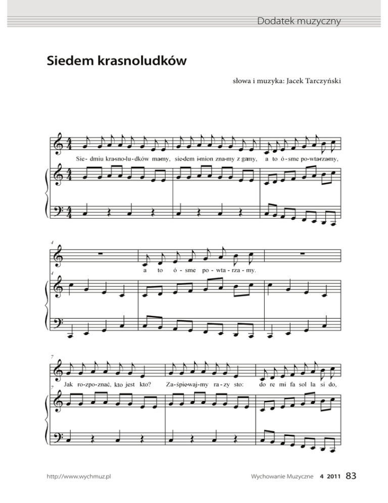 Dodatek muzyczny 4JFEFNLSBTOPMVELØX słowa i muzyka: Jacek Tarczyński http://www.wychmuz.pl Wychowanie Muzyczne 83 Dodatek muzyczny Siedmiu krasnoludków mamy, siedem imion znamy z gamy, a to ósme powtarzamy, a to ósme powtarzamy. Siedmiu krasnoludków mamy, siedem imion znamy z gamy, a to ósme powtarzamy, a to ósme powtarzamy. Jak rozpoznać, kto jest kto? Zaśpiewajmy razy sto: do re mi fa sol la si do, do re mi fa sol la si do. 84 Wychowanie Muzyczne http://www.wychmuz.pl