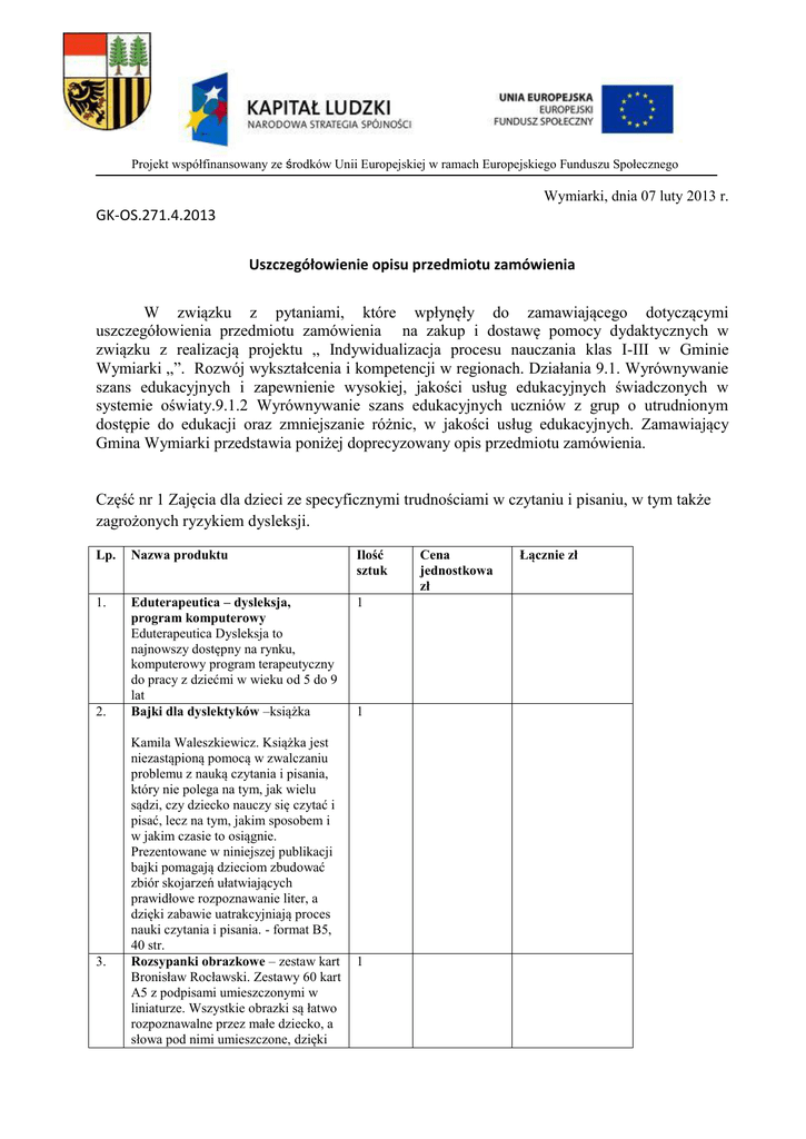 Projekt współfinansowany ze środków Unii Europejskiej w ramach Europejskiego Funduszu Społecznego Wymiarki, dnia 07 luty 2013 r. GK-OS.271.4.2013 Uszczegółowienie opisu przedmiotu zamówienia W związku z pytaniami, które wpłynęły do zamawiającego dotyczącymi uszczegółowienia przedmiotu zamówienia na zakup i dostawę pomocy dydaktycznych w związku z realizacją projektu „ Indywidualizacja procesu nauczania klas I-III w Gminie Wymiarki „”. Rozwój wykształcenia i kompetencji w regionach. Działania 9.1. Wyrównywanie szans edukacyjnych i zapewnienie wysokiej, jakości usług edukacyjnych świadczonych w systemie oświaty.9.1.2 Wyrównywanie szans edukacyjnych uczniów z grup o utrudnionym dostępie do edukacji oraz zmniejszanie różnic, w jakości usług edukacyjnych. Zamawiający Gmina Wymiarki przedstawia poniżej doprecyzowany opis przedmiotu zamówienia. Część nr 1 Zajęcia dla dzieci ze specyficznymi trudnościami w czytaniu i pisaniu, w tym także zagrożonych ryzykiem dysleksji. Lp. Nazwa produktu Ilość sztuk 1. Eduterapeutica – dysleksja, program komputerowy Eduterapeutica Dysleksja to najnowszy dostępny na rynku, komputerowy program terapeutyczny do pracy z dziećmi w wieku od 5 do 9 lat Bajki dla dyslektyków –książka 1 2. 3. Kamila Waleszkiewicz. Książka jest niezastąpioną pomocą w zwalczaniu problemu z nauką czytania i pisania, który nie polega na tym, jak wielu sądzi, czy dziecko nauczy się czytać i pisać, lecz na tym, jakim sposobem i w jakim czasie to osiągnie. Prezentowane w niniejszej publikacji bajki pomagają dzieciom zbudować zbiór skojarzeń ułatwiających prawidłowe rozpoznawanie liter, a dzięki zabawie uatrakcyjniają proces nauki czytania i pisania. - format B5, 40 str. Rozsypanki obrazkowe – zestaw kart Bronisław Rocławski. Zestawy 60 kart A5 z podpisami umieszczonymi w liniaturze. Wszystkie obrazki są łatwo rozpoznawalne przez małe dziecko, a słowa pod nimi umieszczone, dzięki 1 1 Cena jednostkowa zł Łącznie zł 4. odstępom między literami, można bez trudu wykorzystać do ćwiczeń wszystkich syntez i analiz, doprowadzających dzieci do czytania i pisania. Rozsypanki obrazkowe - zestaw kart Bronisław Rocławski. Zestawy 60 kart A5 z podpisami umieszczonymi w liniaturze. Wszystkie obrazki są łatwo rozpoznawalne przez małe dziecko, a słowa pod nimi umieszczone, dzięki odstępom między literami, można bez trudu wykorzystać do ćwiczeń wszystkich syntez i analiz, doprowadzających dzieci do czytania i pisania. 2 5. Zaczynamy czytać i pisać - książka Książka przeznaczona jest dla dzieci od lat pięciu. Zamieszczone w niej ćwiczenia usprawniają wszystkie funkcje poznawcze oraz w prosty sposób uczą, a następnie kształcą i doskonalą technikę czytania i pisania. Małgorzata Bastek. - format 20 x 29 cm, 112 str. 1 6. Sokole oko – gra 2 Wspaniały zestaw gier edukacyjnych ćwiczy spostrzegawczość refleks i pamięć daje wiele radości. W zestawie aż 8 gier: Bystre oczko Sokole oko Skojarzenia Bingo obrazkowe Bingo – Skojarzenia Bingo – oczko Zgadula Niby Lotek. 4 dwustronne plansze (23 6 x 16 cm) 140 żetonów (2 8 x 2 8 cm) 7. 8. Rok pary przyjaciół – układanka 48 puzli, wym pudełka 33x25,5x6 cm Rebusy obrazkowe Na każdej karcie znajduje się rysunek, litery drukowane: wielka i mała oraz schemat wyrazu przedstawiający ilość głosek. Korzystanie z kart pomaga w ćwiczeniach: zapamiętywania i przypominania kształtów i nazw poszczególnych liter, odtwarzania ze wzoru a następnie z pamięci, uświadomienia sobie, że niektóre głoski o tym samym brzmieniu mają różny znak graficzny, rozpoznawania wielkich i małych liter, rozumienia znaczenia przeczytanych wyrazów. Bawiąc się dziecko szybciej i w bardziej przystępny sposób opanuje umiejętności czytania i pisania. - 78 4 1 kart - wym. 7,5x7,5cm 9. 10. 11. 12. Ruchomy alfabet – układanka Zestaw gier edukacyjnych dla dzieci w wieku przedszkolnym i wczesnoszkolnym. Proponowane gry wzbogacają czynny słownik dziecka oraz kształcą umiejetności uwzględnione w nowej podstawie programowej, m.in. rozumienie i budowanie wypowiedzi zdaniowych, syntezę i analizę sylabową i głoskową. - Zestaw zawiera: 280 kolorowych obrazków, 7 plansz do rozgrywania gier, zestaw kartoników do tworzenia własnych gier, książeczkę z opisami 37 gier, kostka do gry i pionki Układanka edukacyjna sylaby 1 Słowa i głoski – gra edukacyjna Zestaw gier edukacyjnych dla dzieci w wieku przedszkolnym i wczesnoszkolnym. Proponowane gry wzbogacają czynny słownik dziecka oraz kształcą umiejetności uwzględnione w nowej podstawie programowej, m.in. rozumienie i budowanie wypowiedzi zdaniowych, syntezę i analizę sylabową i głoskową. - Zestaw zawiera: 280 kolorowych obrazków, 7 plansz do rozgrywania gier, zestaw kartoników do tworzenia własnych gier, książeczkę z opisami 37 gier, kostka do gry i pionki Leniwe ósemki –tor 1 1 8 Tor wykonany z drewna, w kształcie leżącej ósemki. Zamontowane rączki umożliwiają łatwe manipulowanie przyrządem, a głębokie wyżłobienie zapobiega wypadaniu piłki z toru. Zabawa labiryntem ma korzystny wpływ na koordynację wzrokoworuchową, wewnętrzną harmonię organizmu. - wym. 48x22x2,5cm - śr. kulki 3cm 13. Skrzynka z przewlekankami i z guzikami 2 wym. skrzynki 21 x 29 cm, 368 elem. 14. Sznurki i dziurki – wyszywanki bez igły Obrazki, sznurki i dziurki, czyli wyszywanki bez użycia igły. Znakomite ćwiczenie dla małych rączek. - 4 plansze do przewlekania 8 sznureczków - instrukcja - od 4 lat 4 - 7 graczy - wym. pudełka: 4 18x11x36cm 15. Wyszywanki Łąka – karty do wyszywania bez igły 2 Zabawne karty do wyszywania: kwiaty motyle i pszczółki. W zestawie również różnokolorowe sznureczki z końcówką do przewlekania. 7 szt. 16. Drążki do balansowania 8 Utrzymanie i noszenie kulki na drążku wymaga koordynacji wzrokoworuchowej oraz koncentracji uwa