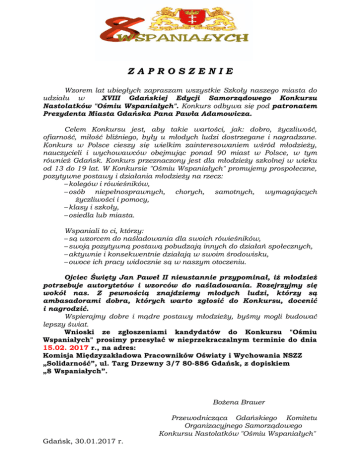 ZAPROSZENIE Wzorem lat ubiegłych zapraszam wszystkie Szkoły naszego miasta do udziału w XVIII Gdańskiej Edycji Samorządowego Konkursu Nastolatków "Ośmiu Wspaniałych". Konkurs odbywa się pod patronatem Prezydenta Miasta Gdańska Pana Pawła Adamowicza. Celem Konkursu jest, aby takie wartości, jak: dobro, życzliwość, ofiarność, miłość bliźniego, były u młodych ludzi dostrzegane i nagradzane. Konkurs w Polsce cieszy się wielkim zainteresowaniem wśród młodzieży, nauczycieli i wychowawców obejmując ponad 90 miast w Polsce, w tym również Gdańsk. Konkurs przeznaczony jest dla młodzieży szkolnej w wieku od 13 do 19 lat. W Konkursie "Ośmiu Wspaniałych" promujemy prospołeczne, pozytywne postawy i działania młodzieży na rzecz: – kolegów i rówieśników, – osób niepełnosprawnych, chorych, samotnych, wymagających życzliwości i pomocy, – klasy i szkoły, – osiedla lub miasta. Wspaniali to ci, którzy: – są wzorcem do naśladowania dla swoich rówieśników, – swoją pozytywną postawą pobudzają innych do działań społecznych, – aktywnie i konsekwentnie działają w swoim środowisku, – owoce ich pracy widocznie są w naszym otoczeniu. Ojciec Święty Jan Paweł II nieustannie przypominał, iż młodzież potrzebuje autorytetów i wzorców do naśladowania. Rozejrzyjmy się wokół nas. Z pewnością znajdziemy młodych ludzi, którzy są ambasadorami dobra, których warto zgłosić do Konkursu, docenić i nagrodzić. Wspierajmy dobre i mądre postawy młodzieży, byśmy mogli budować lepszy świat. Wnioski ze zgłoszeniami kandydatów do Konkursu "Ośmiu Wspaniałych" prosimy przesyłać w nieprzekraczalnym terminie do dnia 15.02. 2017 r., na adres: Komisja Międzyzakładowa Pracowników Oświaty i Wychowania NSZZ „Solidarność”, ul. Targ Drzewny 3/7 80-886 Gdańsk, z dopiskiem „8 Wspaniałych”. Bożena Brauer Gdańsk, 30.01.2017 r. Przewodnicząca Gdańskiego Komitetu Organizacyjnego Samorządowego Konkursu Nastolatków "Ośmiu Wspaniałych"