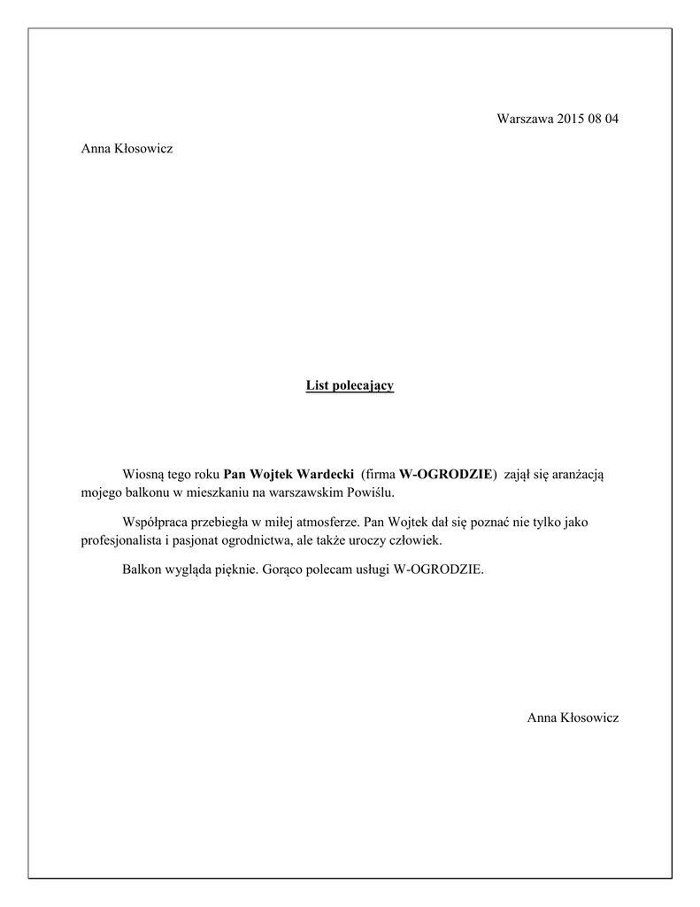 Warszawa 2015 08 04 Anna Kłosowicz List polecający Wiosną tego roku Pan Wojtek Wardecki (firma W-OGRODZIE) zajął się aranżacją mojego balkonu w mieszkaniu na warszawskim Powiślu. Współpraca przebiegła w miłej atmosferze. Pan Wojtek dał się poznać nie tylko jako profesjonalista i pasjonat ogrodnictwa, ale także uroczy człowiek. Balkon wygląda pięknie. Gorąco polecam usługi W-OGRODZIE. Anna Kłosowicz