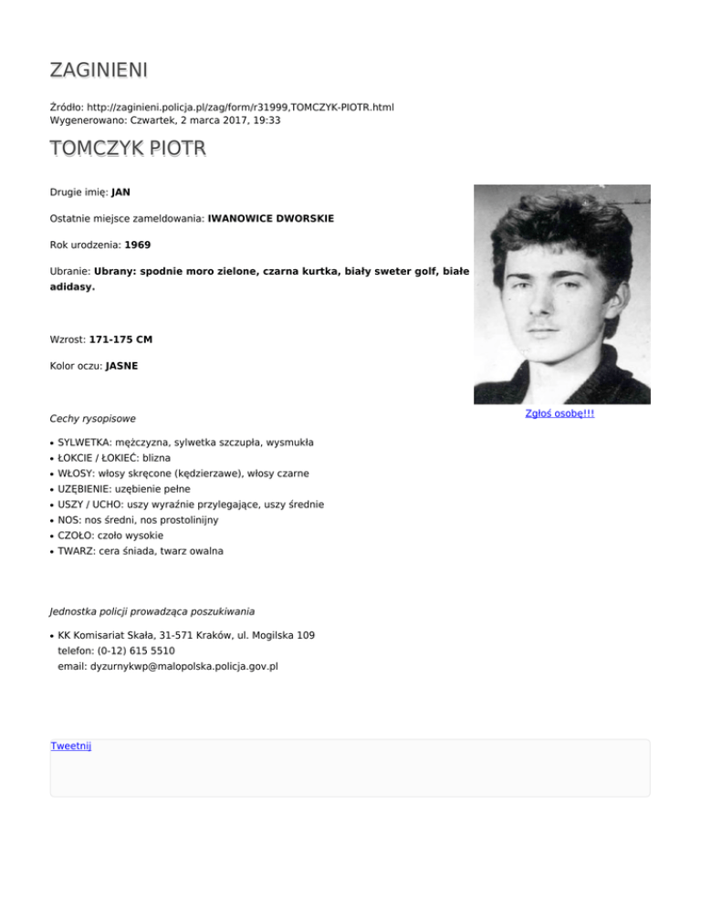 ZAGINIENI Źródło: http://zaginieni.policja.pl/zag/form/r31999,TOMCZYK-PIOTR.html Wygenerowano: Czwartek, 2 marca 2017, 19:33 TOMCZYK PIOTR Drugie imię: JAN Ostatnie miejsce zameldowania: IWANOWICE DWORSKIE Rok urodzenia: 1969 Ubranie: Ubrany: spodnie moro zielone, czarna kurtka, biały sweter golf, białe adidasy. Wzrost: 171-175 CM Kolor oczu: JASNE Cechy rysopisowe ● SYLWETKA: mężczyzna, sylwetka szczupła, wysmukła ● ŁOKCIE / ŁOKIEĆ: blizna ● WŁOSY: włosy skręcone (kędzierzawe), włosy czarne ● UZĘBIENIE: uzębienie pełne ● USZY / UCHO: uszy wyraźnie przylegające, uszy średnie ● NOS: nos średni, nos prostolinijny ● CZOŁO: czoło wysokie ● TWARZ: cera śniada, twarz owalna Jednostka policji prowadząca poszukiwania ● KK Komisariat Skała, 31-571 Kraków, ul. Mogilska 109 telefon: (0-12) 615 5510 email: [email protected] Tweetnij Zgłoś osobę!!!