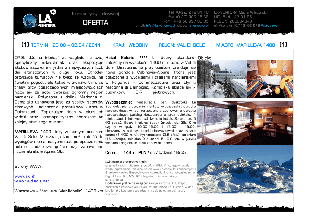 tel. (0-22) 219 61 40 fax. (0-22) 300 15 66 kom. +48 50 997 00 35 biuro turystyki aktywnej OFERTA (1) TERMIN: 26.03 – 02.04 / 2011 OPIS: „Dolina Słońca” ze względu na swój specyficzny mikroklimat oraz ekspozycje stoków szczyci się jedna z najwyższych liczb dni słonecznych w ciągu roku. Ośrodek przyciąga turystów nie tylko ze względu na świetną pogodę, ale także w związku tym, że trasy przy poszczególnych miejscowościach łączą się ze sobą tworząc ogromny region narciarski. Połączona z doliną Madonna di Campiglio uznawana jest za stolicę sportów zimowych i najbardziej prestiżowy kurort w Dolomitach. Zapierające dech w piersiach widoki oraz kosmopolityczny charakter to kolejny atut tego miejsca. email: [email protected] skype: la-ventura.pl KRAJ: WŁOCHY Hotel Solaria **** b. dobry standard: Obiekt: położony na wysokości 1400 m n.p.m. w Val di Sole. Bezpośrednio przy obiekcie znajduje się nowa gondola Cabinovia-Albare, która jest połączona z wyciągami i trasami narciarskimi w Folgarida - Commezzadura oraz słynną Madonna di Campiglio. Kompleks składa się 7 budynków, 6-7 piętrowych. Wyposazenie: restauracja, bar, dyskoteka La Scandola, piano-bar, mini market, wypożyczalnia sprzętu narciarskiego, winda, ogrzewana przechowalnia sprzętu narciarskiego, parking (bezpośrednio przy obiekcie, 1 miejsce/apt.). Internet: tak (w hallu hotelu Solaria, ok. 5 €/2 godz.). Sport i relaks: basen (gratis, ok. 25x10 m czynny w godz. 10.00-12.00 i 17.00 – 19.00, nieczynny w soboty, czepki obowiązkowe) oraz płatne: sauna (5 €/20 min.), hydromasaże (2,5 €/os.), solarium (15 €/sesja), miniclub (dla dzieci 5-10,9 lat, w języku włoskim i angielskim, sala zabaw dla dzieci. MARILLEVA 1400: lezy w samym centrum Val Di Sole. Mieszkając tam można dojść do wyciągów niemal natychmiast po opuszczeniu hotelu. Dodatkowo goście mają zapewnione liczne atrakcje Apres Ski. Cena: Strony WWW: www.ski.it www.valdisole.net Warszawa – Marilleva (ViaMichelin) 1400 km REJON: VAL DI SOLE 1445 PLN / os / tydzień / Bilo5 Świadczenia zawarte w cenie: przejazd szybkim busem 9 os.(PL-IT-PL), 7 noclegów, prąd, woda, ogrzewanie, bielizna pościelowa i ręczniki (1 zmiana/tydz.) 6-dniowy karnet Superskirama Adamello Brenta, ubezpieczenie Signal Iduna KL, NW, KR i bagażu, opieka włoskiego kontrahenta. Dodatkowo płatne na miejscu: kaucja zwrotna 150 €/apt., sprzątanie końcowe 40 €/tydz. w apt. mono i 50 €/tydz. w apt. bilo (aneks kuchenny we własnym zakresie, śmieci należy wyrzucić). LA-VENTURA Maciej Wilczynski NIP: 544-142-94-85 REGON: 200304840 ul. Atenska 10/112 03-978 Warszawa MIASTO: MARILLEVA 1400 (1) czarne: 47 km czerwone: 130 km niebieskie: 79 km Razem: 256 km