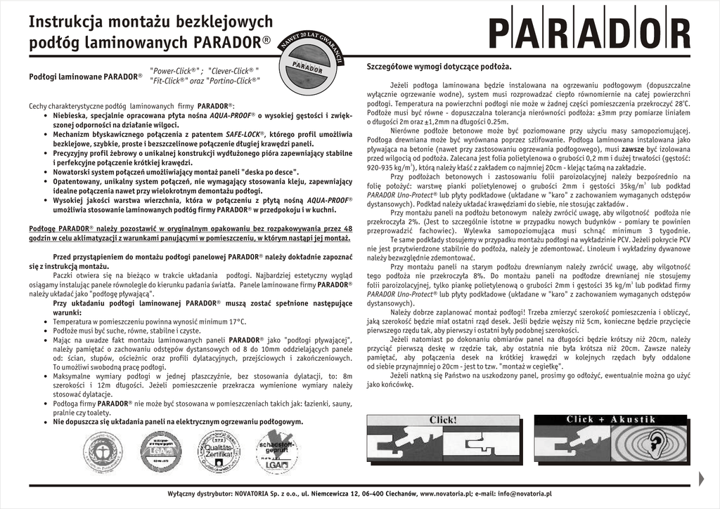 Instrukcja montażu bezklejowych podłóg laminowanych PARADOR® "Power-Click®" ; "Clever-Click® " Podłogi laminowane PARADOR® "Fit-Click®" oraz "Portino-Click®" Cechy charakterystyczne podłóg laminowanych firmy PARADOR®: Niebieska, specjalnie opracowana płyta nośna AQUA-PROOF® o wysokiej gęstości i zwiększonej odporności na działanie wilgoci. Mechanizm błyskawicznego połączenia z patentem SAFE-LOCK®, którego profil umożliwia bezklejowe, szybkie, proste i bezszczelinowe połączenie długiej krawędzi paneli. Precyzyjny profil żebrowy o unikalnej konstrukcji wydłużonego pióra zapewniający stabilne i perfekcyjne połączenie krótkiej krawędzi. Nowatorski system połączeń umożliwiający montaż paneli "deska po desce". Opatentowany, unikalny system połączeń, nie wymagający stosowania kleju, zapewniający idealne połączenia nawet przy wielokrotnym demontażu podłogi. Wysokiej jakości warstwa wierzchnia, która w połączeniu z płytą nośną AQUA-PROOF® umożliwia stosowanie laminowanych podłóg firmy PARADOR® w przedpokoju i w kuchni. Podłogę PARADOR® należy pozostawić w oryginalnym opakowaniu bez rozpakowywania przez 48 godzin w celu aklimatyzacji z warunkami panującymi w pomieszczeniu, w którym nastąpi jej montaż. Przed przystąpieniem do montażu podłogi panelowej PARADOR® należy dokładnie zapoznać się z instrukcją montażu. Paczki otwiera się na bieżąco w trakcie układania podłogi. Najbardziej estetyczny wygląd osiągamy instalując panele równolegle do kierunku padania światła. Panele laminowane firmy PARADOR® należy układać jako "podłogę pływającą". Przy układaniu podłogi laminowanej PARADOR® muszą zostać spełnione następujące warunki: Temperatura w pomieszczeniu powinna wynosić minimum 17°C. Podłoże musi być suche, równe, stabilne i czyste. Mając na uwadze fakt montażu laminowanych paneli PARADOR® jako "podłogi pływającej", należy pamiętać o zachowaniu odstępów dystansowych od 8 do 10mm oddzielających panele od: ścian, słupów, ościeżnic oraz profili dylatacyjnych, przejściowych i zakończeniowych. To umożliwi swobodną pracę podłogi. Maksymalne wymiary podłogi w jednej płaszczyźnie, bez stosowania dylatacji, to: 8m szerokości i 12m długości. Jeżeli pomieszczenie przekracza wymienione wymiary należy stosować dylatacje. Podłoga firmy PARADOR® nie może być stosowana w pomieszczeniach takich jak: łazienki, sauny, pralnie czy toalety. Nie dopuszcza się układania paneli na elektrycznym ogrzewaniu podłogowym. Szczegółowe wymogi dotyczące podłoża. Jeżeli podłoga laminowana będzie instalowana na ogrzewaniu podłogowym (dopuszczalne wyłącznie ogrzewanie wodne), system musi rozprowadzać ciepło równomiernie na całej powierzchni podłogi. Temperatura na powierzchni podłogi nie może w żadnej części pomieszczenia przekroczyć 28oC. Podłoże musi być równe - dopuszczalna tolerancja nierówności podłoża: ±3mm przy pomiarze liniałem o długości 2m oraz ±1,2mm na długości 0.25m. Nierówne podłoże betonowe może być poziomowane przy użyciu masy samopoziomującej. Podłoga drewniana może być wyrównana poprzez szlifowanie. Podłoga laminowana instalowana jako pływająca na betonie (nawet przy zastosowaniu ogrzewania podłogowego), musi zawsze być izolowana przed wilgocią od podłoża. Zalecana jest folia polietylenowa o grubości 0,2 mm i dużej trwałości (gęstość: 920-935 kg/m3), którą należy kłaść z zakładem co najmniej 20cm - klejąc taśmą na zakładzie. Przy podłożach betonowych i zastosowaniu folii paroizolacyjnej należy bezpośrednio na folię położyć: warstwę pianki polietylenowej o grubości 2mm i gęstości 35kg/m3 lub podkład PARADOR Uno-Protect® lub płyty podkładowe (układane w "karo" z zachowaniem wymaganych odstępów dystansowych). Podkład należy układać krawędziami do siebie, nie stosując zakładów . Przy montażu paneli na podłożu betonowym należy zwrócić uwagę, aby wilgotność podłoża nie przekroczyła 2%. (Jest to szczególnie istotne w przypadku nowych budynków - pomiary te powinien przeprowadzić fachowiec). Wylewka samopoziomująca musi schnąć minimum 3 tygodnie. Te same podkłady stosujemy w przypadku montażu podłogi na wykładzinie PCV. Jeżeli pokrycie PCV nie jest przytwierdzone stabilnie do podłoża, należy je zdemontować. Linoleum i wykładziny dywanowe należy bezwzględnie zdemontować. Przy montażu paneli na starym podłożu drewnianym należy zwrócić uwagę, aby wilgotność tego podłoża nie przekroczyła 8%. Do montażu paneli na podłodze drewnianej nie stosujemy folii paroizolacyjnej, tylko piankę polietylenową o grubości 2mm i gęstości 35 kg/m3 lub podkład firmy PARADOR Uno-Protect® lub płyty podkładowe (układane w "karo" z zachowaniem wymaganych odstępów dystansowych). Należy dobrze zaplanować montaż podłogi! Trzeba zmierzyć szerokość pomieszczenia i obliczyć, jaką szerokość będzie miał ostatni rząd desek. Jeśli będzie węższy niż 5cm, konieczne będzie przycięcie pierwszego rzędu tak, aby pierwszy i ostatni były podobnej szerokości. Jeżeli natomiast po dokonaniu obmiarów panel na długości będzie krótszy niż 20cm, należy przyciąć pierwszą deskę w rzędzie tak, aby ostatnia nie była krótsza niż 20cm. Zawsze należy pamiętać, aby połączenia desek na krótkiej krawędzi w kolejnych rzędach były oddalone od siebie przynajmniej o 20cm - jest to tzw. "montaż w cegiełkę". Jeżeli natkną się Państwo na uszkodzony panel, prosimy go odłożyć, ewentualnie można go użyć jako końcówkę. Wyłączny dystrybutor: NOVATORIA Sp. z o.o., ul. Niemcewicza 12, 06-400 Ciechanów, www.novatoria.pl; e-mail: [email protected] Instrukcja montażu bezklejowych podłóg laminowanych PARADOR® 1 2 3 UKŁADANIE Rys. 1 Najlepszy efekt estetyczny osiąga się układając podłogę równolegle do kierunku padania