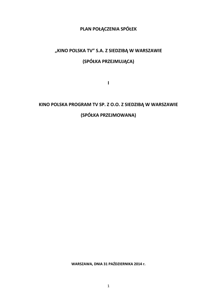 PLAN POŁĄCZENIA SPÓŁEK „KINO POLSKA TV” S.A. Z SIEDZIBĄ W WARSZAWIE (SPÓŁKA PRZEJMUJĄCA) I KINO POLSKA PROGRAM TV SP. Z O.O. Z SIEDZIBĄ W WARSZAWIE (SPÓŁKA PRZEJMOWANA) WARSZAWA, DNIA 31 PAŹDZIERNIKA 2014 r. 1 PLAN POŁĄCZENIA SPÓŁEK „Kino Polska TV” S.A. z siedzibą w Warszawie (Spółka Przejmująca) z Kino Polska Program TV Sp. z o.o. z siedzibą w Warszawie (Spółka Przejmowana) Spółki „Kino Polska TV” S.A. z siedzibą w Warszawie i Kino Polska Program TV Sp. z o.o. z siedzibą w Warszawie, działając na podstawie art. 498 oraz art. 499 Kodeksu spółek handlowych, niniejszym ustalają następujący plan połączenia: 1. Łączące się spółki „Kino Polska TV” S.A. z siedzibą w Warszawie, ul. Puławska 61, 02-595 Warszawa, wpisana do rejestru przedsiębiorców prowadzonego przez Sąd Rejonowy dla M. St. Warszawy, XIII Wydział Gospodarczy Krajowego Rejestru Sądowego pod numerem KRS 0000363674, Kino Polska Program TV Sp. z o.o. z siedzibą w Warszawie, ul. Puławska 435A 02-801 Warszawa, wpisana do rejestru przedsiębiorców prowadzonego przez Sąd Rejonowy dla miasta stołecznego Warszawy, XIII Wydział Gospodarczy Krajowego Rejestru Sądowego pod numerem KRS 0000521453. 2. Sposób łączenia Połączenie spółek dokonywane jest na podstawie art. 492 § 1 pkt 1 Kodeksu spółek handlowych poprzez przeniesienie całego majątku spółki Kino Polska Program TV Sp. z o.o. do spółki „Kino Polska TV” S.A. W wyniku połączenia Spółka Przejmowana przestanie istnieć. Ponieważ 100% udziałów Spółki Przejmowanej należy do Spółki Przejmującej, połączenie nastąpi zgodnie z art. 516 § 6 Kodeksu spółek handlowych przy zastosowaniu przepisów regulujących uproszczoną procedurę łączenia, tj.: a. b. plan połączenia nie zostanie poddany badaniu przez biegłego, nie dojdzie do podwyższenia kapitału zakładowego Spółki Przejmującej. Zgodnie z art. 506 § 1 oraz art. 516 § 6 Kodeksu spółek handlowych połączenie Spółek nastąpi na mocy uchwał Walnego Zgromadzenia Spółki Przejmującej i Zgromadzenia Wspólników Spółki Przejmowanej, wyrażających zgodę na plan połączenia Spółek. Zgodnie z art. 494 § 1 Kodeksu spółek handlowych Spółka Przejmująca wstąpi z dniem połączenia we wszystkie prawa i obowiązki Spółki Przejmowanej. Z dniem zarejestrowania połączenia Spółki Przejmującej ze Spółką Przejmowaną, Spółka Przejmowana zostanie wykreślona z Rejestru Przedsiębiorców Krajowego Rejestru Sądowego w trybie art. 493 § 1 Kodeksu spółek handlowych. 3. Stosunek wymiany udziałów Spółki Przejmowanej na akcje Spółki Przejmującej, zasady dotyczące przyznania akcji Spółki Przejmującej oraz dzień, od którego przyznane akcje uprawniają do udziału w zysku Spółki Przejmującej 2 Z uwagi na fakt, iż Spółka Przejmująca posiada 100% udziałów w Spółce Przejmowanej, w wyniku połączenia nie dojdzie do wymiany udziałów Spółki Przejmowanej na akcje Spółki Przejmującej. W związku z powyższym, w niniejszym Planie Połączenia nie wskazuje się stosunku wymiany udziałów Spółki Przejmowanej na akcje Spółki Przejmującej, zasad dotyczących przyznania akcji Spółki Przejmującej, ani też dnia, od którego przyznane akcje uprawniają do udziału w zysku Spółki Przejmującej. 4. Prawa przyznane przez Spółkę Przejmującą wspólnikom oraz osobom szczególnie uprawnionym w Spółce Przejmowanej W Spółce Przejmującej nie występują szczególnie uprawnieni wspólnicy ani inne osoby o szczególnych uprawnieniach. W związku z połączeniem, Spółka Przejmująca nie przyzna praw ani szczególnych uprawnień wspólnikom ani innym osobom w Spółce Przejmowanej. 5. Szczególne korzyści dla członków organów łączących się spółek lub dla innych osób uczestniczących w połączeniu W związku z połączeniem, Spółka Przejmująca nie przyzna żadnych szczególnych korzyści ani członkom organów łączących się spółek ani innym osobom uczestniczącym w połączeniu. Ponadto w związku z tym, iż przedmiot działalności Spółki Przejmującej ujęty w statucie tej spółki obejmuje dotychczasowy zakres działalności Spółki Przejmowanej, nie występuje konieczność dokonywania zmian Statutu Spółki Przejmującej. Jednocześnie w związku z faktem, iż Spółka Przejmująca jest spółką publiczną publikującą i udostępniającą półroczne sprawozdanie finansowe akcjonariuszom, na podstawie art. 499 § 4 Kodeksu spółek handlowych i zgodnie z przepisami o ofercie publicznej i warunkach wprowadzania instrumentów finansowych do zorganizowanego systemu obrotu oraz o spółkach publicznych publikuje i udostępnia akcjonariuszom półroczne sprawozdania finansowe, Spółka ta nie jest zobowiązana do sporządzenia oświadczenia zawierającego informację o stanie księgowym sporządzoną dla celów połączenia, o którym mowa w art. 499 §2 pkt 4 Kodeksu spółek handlowych. Ponadto zgodnie z regulacją art. 14 pkt. 5 ustawy z dnia 16 lutego 2007 roku o ochronie konkurencji i konsumentów (Dz. U. 2007, nr 50, poz. 331 z późn. zm.) połączenie przez przejęcie Spółki Przejmowanej przez Spółkę Przejmującą nie podlega zgłoszeniu zamiaru koncentracji Prezesowi Urzędu Ochrony Konkurencji i Konsumentów, gdyż spółki łączące się należą do tej samej Grupy Kapitałowej. Zgodnie z art. 499 § 2 Kodeksu spółek handlowych do Planu Połączenia załącza się następujące dokumenty: 1) projekt uchwały Nadzwyczajnego Zgromadzenia Wspólników Kino Polska Program TV Sp. z o.o. o połączeniu spółek (Załącznik Nr 1), 2) projekt uchwały Nadzwyczajnego Walnego Zgromadzenia Akcjonariuszy „Kino Polska TV” S.A. o połączeniu spółek (Załącznik Nr 2), 3 3) ustalenie wartości majątku spółki Kino Polska Program TV Sp. z o.o. na dzień 1 września 2014 roku (Załącznik Nr 3), 4) oświadczenie zawierające informację o stanie księgowym 