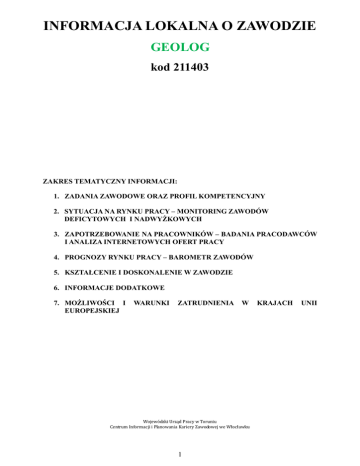 INFORMACJA LOKALNA O ZAWODZIE GEOLOG kod 211403 ZAKRES TEMATYCZNY INFORMACJI: 1. ZADANIA ZAWODOWE ORAZ PROFIL KOMPETENCYJNY 2. SYTUACJA NA RYNKU PRACY – MONITORING ZAWODÓW DEFICYTOWYCH I NADWYŻKOWYCH 3. ZAPOTRZEBOWANIE NA PRACOWNIKÓW – BADANIA PRACODAWCÓW I ANALIZA INTERNETOWYCH OFERT PRACY 4. PROGNOZY RYNKU PRACY – BAROMETR ZAWODÓW 5. KSZTAŁCENIE I DOSKONALENIE W ZAWODZIE 6. INFORMACJE DODATKOWE 7. MOŻLIWOŚCI I EUROPEJSKIEJ WARUNKI ZATRUDNIENIA W Wojewódzki Urząd Pracy w Toruniu Centrum Informacji i Planowania Kariery Zawodowej we Włocławku 1 KRAJACH UNII 1. ZADANIA ZAWODOWE ORAZ PROFIL KOMPETENCYJNY Geolog (kod 211403) to jeden z 2443 zawodów ujętych w obowiązującej od 1 stycznia 2015 r. klasyfikacji zawodów i specjalności na potrzeby rynku pracy (DZ.U. z 2014 r. poz. 1145). Geolog prowadzi badania podstawowe dotyczące budowy, własności i historii Ziemi, procesów zachodzących w jej wnętrzu i na powierzchni powodujących jej przeobrażenia lub stosuje w praktyce wiedzę naukową z tego zakresu w takich dziedzinach, jak: wydobycie surowców naturalnych, wykorzystanie wód, inżynieria lądowa i wodna, ochrona środowiska itp. Zadania zawodowe: • nadzorowanie materiałów archiwalnych w państwowych jednostkach organizacyjnych; • prowadzenie badań oraz ulepszanie lub opracowywanie koncepcji, teorii i metod działania w zakresie geologii podstawowej (geologii dynamicznej, historycznej, regionalnej, strukturalnej, sedymentologii, stratygrafii, geochemii, mineralogii, petrografii) oraz geologii stosowanej (geologii złóż, geologii inżynierskiej i środowiskowej, hydrogeologii); • badanie składu i struktury skorupy ziemskiej, badanie skał, minerałów, skamieniałości itp. w celu opisania rozwoju Ziemi i świata organicznego w przeszłości geologicznej oraz ustalenia charakteru i chronologii formacji geologicznych; • przedstawianie budowy geologicznej skorupy ziemskiej w postaci map i planów geologicznych, przekrojów geologicznych oraz innych form wyników obserwacji i interpretacji zjawisk geologicznych; • wyszukiwanie, badanie, ocena i udostępnianie złóż surowców mineralnych, gazu i ropy naftowej oraz podziemnych zasobów wód; • badanie środowiska geologicznego, jego zmienności i ewolucji dla potrzeb planowania przestrzennego i regionalnego, projektowania, wykonawstwa i eksploatacji obiektów budowlanych (mieszkaniowych, przemysłowych, infrastruktury publicznej) oraz ochrony środowiska; • dokumentowanie prowadzonych badań, przygotowywanie referatów naukowych i raportów; • wykonywanie zadań pokrewnych; • nadzorowanie innych pracowników 1. Profil kompetencyjny2 dla grupy dużej Specjaliści nauk fizycznych, matematycznych i technicznych - kod 213 Specjaliści nauk fizycznych, matematycznych i technicznych prowadzą badania, ulepszają lub opracowują nowe koncepcje, teorie i metody operacyjne lub stosują w praktyce 1 Wortal Publicznych Służb Zatrudnienia http://psz.praca.gov.pl/rynek-pracy/bazy-danych/klasyfikacja-zawodow-i-specjalnosci/wyszukiwarka-opisow- zawodow 2 NBK Narzędzie do badania kompetencji. Podręcznik dla doradców zawodowych. Warszawa, 2014 Rozporządzenie Ministra Pracy i Polityki Społecznej z dnia 7.08.2014r. w sprawie klasyfikacji zawodów i specjalności na potrzeby rynku pracy oraz zakresu jej stosowania (Dz. U. 2014 poz. 1145). 3 2 wiedzę naukową z takich dziedzin jak: fizyka, astronomia, meteorologia,, chemia, geofizyka,, geologia, matematyka, statystyka, informatyka, architektura, inżynieria i technologia.4. Przykładowe zawody: fizycy i astronomowie, meteorolodzy, chemicy, matematycy, ,inżynierowie budownictwa, inżynier telekomunikacji, inżynierowie ochrony środowiska, inżynierowie mechanicy, specjaliści nauk o ziemi geolog, hydrolog. Kompetencje to cechy osoby, które przejawiają się w działaniach prowadzących do wykonywania zadań zawodowych na wymaganym poziomie oraz w zachowaniach przekładających się na konkretne efekty, dzięki czemu są obserwowalne, podlegają rozwojowi poprzez szkolenia oraz nabyte doświadczenia w realizacji określonych zadań. Dla grupy Specjaliści nauk fizycznych, matematycznych i technicznych określono cztery kluczowe kompetencje: 1) Zdolności analityczne i podejmowanie decyzji – rozumienie złożonych sytuacji i relacji zachodzących pomiędzy różnymi elementami. Analizowanie informacji i danych, dostrzeganie zależności, wyciąganie na ich podstawie wniosków i podejmowanie trafnych decyzji. 2) Sumienność w dążeniu do rezultatów - wysoka efektywność realizacji zadań w ściśle określonym terminie i z należytą starannością, uwzględniającą własne kompetencje i możliwości. Determinacja w działaniu i osiąganie zakładanych rezultatów przez utrzymywanie odpowiedniego tempa oraz jakości pracy, nawet w obliczu trudności. 3) Gotowość- do podnoszenia kwalifikacji - Otwartość na wiedzę i na zadania umożliwiające jej zdobycie. Wykorzystywanie napotkanych problemów jako okazji do rozwoju. Chęć eksperymentowania i podejmowania nowych zadań. Staranna analiza sukcesów i porażek oraz traktowanie tych drugich jako cennej lekcji. 4) Obsługa komputera i wykorzystanie Internetu - Korzystanie z dostępnych urządzeń technicznych (np. komputerów, drukarek, skanerów) i aplikacji komputerowych do usprawnienia realizacji zadań. Swobodne przeglądanie stron internetowych w celu szybkiego dotarcia do informacji przydatnych ze względu na wykonywane obowiązki. Skuteczne wyszukiwanie w sieci potrzebnych wiadomości, formułowanie poleceń wyszukiwania w taki sposób, aby zapewniały szybkie dotarcie do źródeł na odpowiednim poziomie merytorycznym, bez konieczności sprawdzania przypadkowych rezultatów wyszukiwania. 2. SYTUACJA NA RYNKU PRACY – MONITORING ZAWODÓW DEFICYTOWYCH I NADWYŻKOWYCH W I półroczu 2016 roku w ewidencji powiatowych urzędów pracy w województwie kujawsko-pomorskim odnotowano 11 nowych rejest