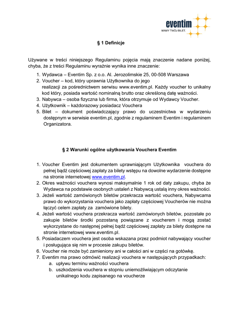 § 1 Definicje Używane w treści niniejszego Regulaminu pojęcia mają znaczenie nadane poniżej, chyba, że z treści Regulaminu wyraźnie wynika inne znaczenie: 1. Wydawca – Eventim Sp. z o.o. Al. Jerozolimskie 25, 00-508 Warszawa 2. Voucher – kod, który uprawnia Użytkownika do jego realizacji za pośrednictwem serwisu www.eventim.pl. Każdy voucher to unikalny kod który, posiada wartość nominalną brutto oraz określoną datę ważności. 3. Nabywca – osoba fizyczna lub firma, która otrzymuje od Wydawcy Voucher. 4. Użytkownik – każdorazowy posiadacz Vouchera 5. Bilet – dokument poświadczający prawo do uczestnictwa w wydarzeniu dostępnym w serwisie eventim.pl, zgodnie z regulaminem Eventim i regulaminem Organizatora. § 2 Warunki ogólne użytkowania Vouchera Eventim 1. Voucher Eventim jest dokumentem uprawniającym Użytkownika vouchera do pełnej bądź częściowej zapłaty za bilety wstępu na dowolne wydarzenie dostępne na stronie internetowej www.eventim.pl. 2. Okres ważności vouchera wynosi maksymalnie 1 rok od daty zakupu, chyba że Wydawca na podstawie osobnych ustaleń z Nabywcą ustalą inny okres ważności. 3. Jeżeli wartość zamówionych biletów przekracza wartość vouchera, Nabywcama prawo do wykorzystania vouchera jako zapłaty częściowej Voucherów nie można łączyć celem zapłaty za zamówione bilety. 4. Jeżeli wartość vouchera przekracza wartość zamówionych biletów, pozostałe po zakupie biletów środki pozostaną powiązane z voucherem i mogą zostać wykorzystane do następnej pełnej bądź częściowej zapłaty za bilety dostępne na stronie internetowej www.eventim.pl. 5. Posiadaczem vouchera jest osoba wskazana przez podmiot nabywający voucher i posługująca się nim w procesie zakupu biletów. 6. Voucher nie może być zamieniony ani w całości ani w części na gotówkę. 7. Eventim ma prawo odmówić realizacji vouchera w następujących przypadkach: a. upływu terminu ważności vouchera b. uszkodzenia vouchera w stopniu uniemożliwiającym odczytanie unikalnego kodu zapisanego na voucherze c. braku technicznej możliwości realizacji vouchera, w szczególności w przypadku nieuzyskania połączenia z systemem informatycznym Wydawcy. 8. W przypadku odwołania wydarzenia, na które nabywca zakupił bilet za pomocą vouchera, Eventim zobowiązuje się do uzupełnienia wartości vouchera o wartość, na którą opiewał bilet na odwołane wydarzenie. Jeżeli termin ważności vouchera upłynął, Eventim przedłuży jego ważność lub przekaże użytkownikowi nowy voucher tej samej wartości, którego czas realizacji upłynie w terminie do 30 dni od daty jego wydania Klientowi. § 3 Postanowienia końcowe 1. Eventim nie ponosi odpowiedzialności za vouchery, które zostały skradzione bądź uszkodzone. 2. Posiadacz vouchera zobowiązany jest do zachowania vouchera do czasu, kiedy odbywa się wydarzenie, na które za pomocą vouchera zakupiony został bilet. 3. Eventim zastrzega sobie prawo do zmiany regulaminu użytkowania Voucherów. 4. Za oryginalne i ważne uznaje się tylko i wyłącznie vouchery zakupione poprzez portal internetowy Eventim.pl. 5. Odsprzedaż lub próba odsprzedaży unieważnia voucher bez zwrotu należności poniesionych z tytułu jego zakupu.