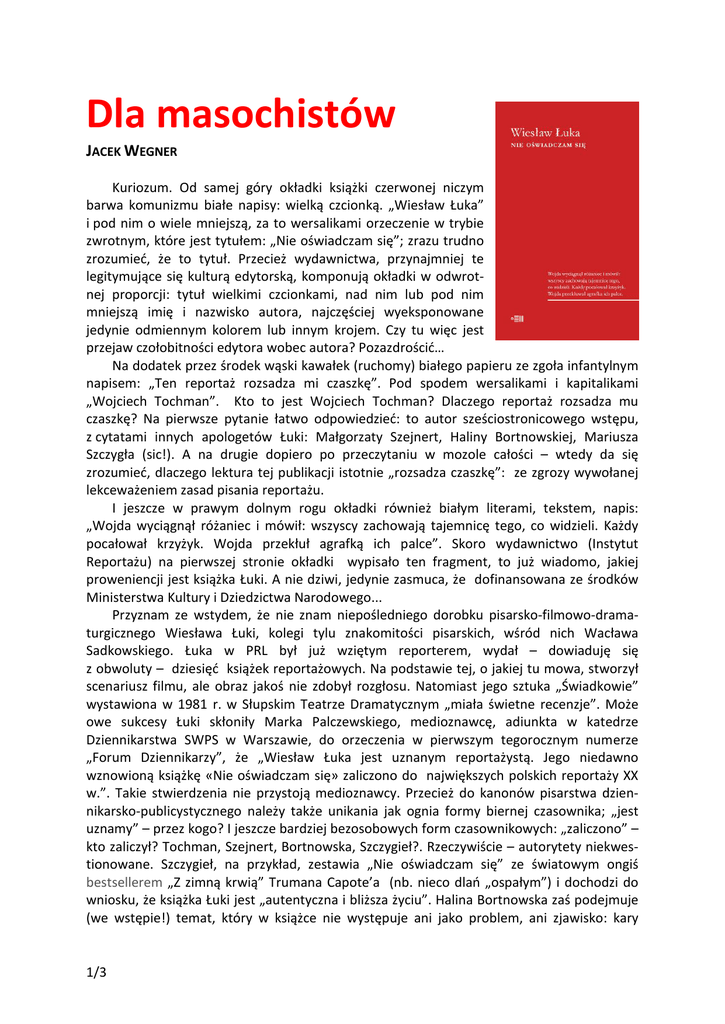 Dla masochistów JACEK WEGNER Kuriozum. Od samej góry okładki książki czerwonej niczym barwa komunizmu białe napisy: wielką czcionką. „Wiesław Łuka” i pod nim o wiele mniejszą, za to wersalikami orzeczenie w trybie zwrotnym, które jest tytułem: „Nie oświadczam się”; zrazu trudno zrozumieć, że to tytuł. Przecież wydawnictwa, przynajmniej te legitymujące się kulturą edytorską, komponują okładki w odwrotnej proporcji: tytuł wielkimi czcionkami, nad nim lub pod nim mniejszą imię i nazwisko autora, najczęściej wyeksponowane jedynie odmiennym kolorem lub innym krojem. Czy tu więc jest przejaw czołobitności edytora wobec autora? Pozazdrościć… Na dodatek przez środek wąski kawałek (ruchomy) białego papieru ze zgoła infantylnym napisem: „Ten reportaż rozsadza mi czaszkę”. Pod spodem wersalikami i kapitalikami „Wojciech Tochman”. Kto to jest Wojciech Tochman? Dlaczego reportaż rozsadza mu czaszkę? Na pierwsze pytanie łatwo odpowiedzieć: to autor sześciostronicowego wstępu, z cytatami innych apologetów Łuki: Małgorzaty Szejnert, Haliny Bortnowskiej, Mariusza Szczygła (sic!). A na drugie dopiero po przeczytaniu w mozole całości – wtedy da się zrozumieć, dlaczego lektura tej publikacji istotnie „rozsadza czaszkę”: ze zgrozy wywołanej lekceważeniem zasad pisania reportażu. I jeszcze w prawym dolnym rogu okładki również białym literami, tekstem, napis: „Wojda wyciągnął różaniec i mówił: wszyscy zachowają tajemnicę tego, co widzieli. Każdy pocałował krzyżyk. Wojda przekłuł agrafką ich palce”. Skoro wydawnictwo (Instytut Reportażu) na pierwszej stronie okładki wypisało ten fragment, to już wiadomo, jakiej proweniencji jest książka Łuki. A nie dziwi, jedynie zasmuca, że dofinansowana ze środków Ministerstwa Kultury i Dziedzictwa Narodowego... Przyznam ze wstydem, że nie znam niepośledniego dorobku pisarsko-filmowo-dramaturgicznego Wiesława Łuki, kolegi tylu znakomitości pisarskich, wśród nich Wacława Sadkowskiego. Łuka w PRL był już wziętym reporterem, wydał – dowiaduję się z obwoluty – dziesięć książek reportażowych. Na podstawie tej, o jakiej tu mowa, stworzył scenariusz filmu, ale obraz jakoś nie zdobył rozgłosu. Natomiast jego sztuka „Świadkowie” wystawiona w 1981 r. w Słupskim Teatrze Dramatycznym „miała świetne recenzje”. Może owe sukcesy Łuki skłoniły Marka Palczewskiego, medioznawcę, adiunkta w katedrze Dziennikarstwa SWPS w Warszawie, do orzeczenia w pierwszym tegorocznym numerze „Forum Dziennikarzy”, że „Wiesław Łuka jest uznanym reportażystą. Jego niedawno wznowioną książkę «Nie oświadczam się» zaliczono do największych polskich reportaży XX w.”. Takie stwierdzenia nie przystoją medioznawcy. Przecież do kanonów pisarstwa dziennikarsko-publicystycznego należy także unikania jak ognia formy biernej czasownika; „jest uznamy” – przez kogo? I jeszcze bardziej bezosobowych form czasownikowych: „zaliczono” – kto zaliczył? Tochman, Szejnert, Bortnowska, Szczygieł?. Rzeczywiście – autorytety niekwestionowane. Szczygieł, na przykład, zestawia „Nie oświadczam się” ze światowym ongiś bestsellerem „Z zimną krwią” Trumana Capote’a (nb. nieco dlań „ospałym”) i dochodzi do wniosku, że książka Łuki jest „autentyczna i bliższa życiu”. Halina Bortnowska zaś podejmuje (we wstępie!) temat, który w książce nie występuje ani jako problem, ani zjawisko: kary 1/3 śmierci. Albowiem dwaj z czterech zabójców zostali w PRL powieszeni. Bortnowska jest przeciwna tej karze: „mając teksty religijne, które bardzo dużo mówią o naprawieniu, uczymy o Bogu, po którym mamy spodziewać się strasznej odpłaty. A można wychowywać religijnie, ale zgodnie z ewolucją, którą przeszedł monoteizm”. W tych kręgach, do których należą wszyscy wymienieni powyżej autorzy, wciąż wygłasza się komunały o ewoluowaniu religii, czyli katolicyzmu, bo on w Polsce od tysiąca lat absolutnie dominuje, a ewolucja w „religii monoteistycznej” znaczy dla głosicieli owych stereotypów rozluźnienie rygorów, aby to, co jest w Dekalogu i nauce dwutyciącletniego nauczania Kościoła zabronione, stało się dozwolone, co nakazane – nie obowiązywało. I w takim celu to t u t aj Bortnowska napisała. Lecz jakie to ma odniesienie do treści reportażu? Wstęp Tochmana jest jednak bardzo przydatny – staje się kluczem do rozumienia tej książki. Jest tak samo niewyważony i niezborny jak ona. Wojciech Tochman mimowiednie ją więc demaskuje, pisze mianowicie, że to „opowieść, która nieustannie wrze brawurowym językiem, bulgocze i kipi od imion, nazwisk, tysięcy szczegółów, wypowiedzi niekoniecznie na zasadniczy temat”. Nader celne spostrzeżenia, pogratulować. Dokonanie Łuki nie jest reportażem, w ogóle nie należy do dziennikarstwa. Pierwszą czynnością dziennikarsko-publicystyczną po zebraniu materiałów do obmyślonego tematu jest s e l e k c j a faktów i zjawisk. Przecież, przepraszam za truizm, nie można pisać ani mówić o wszystkim. Tak postępują jedynie grafomani lub zaczynający naukę adepci naszego zawodu. A Łuka. przytacza fragmenty setek rozmów z zabójcami, ich sąsiadami i świadkami morderstwa w prymitywnym języku, jakiego używają. Lub przepisuje, chyba bez żadnych zmian, zapisy stenograficzne czy nagrania magnetofonowe, przytacza rozwlekłe, przez to statyczne, nudne, konwersacje z prawnikami uczestniczącymi w procesie, z księżmi. Pisze o historii Połańca powstałego w 1264 r., opodal którego, we wsi Zrębina, czterech mężczyzn zamordowało na oczach kilkudziesięciu ludzi w Wigilię 1976 r. trzyosobową rodzinę etc., etc. I to wszystko bez ładu i składu. Konia z rzędem, kto dostrzeże w książce Łuki jakąś koncepcję kompozycyjną, jakiś zamysł konstrukcyjny, jakąś myśl przewodnią. Dziesiątki, a może i setki ew