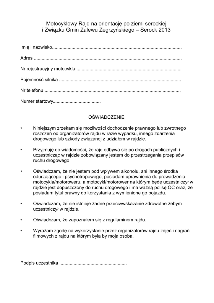 Motocyklowy Rajd na orientację po ziemi serockiej i Związku Gmin Zalewu Zegrzyńskiego – Serock 2013 Imię i nazwisko.................................................................................................... Adres .................................................................................................................. Nr rejestracyjny motocykla ................................................................................. Pojemność silnika .............................................................................................. Nr telefonu ......................................................................................................... Numer startowy..................................... OŚWIADCZENIE ∗ Niniejszym zrzekam się możliwości dochodzenie prawnego lub zwrotnego roszczeń od organizatorów rajdu w razie wypadku, innego zdarzenia drogowego lub szkody związanej z udziałem w rajdzie. ∗ Przyjmuję do wiadomości, że rajd odbywa się po drogach publicznych i uczestnicząc w rajdzie zobowiązany jestem do przestrzegania przepisów ruchu drogowego ∗ Oświadczam, że nie jestem pod wpływem alkoholu, ani innego środka odurzającego i psychotropowego, posiadam uprawnienia do prowadzenia motocykla/motoroweru, a motocykl/motorower na którym będę uczestniczył w rajdzie jest dopuszczony do ruchu drogowego i ma ważną polisę OC oraz, że posiadam tytuł prawny do korzystania z wymienione go pojazdu. ∗ Oświadczam, że nie istnieje żadne przeciwwskazanie zdrowotne żebym uczestniczył w rajdzie. ∗ Oświadczam, że zapoznałem się z regulaminem rajdu. ∗ Wyrażam zgodę na wykorzystanie przez organizatorów rajdu zdjęć i nagrań filmowych z rajdu na którym była by moja osoba. Podpis uczestnika ....................................................