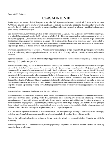 Sygn. akt III Ca 66/13 UZASADNIENIE Zaskarżonym wyrokiem z dnia 8 listopada 2013 roku Sąd Rejonowy w Łowiczu zasądził od (...) S.A. w W. na rzecz A. C. kwotę 40.000 złotych z ustawowymi odsetkami od dnia 18 października 2012 roku do dnia zapłaty oraz kwotę 1.933,60 złotych tytułem zwrotu kosztów procesu, oddalił powództwo w pozostałym zakresie i orzekł o nieuiszczonych przez strony kosztach sądowych. Sąd Rejonowy ustalił, że w dniu 2 grudnia 2003r. w miejscowości O., gm. B., woj. (...) doszło do wypadku drogowego, w wyniku którego śmierć poniósł E. C. – ojciec powódki. J. K. - kierujący samochodem ciężarowym marki M. (...) o nr rejestracyjnym (...), umyślnie naruszył zasady bezpieczeństwa w ruchu lądowym w ten sposób, że po uprzednim dostrzeżeniu idącego prawym poboczem pieszego - E. C. nieuważnie obserwował przedpole jazdy i nie podjął w porę manewrów hamowania i zmiany toru ruchu samochodu, czym doprowadził do jego potrącenia. W wyniku tego wypadku 58- letni E. C. doznał obrażeń ciała skutkujących zgonem. Wyrokiem Sądu Rejonowego w Łowiczu II Wydział Karny z dnia 14 lipca 2004 r. sygn. akt II K 48/04 sprawca wypadku – J. K. został uznany winnym popełnienia czynu z art.177 § 2 k.k. i skazany na karę 1 roku i 3 miesięcy pozbawienia wolności. Sprawca zdarzenia – J. K. w chwili zdarzenia był objęty ubezpieczeniem odpowiedzialności cywilnej na mocy umowy zawartej z (...) Spółka Akcyjna w W.. Powódka ma obecnie 39 lat, zaś w dacie śmierci ojca miała 29 lat. Powódka była emocjonalnie związana ze zmarłym ojcem E. C.. E. C. był dobrym ojcem. To on zawsze stawał w jej obronie, pomagał odrabiać lekcje języka polskiego i matematyki, w zajęciach praktyczno- technicznych. Kupił jej pierwszy rower, na którym nauczył jeździć. Kupował buty. Uczestniczył w najważniejszych momentach życia powódki. Osobiście z powódką składał dokumenty do szkoły zawodowej. Był na rozpoczęciu roku szkolnego, kiedy to A. C. rozpoczęła edukację w (...) Szkole Zawodowej w Ł.. Co niedzielę, zawoził ją wieczorem do internatu w Ł., wracał w poniedziałek. Cała rodzina wspólnie spędzała Święta Bożego Narodzenia, Wielkanocy. Razem wyjeżdżali do babci. Po ukończeniu szkoły zasadniczej, powódka za namową ojca rozpoczęła naukę w Technikum Włókienniczym. Po jej ukończeniu wróciła i zamieszkała ponownie w domu, gdzie wspólnie z ojcem i pozostałą rodziną prowadziła gospodarstwo rolne. Wszyscy wspólnie zajęli się hodowlą roślin i zwierząt. E. C. miał plany. Zamierzał zbudować dom dla całej rodziny. Nagła śmierć ojca spowodowała zmianę jej życia. Bardzo przeżyła jego śmierć, która była tragiczna i niespodziewana. Powódka odczuwała szok i pustkę, wielki ból, cierpienie, żal i tęsknotę. Po powzięciu informacji o wypadku samochodowym, który miał miejsce niedaleko jej domu, wyszła na drogę. Gdy zbliżyła się do miejsca zdarzenia, w rowie zobaczyła leżącego ojca. Dopóki nie przyjechało pogotowie trzymała go za rękę. Cała rodzina mocno przeżyła śmierć ojca. Pojawił się lament i lęk o przyszłość, jak sobie poradzą bez ojca i męża, który dbał o całe gospodarstwo i rodzinę. Nikt z członków rodziny nie mógł uwierzyć, że E. C. zginął tragicznie. A. C. po śmierci ojca nadal mieszka w domu rodzinnym. Nie założyła swojej rodziny. Często wspomina zmarłego, tęskni za nim. Śmierć ojca spowodowała, iż powódka od tamtej chwili musiała liczyć tylko na siebie. Przez 5 lat codziennie chodziła na grób ojca. Ojciec często się jej śni, co przynosi jej ulgę. Zdarzały się niekiedy koszmary. Powódka, po śmierci E. C. nie korzystała z pomocy psychologa. Krępowała się udać do lekarza, aby nikt nie uznał jej za osobę chorą psychicznie. Badania psychologiczne przeprowadzone u powódki wykazały, że nagła śmierć ojca spowodowała reakcję na ciężki stres tj. poczucie starty, pustki, krzywdy, osamotnienia, brak poczucia bezpieczeństwa, koszmarne sny. Spowodowała znaczącą zmianę sytuacji życiowej, co do której powódka musiała się adoptować. Wpłynęła na reorganizację jej życia codziennego w wykonywaniu obowiązków rodzinnych i zawodowych. Zaburzenia natury emocjonalnej powódki miały charakter przejściowy i nasilone trwały przez kilka miesięcy. Bezpośrednio po śmierci ojca nie wymagała ona leczenia psychiatrycznego. Potrzebowała zaś wsparcia psychologicznego, co pomogłoby w przeżywaniu żałoby. Powódka pismem z dnia 17.09.2012 roku zgłosiła wobec strony pozwanej roszczenie o zapłatę kwoty 70.000 zł tytułem zadośćuczynienia. Pozwany decyzją z dnia 19.09.2012 roku odmówił wypłaty zadośćuczynienia uzasadniając to brakiem podstawy prawnej zgłoszonego roszczenia. Przy powyższych ustaleniach faktycznych Sąd Rejonowy ocenił, że powództwo jest usprawiedliwione co do zasady. Co do zasadności żądania zadośćuczynienia za krzywdę spowodowaną śmiercią osoby bliskiej, która nastąpiła przed datą wejścia w życie przepisów art. 446 § 4 k.c., Sąd Rejonowy uznał, iż zerwanie więzi emocjonalnych z osobą bliską na skutek śmierci spowodowanej czynem niedozwolonym stanowi naruszenie dobra osobistego i może być dochodzone na podstawie art. 448 k.c.. Zgodnie z treścią art. 24 § 1 kc ten, czyje dobro osobiste zostaje zagrożone cudzym działaniem, może żądać zaniechania tego działania, chyba że nie jest ono bezprawne. Na zasadach przewidzianych w kodeksie może on również żądać zadośćuczynienia pieniężnego lub zapłaty odpowiedniej sumy pieniężnej na wskazany cel społeczny. Paragraf 2 powołanego przepisu odsyła natomiast do zasad ogólnych w zakresie żądania naprawienia szkody majątkowej wynikającej z naruszenia dóbr osobistych. Wskazanie przez powódkę w żądaniu pozwu swojego roszczenia ograniczonego do zapłaty zadośćuczynienia, zgodnie z art. 2