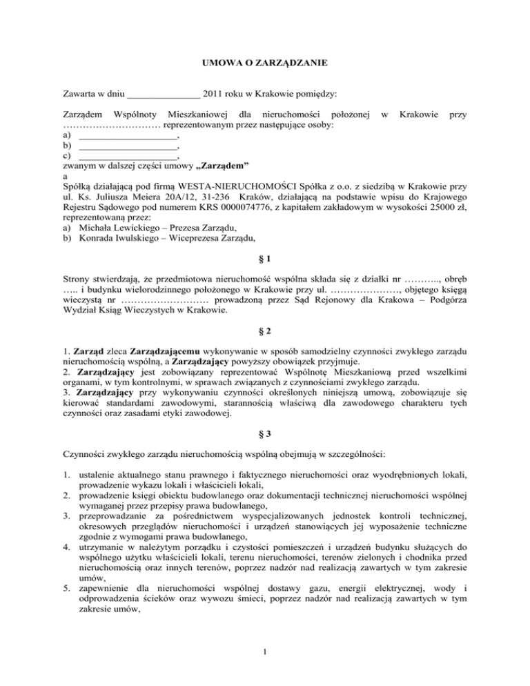UMOWA O ZARZĄDZANIE Zawarta w dniu 2011 roku w Krakowie