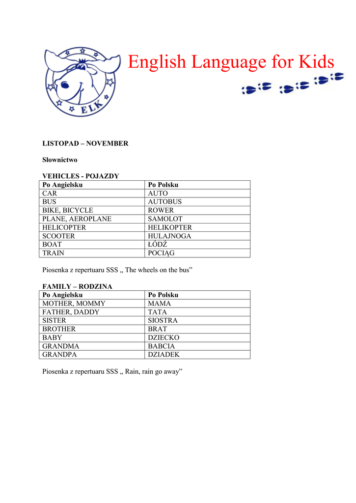 English Language for Kids LISTOPAD – NOVEMBER Słownictwo VEHICLES - POJAZDY Po Angielsku CAR BUS BIKE, BICYCLE PLANE, AEROPLANE HELICOPTER SCOOTER BOAT TRAIN Po Polsku AUTO AUTOBUS ROWER SAMOLOT HELIKOPTER HULAJNOGA ŁÓDŹ POCIĄG Piosenka z repertuaru SSS „ The wheels on the bus” FAMILY – RODZINA Po Angielsku MOTHER, MOMMY FATHER, DADDY SISTER BROTHER BABY GRANDMA GRANDPA Po Polsku MAMA TATA SIOSTRA BRAT DZIECKO BABCIA DZIADEK Piosenka z repertuaru SSS „ Rain, rain go away” HOUSE - DOM Po Angielsku KITCHEN LIVING ROOM DINING ROOM BEDROOM BATHROOM HALL STUDY GARAGE GARDEN PANTRY Po Polsku KUCHNIA SALON JADALNIA SYPIALNIA ŁAZIENKA KORYTARZ GABINET GARAŻ OGRÓD SPIŻARNIA FURNITURE -MEBLE Po Angielsku TABLE DESK CHAIR BED FRIDGE COOKER SOFA SHOWER BATH CARPET WARDROBE Po Polsku STÓŁ BIURKO KRZESŁO ŁÓŻKO LODÓWKA KUCHENKA KANAPA PRYSZNIC WANNA DYWAN SZAFA TOYS - ZABAWKI Po Angielsku TRAIN TEDDY BEAR CAR DOLL ROBOT COMPUTER GAME ROCKET SOFT TOY Po Polsku POCIĄG MIŚ AUTKO LALKA ROBOT GRA KOMPUTEROWA RAKIETA PLUSZAK Piosenka z repertuaru SSS „What do you want for Christmas?”