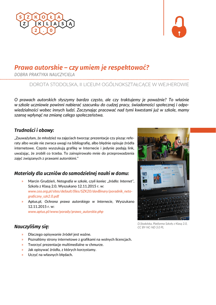 DOROTA STODOLSKA, II LICEUM OGÓLNOKSZTAŁCĄCE W WEJHEROWIE O prawach autorskich słyszymy bardzo często, ale czy traktujemy je poważnie? To właśnie w szkole uczniowie powinni nabierać szacunku do cudzej pracy, świadomości społecznej i odpowiedzialności wobec innych ludzi. Zaczynając pracować nad tymi kwestami już w szkole, mamy szansę wpłynąć na zmianę całego społeczeństwa. „Zauważyłam, że młodzież na zajęciach tworząc prezentacje czy pisząc referaty albo wcale nie zwraca uwagi na bibliografię, albo błędnie opisuje źródła internetowe. Często wyszukują grafikę w Internecie i jedynie podają link, uważając, że zrobili co trzeba. To zainspirowało mnie do przeprowadzenia zajęć związanych z prawami autorskimi.” » » Marcin Grudzień, Netografia w szkole, czyli koniec „źródło: Internet”, Szkoła z Klasą 2.0, Wyszukano 12.11.2015 r. w: www.ceo.org.pl/sites/default/files/SZK20/davBinary/poradnik_netograficzny_szk2.0.pdf Aptus.pl, Ochrona prawa autorskiego w Internecie, Wyszukano 12.11.2015 r. w: www.aptus.pl/www/porady/prawo_autorskie.php D.Stodolska, Platforma Szkoły z Klasą 2.0, CC BY-NC-ND 3.0 PL » » » » » Dlaczego opisywanie źródeł jest ważne. Poznaliśmy strony internetowe z grafikami na wolnych licencjach. Tworzyć prezentacje multimedialne w chmurze. Jak opisywać źródła, z których korzystamy. Uczyć na własnych błędach. Dzięki zastosowaniu metody odwróconej lekcji, uczniowie już przed zajęciami zdobyli potrzebną wiedzę. Na lekcji nauczycielka nie musiała wyjaśniać, czym są prawa autorskie i wolne licencje. Uczniowie mogli od razu przejść do twórczej pracy i wykorzystać zdobytą wiedzę w praktyce. Uczniowie tworzyli prezentacje w wirtualnej chmurze, dzięki czemu nauczycielka na bieżąco mogła sprawdzać ich postępy w pracy i wyjaśniać ewentualne niejasności. Więcej informacji o zadaniu znajdziecie w jego opisie na platformie programu: http://szk2015.ceo.nq.pl/kurs/dokument/9689/