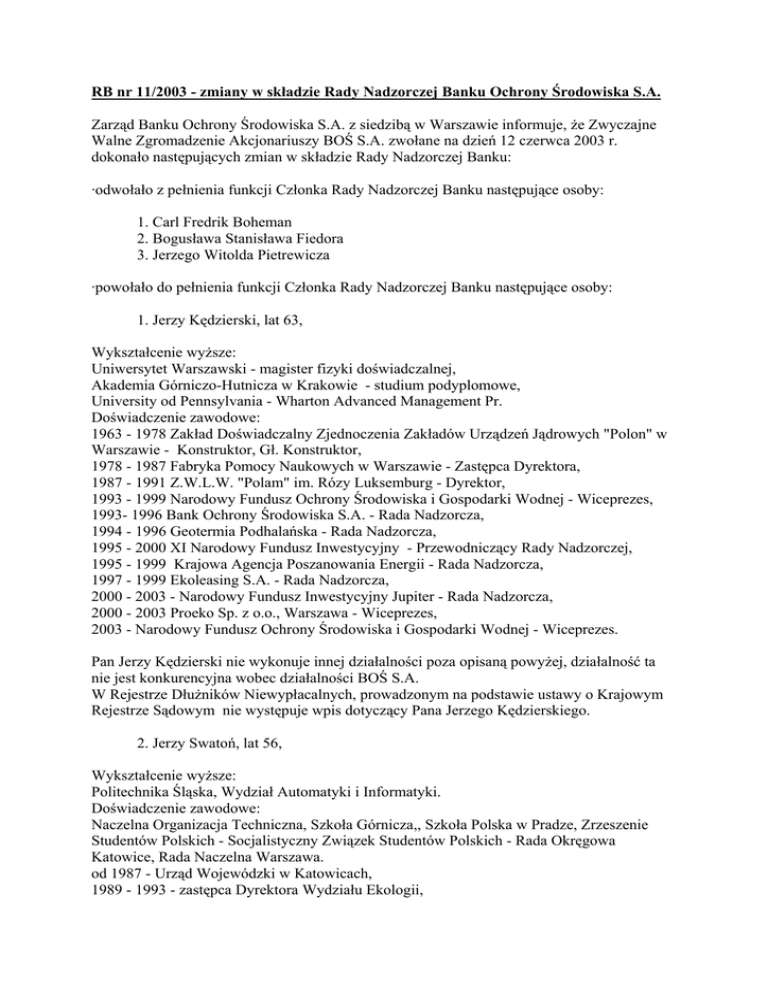 RB nr 11/2003 - zmiany w składzie Rady Nadzorczej Banku Ochrony Środowiska S.A. Zarząd Banku Ochrony Środowiska S.A. z siedzibą w Warszawie informuje, że Zwyczajne Walne Zgromadzenie Akcjonariuszy BOŚ S.A. zwołane na dzień 12 czerwca 2003 r. dokonało następujących zmian w składzie Rady Nadzorczej Banku: ·odwołało z pełnienia funkcji Członka Rady Nadzorczej Banku następujące osoby: 1. Carl Fredrik Boheman 2. Bogusława Stanisława Fiedora 3. Jerzego Witolda Pietrewicza ·powołało do pełnienia funkcji Członka Rady Nadzorczej Banku następujące osoby: 1. Jerzy Kędzierski, lat 63, Wykształcenie wyższe: Uniwersytet Warszawski - magister fizyki doświadczalnej, Akademia Górniczo-Hutnicza w Krakowie - studium podyplomowe, University od Pennsylvania - Wharton Advanced Management Pr. Doświadczenie zawodowe: 1963 - 1978 Zakład Doświadczalny Zjednoczenia Zakładów Urządzeń Jądrowych "Polon" w Warszawie - Konstruktor, Gł. Konstruktor, 1978 - 1987 Fabryka Pomocy Naukowych w Warszawie - Zastępca Dyrektora, 1987 - 1991 Z.W.L.W. "Polam" im. Rózy Luksemburg - Dyrektor, 1993 - 1999 Narodowy Fundusz Ochrony Środowiska i Gospodarki Wodnej - Wiceprezes, 1993- 1996 Bank Ochrony Środowiska S.A. - Rada Nadzorcza, 1994 - 1996 Geotermia Podhalańska - Rada Nadzorcza, 1995 - 2000 XI Narodowy Fundusz Inwestycyjny - Przewodniczący Rady Nadzorczej, 1995 - 1999 Krajowa Agencja Poszanowania Energii - Rada Nadzorcza, 1997 - 1999 Ekoleasing S.A. - Rada Nadzorcza, 2000 - 2003 - Narodowy Fundusz Inwestycyjny Jupiter - Rada Nadzorcza, 2000 - 2003 Proeko Sp. z o.o., Warszawa - Wiceprezes, 2003 - Narodowy Fundusz Ochrony Środowiska i Gospodarki Wodnej - Wiceprezes. Pan Jerzy Kędzierski nie wykonuje innej działalności poza opisaną powyżej, działalność ta nie jest konkurencyjna wobec działalności BOŚ S.A. W Rejestrze Dłużników Niewypłacalnych, prowadzonym na podstawie ustawy o Krajowym Rejestrze Sądowym nie występuje wpis dotyczący Pana Jerzego Kędzierskiego. 2. Jerzy Swatoń, lat 56, Wykształcenie wyższe: Politechnika Śląska, Wydział Automatyki i Informatyki. Doświadczenie zawodowe: Naczelna Organizacja Techniczna, Szkoła Górnicza,, Szkoła Polska w Pradze, Zrzeszenie Studentów Polskich - Socjalistyczny Związek Studentów Polskich - Rada Okręgowa Katowice, Rada Naczelna Warszawa. od 1987 - Urząd Wojewódzki w Katowicach, 1989 - 1993 - zastępca Dyrektora Wydziału Ekologii, od 1993 - Prezes Zarządu Wojewódzkiego Funduszu Ochrony Środowiska i Gospodarki Wodnej w Katowicach, od 2001 - Zastępca Prezesa Narodowego Funduszu Ochrony Środowiska i Gospodarki Wodnej, od 2003 - Prezes Zarządu Narodowego Funduszu Ochrony Środowiska i Gospodarki Wodnej Pan Jerzy Swatoń pełni jednocześnie funkcje członka Rady Nadzorczej WFOŚiGW w Katowicach oraz członka Rady Nadzorczej Przedsiębiorstwa Państwowego Kombinat Górniczo-Hutniczy "Bolesław". Inne: 1996 - 1999 członek Rady Nadzorczej BOŚ S.A., 2001 - 2002 Polski Klub Ekologiczny, Stowarzyszenie ProVita, Stowarzyszenie "Nowa Polska, Stowarzyszenie "Ordynacka", Solidarność Polsko - Czesko - Słowacka. Pan Jerzy Swatoń nie wykonuje innej działalności poza opisaną powyżej, działalność ta nie jest konkurencyjna wobec działalności BOŚ S.A. W Rejestrze Dłużników Niewypłacalnych, prowadzonym na podstawie ustawy o Krajowym Rejestrze Sądowym nie występuje wpis dotyczący Pana Jerzego Swatonia. 3. Claes - Johan (C-J) Thureson, lat 46, Wykształcenie wyższe: 1976 - 1980 Licencjat - Sztuka, Szkoła Ekonomiczna w Sztokholmie. 1976 - 1980 Magister Prawa, Uniwersytet w Sztokholmie. Doświadczenie zawodowe: 1980 - 1981 Pracownik sądu, Sąd w Sztokholmie 1981 - 1982 Londyn, Gulf Agency Co 1982 - 1986 Kuwejt, Gulf Agency Co 1986 - 1990 Przedstawiciel na Środokowy Wschód, SEB 1990 - 1999 Departament Bankowowści Korporacyjnej, SEB 1999 - 2001 Szef Działu Emisji Udziałów, SEB 2001 - Szef Działu Średnich Przedsiębiorstw, Finansowanie Handlu Zagranicznego, SEB Pan Claes-JohanThureson nie wykonuje innej działalności poza opisaną powyżej, działalność ta nie jest konkurencyjna wobec działalności BOŚ S.A. W Rejestrze Dłużników Niewypłacalnych, prowadzonym na podstawie ustawy o Krajowym Rejestrze Sądowym nie występuje wpis dotyczący Pana Claes-JohanThureson.