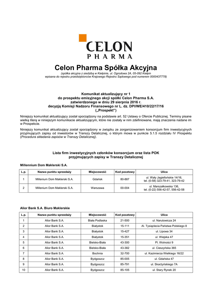 Celon Pharma Spółka Akcyjna (spółka akcyjna z siedzibą w Kiełpinie, ul. Ogrodowa 2A, 05-092 Kiełpin wpisana do rejestru przedsiębiorców Krajowego Rejestru Sądowego pod numerem 0000437778) Komunikat aktualizujący nr 1 do prospektu emisyjnego akcji spółki Celon Pharma S.A. zatwierdzonego w dniu 29 sierpnia 2016 r. decyzją Komisji Nadzoru Finansowego nr L. dz. DPI/WE/410/22/17/16 („Prospekt”) Niniejszy komunikat aktualizujący został sporządzony na podstawie art. 52 Ustawy o Ofercie Publicznej. Terminy pisane wielką literą w niniejszym komunikacie aktualizującym, które nie zostały w nim zdefiniowane, mają znaczenia nadane im w Prospekcie. Niniejszy komunikat aktualizujący został sporządzony w związku ze zorganizowaniem konsorcjum firm inwestycyjnych przyjmujących zapisy od inwestorów w Transzy Detalicznej, o którym mowa w punkcie 5.1.5 rozdziału IV Prospektu (Procedura składania zapisów w Transzy Detalicznej). Lista firm inwestycyjnych członków konsorcjum oraz lista POK przyjmujących zapisy w Transzy Detalicznej Millennium Dom Maklerski S.A. L.p. Nazwa punktu sprzedaży Miejscowość Kod pocztowy Ulica 1 Millenium Dom Maklerski S.A. Gdańsk 80-887 ul. Wały Jagiellońskie 14/16, tel. (0-58) 323-79-41, 323-79-42 2 Millenium Dom Maklerski S.A. Warszawa 00-004 ul. Marszałkowska 136, tel. (0-22) 556-42-57, 556-42-58 Alior Bank S.A. Biuro Maklerskie L.p. Nazwa punktu sprzedaży Miejscowość Kod pocztowy Ulica 1 Alior Bank S.A. Biała Podlaska 21-500 ul. Narutowicza 24 2 Alior Bank S.A. Białystok 15-111 Al. Tysiąclecia Państwa Polskiego 8 3 Alior Bank S.A. Białystok 15-427 ul. Lipowa 34 4 Alior Bank S.A. Białystok 15-351 ul. Wiejska 47 5 Alior Bank S.A. Bielsko-Biała 43-300 Pl. Wolności 9 6 Alior Bank S.A. Bielsko-Biała 43-382 ul. Cieszyńska 365 7 Alior Bank S.A. Bochnia 32-700 ul. Kazimierza Wielkiego 16/22 8 Alior Bank S.A. Bydgoszcz 85-005 ul. Gdańska 47 9 Alior Bank S.A. Bydgoszcz 85-791 ul. Skarżyńskiego 7A 10 Alior Bank S.A. Bydgoszcz 85-105 ul. Stary Rynek 20 L.p. Nazwa punktu sprzedaży Miejscowość Kod pocztowy Ulica 11 Alior Bank S.A. Bydgoszcz 85-825 ul. Wojska Polskiego 23 12 Alior Bank S.A. Bytom 41-902 ul. Jainty 22 13 Alior Bank S.A. Chełm 22-100 ul. Lubelska 70 14 Alior Bank S.A. Chojnice 89-600 Pl. Piastowski 30/3 15 Alior Bank S.A. Chorzów 41-500 ul. Wolności 29A 16 Alior Bank S.A. Chrzanów 32-500 ul. Trzebińska 40 17 Alior Bank S.A. Częstochowa 42-216 Al. 11 Listopada 5 18 Alior Bank S.A. Częstochowa 42-200 Al. NMP 10 19 Alior Bank S.A. Dąbrowa Górnicza 41-300 ul. Graniczna 21 20 Alior Bank S.A. Dąbrowa Górnicza 41-300 ul. Kościuszki 21 21 Alior Bank S.A. Dębica 39-200 ul. Rynek 4 22 Alior Bank S.A. Elbląg 82-300 ul. 1 Maja 43/1 23 Alior Bank S.A. Gdańsk 80-266 Al. Grunwaldzka 163 24 Alior Bank S.A. Gdańsk 80-244 Al. Grunwaldzka 72 25 Alior Bank S.A. Gdańsk 81-371 ul. Jagiellońska 2A 26 Alior Bank S.A. Gdańsk 80-836 ul. Tkacka 9/10 27 Alior Bank S.A. Gdynia 81-395 ul. Abrahama 46A 28 Alior Bank S.A. Gdynia 81-002 ul. Kartuska 20 29 Alior Bank S.A. Gdynia 81-356 ul. Starowiejska 17 30 Alior Bank S.A. Gliwice 44-100 ul. Jagiellońska 4 31 Alior Bank S.A. Gliwice 44-100 ul. Zwycięstwa 24 32 Alior Bank S.A. Głogów 67-210 ul. Grodzka 2 33 Alior Bank S.A. Gniezno 62-200 ul. Chrobrego 14 34 Alior Bank S.A. Gorzów Wielkopolski 66-400 ul. Hawelańska 3 35 Alior Bank S.A. Grodzisk Mazowiecki 05-826 ul. Sienkiewicza 45 36 Alior Bank S.A. Grudziądz 86-300 ul. Sienkiewicza 17 37 Alior Bank S.A. Gubin 66-620 ul. Śląska 4 38 Alior Bank S.A. Inowrocław 88-100 ul. Szeroka 1 39 Alior Bank S.A. Jastrzębie-Zdrój 44-335 Al. Józefa Piłsudskiego 25 40 Alior Bank S.A. Jaworzno 43-600 ul. Olszewskiego 2A 41 Alior Bank S.A. Jelenia Góra 58-500 ul. Krótka 1A 42 Alior Bank S.A. Kalisz 62-800 ul. Polna 14 43 Alior Bank S.A. Katowice 40-098 Pl. Wilhelma Szewczyka 7 44 Alior Bank S.A. Katowice 40-750 ul. Hierowskiego 70 45 Alior Bank S.A. Katowice 40-065 ul. Mikołowska 50 46 Alior Bank S.A. Katowice 40-114 ul. Ściegiennego 3 47 Alior Bank S.A. Katowice 40-009 ul. Warszawska 3 48 Alior Bank S.A. Kędzierzyn-Koźle 47-220 ul. Konstantego Damrota 14 49 Alior Bank S.A. Kielce 25-002 ul. Sienkiewicza 63 50 Alior Bank S.A. Kielce 25-414 ul. Warszawska 146 51 Alior Bank S.A. Konin 62-510 ul. Chopina 23E 52 Alior Bank S.A. Koszalin 75-022 Al. Zwycięstwa 37 53 Alior Bank S.A. Kraków 30-079 Al. Kijowska 22 54 Alior Bank S.A. Kraków 31-923 Os. Centrum A blok 1 2 L.p. Nazwa punktu sprzedaży Miejscowość Kod pocztowy Ulica 55 Alior Bank S.A. Kraków 31-855 Os. Kazimierzowskie 35A 56 Alior Bank S.A. Kraków 30-504 ul. Kalwaryjska 35A 57 Alior Bank S.A. Kraków 31-128 ul. Karmelicka 28 58 Alior Bank S.A. Kraków 31-534 ul. Masarska 9 59 Alior Bank S.A. Kraków 31-323 ul. Opolska 100 60 Alior Bank S.A. Kraków 31-015 ul. Pijarska 9 61 Alior Bank S.A. Kraków 31-462 ul. Pilotów 2 62 Alior Bank S.A. Kraków 30-552 ul. Wielicka 72 63 Alior Bank S.A. Kraków 31-105 ul. Zwierzyniecka 24 64 Alior Bank S.A. Krosno 38-400 ul. Pawła z Krosna 2 65 Alior Bank S.A. Kutno 99-300 Pl. Wolności 3 66 Alior Bank S.A. Legionowo 05-120 ul. Piłsudskiego 20 67 Alior Bank S.A. Legnica 59-220 ul. Biskupia 3 68 Alior Bank S.A. Leszno 64-100 ul. Królowej Jadwigi 4 69 Alior Bank S.A. Lubin 59-300 ul. Armii Krajowej 2 70 Alior Bank S.A. Lublin 20-121 Pl. Zamkowy 10 71 Alior Bank S.A. Lublin 20-002 ul. Krakowskie Przedmieście 60 72 Alior Bank S.A. Lublin 20-607 ul. Zana 32A 73 Alior Bank S.A. Łomianki 05-092 ul. Warszawska 98 74 Alior Bank S.A. Łomża 18-400 ul. Legionów 14 75 Alior Bank S.A. Łódź 92-524 ul. Gorkiego 28 76 Alior Bank S.A. Łódź 90-004 ul. Piotrkowska 108 77 Alior Bank S.A. Łódź 90-410 ul. Piotrkowska 43 78 Alior Bank S.A. Łódź 93-172 ul. Rzgowska 30 79 Alior Bank S.A. Łódź 90-318 ul. Sienkiewicza 82/84 80 Alior Bank S.A. Łódź 91-111 ul. Traktorowa 63 81 Alior Bank S.A. Łódź 94-048 ul. Wyszyńskiego 29 82 Alior Bank