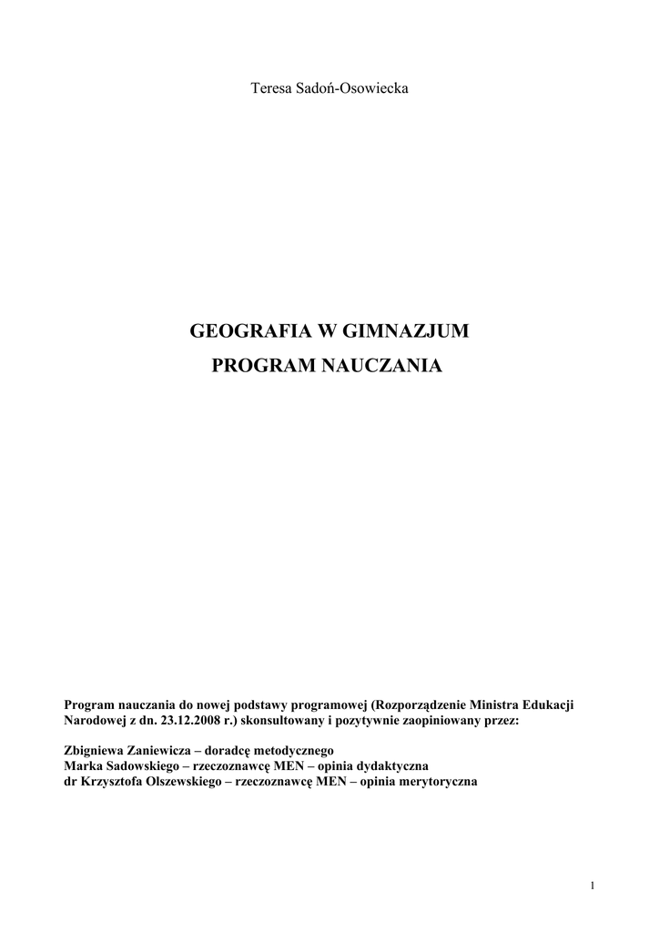 Teresa Sadoń-Osowiecka GEOGRAFIA W GIMNAZJUM PROGRAM NAUCZANIA Program nauczania do nowej podstawy programowej (Rozporządzenie Ministra Edukacji Narodowej z dn. 23.12.2008 r.) skonsultowany i pozytywnie zaopiniowany przez: Zbigniewa Zaniewicza – doradcę metodycznego Marka Sadowskiego – rzeczoznawcę MEN – opinia dydaktyczna dr Krzysztofa Olszewskiego – rzeczoznawcę MEN – opinia merytoryczna 1 Spis treści: I. Ogólne założenia programu ............................................................................................................3 II. Cele edukacyjne ............................................................................................................................5 III. Podstawa programowa a program nauczania ...............................................................................7 IV. Treści programu oraz osiągnięcia i działania ucznia ...................................................................9 V. Procedury osiągania celów...........................................................................................................39 VI. Ocenianie osiągnięć uczniów .....................................................................................................41 VII. Bibliografia ...............................................................................................................................42 2 I. Ogólne założenia programu Prezentowany program nauczania geografii w gimnazjum jest zgodny z podstawą programową z dnia 23 grudnia 2008 roku. Głównym celem programu jest wyposażenie ucznia w umiejętności typowe dla geografii jako dyscypliny naukowej, pozwalające w przyszłości na samodzielne poznawanie, analizowanie i wartościowanie zjawisk w ciągle zmieniającym się świecie, a więc umożliwiające uczenie się przez całe życie. Uczeń powinien zdobywać wiedzę samodzielnie, przy wsparciu nauczyciela, na podstawie informacji pochodzących z różnych źródeł. Ważne jest, by miał świadomość, że przyswojony na lekcjach geografii obraz świata nie jest jedyny, ale pozwala ten świat uporządkować, wyjaśniać i rozumieć zjawiska w nim występujące. Regiony geograficzne, które uczeń poznaje w trakcie nauki przedmiotu, są tylko przykładami charakterystycznych zjawisk i wyposażają ucznia w wiedzę nie tyle o samych regionach, ile o metodach ich poznawania. Program nastawiony jest na samodzielność ucznia w dochodzeniu do wiedzy, co znalazło wyraz w sformułowaniach osiągnięć ucznia. W programie założono, że w trakcie nauki geografii w gimnazjum uczeń posiądzie przede wszystkim wiedzę proceduralną („wiedza, jak”), która jest trwalsza niż wiedza deklaratywna („wiedza, że”). Pozwala ona stosować wiadomości w nowych sytuacjach, także pozaszkolnych, i umieszczać nowe informacje we własnej strukturze wiedzy. Zrozumienie problemów wymaga jednak znajomości terminów i metod badawczych typowych dla geografii jako dyscypliny naukowej. W prezentowanym programie położono nacisk na stosowanie terminów i metod badań w praktyce, a nie na odtwarzanie definicji. Takie założenie sytuuje ucznia na pozycji badacza, zgodnie ze stwierdzeniem T. Kuhna: „Uczeni nigdy nie przyswajają sobie pojęć, teorii, praw w sposób abstrakcyjny, jako takich. Od początku stykają się oni z tymi narzędziami intelektualnymi poprzez ich zastosowania w ramach szerszej, historycznie ukształtowanej struktury nauczania” (T. Kuhn, 2001, s. 93). Dla realizacji programu przyjęto przydział godzin według wytycznych ministerialnych, czyli 4 godziny lekcyjne w ciągu 3 lat nauki w gimnazjum. Przy korzystaniu z programu proponuję następujący rozkład godzin: – klasa I – 1 godzina lekcyjna, – klasa II – 2 godziny lekcyjne (zagadnienia dotyczące Polski), – klasa III – 1 godzina lekcyjna. Możliwe są również inne warianty przy odpowiednim przeniesieniu treści nauczania. W klasie I uczeń nabywa podstawowe umiejętności geograficzne związane z użyciem narzędzi poznawania przestrzeni geograficznej, użytecznych także w codziennym życiu (np. 3 korzystanie ze skali mapy, posługiwanie się mapą w terenie, odczytywanie wysokości względnych i bezwzględnych, posługiwanie się współrzędnymi geograficznymi, odczytywanie danych z diagramów i wykresów oraz tworzenie diagramów i wykresów). Uczeń poznaje również podstawy geografii fizycznej, co umożliwi mu samodzielne badanie, analizowanie, wyciąganie wniosków oraz ich prezentowanie najpierw podczas badania najbliższego otoczenia, a potem podczas poznawania Polski i wybranych regionów świata w następnych latach nauki. Na opanowanie tych treści przeznaczono w programie 30 godzin. Zgodnie z zapisem podstawy programowej w następnej kolejności uczeń przyswaja wiedzę o Polsce, korzystając z umiejętności zdobytych w poprzedniej klasie. Na te zagadnienia program przewiduje około 60 godzin w klasie II. W klasie III przewidziano przegląd wszystkich kontynentów na podstawie wybranych krajów i regionów świata przy zastosowaniu umiejętności zdobytych w poprzednich latach nauki. Na realizację tych zagadnień zaplanowano w programie 30 godzin. Na tym etapie uczeń przyswaja model postępowania badawczego pomocny przy samodzielnym, także pozaszkolnym, zdobywaniu wiedzy o innych krajach, nieuwzględnionych w programie. Pozostałe godziny to czas do wykorzystania przez nauczyciela między innymi na ewaluację wiedzy ucznia, a także na pogłębienie wiedzy o regionie oraz nawiązanie do aktualnych wydarzeń (klęsk żywiołowych, zjawisk społecznych, politycznych, gospodarczych). Nauczyciel może regulować sobie ten dodatkowy zakres treści i wymagań, dostosowując go do zasobu wiedzy uczniów, ich umiejętności, potrzeb, zainteresowań oraz do zewnętrznych lub nieprzewidzianych okoliczności. 4 II. Edukacyjne cele kształcenia i wychowania Zgodnie z podstawą programową kształcenia ogólnego realiz