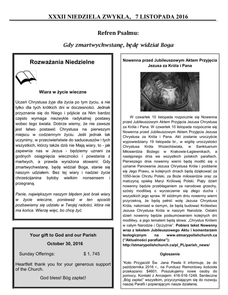 XXXII NIEDZIELA ZWYKŁA, 7 LISTOPADA 2016 Refren Psalmu: Gdy zmartwychwstanę, będę widział Boga Rozważania Niedzielne Nowenna przed Jubileuszowym Aktem Przyjęcia Jezusa za Króla i Pana Wiara w życie wieczne Uczeń Chrystusa żyje dla życia po tym życiu, a nie tylko dla tych krótkich dni w doczesności. Jednak przyznanie się do Niego i pójście za Nim bardzo często wymaga niezwykle radykalnej postawy wobec tego świata. Dobrze wiemy, że nie zawsze jest łatwo postawić Chrystusa na pierwszym miejscu w codziennym życiu. Jeśli jednak tak uczynimy, w przeciwieństwie do saduceuszów i tych wszystkich, którzy także dziś nie Mają wiary, to - jak zapewnia nas w Jezus - będziemy uznani za godnych osiągnięcia wieczności i powstania z martwych, a prawda wyrażona słowami: Gdy zmartwychwstanę, będę widział Boga, stanie się naszym udziałem. Bez tej wiary i nadziei życie chrześcijanina byłoby wielkim nonsensem i przegraną. Panie, największym naszym błędem jest brak wiary w życie wieczne, ponieważ w ten sposób pozbawiamy się udziału w Twojej radości, która nie ma końca. Wierzę więc, bo chcę żyć. Your gift to God and our Parish October 30, 2016 Sunday Offerings: $ 1, 745 Heartfelt thank you for your generous support of the Church. God bless! Bóg zapłać! W czwartek 10 listopada rozpocznie się Nowenna przed Jubileuszowym Aktem Przyjęcia Jezusa Chrystusa za Króla i Pana. W czwartek 10 listopada rozpocznie się Nowenna przed Jubileuszowym Aktem Przyjęcia Jezusa Chrystusa za Króla i Pana. Akt zostanie uroczyście wypowiedziany 19 listopada br., w wigilię uroczystości Chrystusa Króla Wszechświata, w Sanktuarium Miłosierdzia Bożego w Krakowie-Łagiewnikach, a następnego dnia we wszystkich polskich parafiach. Pierwszego dnia nowenny wierni będą modlić się o uznanie Panowania Jezusa Chrystusa Króla i poddanie się Jego Prawu, w kolejnych dniach będą dziękować za 1050-lecie Chrztu Polski, za Boże miłosierdzie oraz za matczyną opiekę Maryi Królowej Polski. Piąty dzień nowenny będzie przebłaganiem za narodowe grzechy, szósty modlitwą o wyrzeczenie się złego ducha i wszystkich jego spraw. W siódmym dniu nowenny wierni przyrzekną, że będą pełnić wolę Jezusa Chrystusa Króla, natomiast w ósmym, że będą budować Królestwo Jezusa Chrystusa Króla w naszym Narodzie. Ostatni dzień nowenny będzie podsumowaniem kolejnych dni modlitwy, a jego tematem będą słowa: „Chrystus Królem w całym Narodzie i Ojczyźnie”. Pobierz tekst Nowenny wraz z tekstem Jubileuszowego Aktu i komentarzem teologicznym na www.stmarypolishchurch.ca (“Aktualności parafialne”): http://stmarypolishchurch.ca/pl_PL/parish_news/ Ogłoszenie “Koło Przyjaciół Św. Jana Pawła II informuje, że do października 2016 r., na Fundusz Remontowy kościoła przekazano: $4601. Poszukujemy nowe osoby do pomocy. Kontakt z Anrzejem: 416-516-1249. Serdeczne „Bóg zapłać” wszystkim, przyczyniającym się do rozwoju naszej Parafii i popierającym nasze działania. 32nd SUNDAY IN ORDINARY TIME, NOVEMBER 6, 2016 Psalm Refrain: I shall be satisfied, Lord, when I awake and behold your likeness. Reflection ..... In today's Gospel, we hear about an encounter between Jesus and some Sadducees. The Sadducees were literal interpreters of the written Law of Moses, which means that they were in disagreement with the position of the Pharisees, who offered an oral interpretation of the Law of Moses. The Sadducees are described in this Gospel as opponents to the belief in resurrection. In the dialogue presented here, we see an example of the means of disputation that was common in first century Judaism. The Sadducees use the example of Levirate marriage, found in the Law of Moses, to disprove belief in the resurrection. According to Deuteronomy 25:5-10, if a man died without producing an heir, the man's brother should marry his wife and the offspring of this union would inherit the property and carry on the name of the man who had died. The Sadducees use this as an example to challenge belief in the resurrection. Jesus argues from the same written Law of Moses to show that there is resurrection. Using the texts from the Book of Exodus (Chapter 3) that describe Moses' encounter with God in the burning bush, Jesus shows that God is the God of the living, not the dead. Here Jesus uses the same method and texts of the Sadducees to counter them. As the Gospel text suggests, he beat them at their own game! More importantly, in this discourse Jesus shows the limits of our imaginations when it comes to eternal life. The Sadducees argued against resurrection because of the limits of earthly existence. They did not imagine another possibility for existence and relationship with God. Jesus proposes that the possibilities of resurrected life are beyond our imaginations. Jesus' conclusion suggests something else as well: To spend time worrying about resurrected life is to miss the point. The point is eternal relationship with God is possible, for God is the God of the living, “. . . for to him all are alive.” Starting today, our parishioners will have the option to give their offertory via the Pre-Authorized Giving (PAG) program. With PAG, your offering is deducted automatically by direct debit from your bank account; no need to search for your cheque book or stop by a cash machine on the way to church. PAG allows you to support your parish when you are away—a benefit to the church, since expenses continue all year long. Most importantly, you are in control. You can increase or decrease your amount or withdraw from the PAG plan simply by dropping a signed note in the collection basket or at the Parish Office. Enclosed in the parish bulletin is a registration form. If you want to sign up for the program, simply fill in the form, attach a void cheque and submit it to the Parish Office or place these in an envelope for the collection basket. Should you have questions, pl