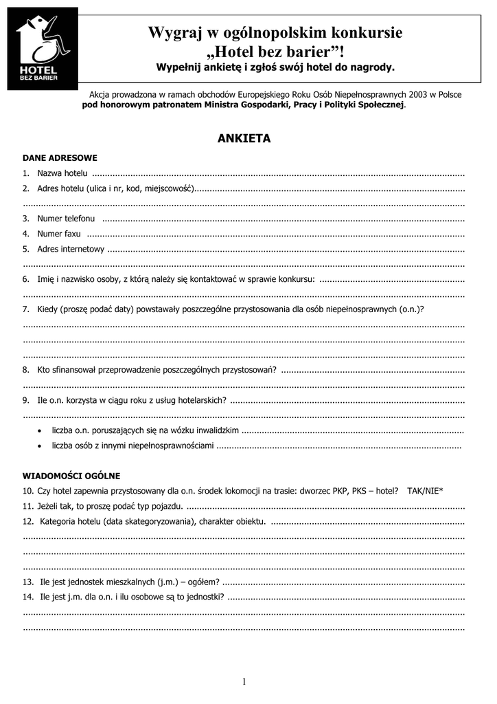 Wygraj w ogólnopolskim konkursie „Hotel bez barier”! Wypełnij ankietę i zgłoś swój hotel do nagrody. Akcja prowadzona w ramach obchodów Europejskiego Roku Osób Niepełnosprawnych 2003 w Polsce pod honorowym patronatem Ministra Gospodarki, Pracy i Polityki Społecznej. ANKIETA DANE ADRESOWE 1. Nazwa hotelu .................................................................................................................................................. 2. Adres hotelu (ulica i nr, kod, miejscowość).......................................................................................................... ............................................................................................................................................................................. 3. Numer telefonu .............................................................................................................................................. 4. Numer faxu .................................................................................................................................................... 5. Adres internetowy ............................................................................................................................................ ............................................................................................................................................................................. 6. Imię i nazwisko osoby, z którą należy się kontaktować w sprawie konkursu: ......................................................... ............................................................................................................................................................................. 7. Kiedy (proszę podać daty) powstawały poszczególne przystosowania dla osób niepełnosprawnych (o.n.)? ............................................................................................................................................................................. ............................................................................................................................................................................. ............................................................................................................................................................................. 8. Kto sfinansował przeprowadzenie poszczególnych przystosowań? ........................................................................ ............................................................................................................................................................................. 9. Ile o.n. korzysta w ciągu roku z usług hotelarskich? ............................................................................................ ............................................................................................................................................................................. • liczba o.n. poruszających się na wózku inwalidzkim ........................................................................................ • liczba osób z innymi niepełnosprawnościami ................................................................................................. WIADOMOŚCI OGÓLNE 10. Czy hotel zapewnia przystosowany dla o.n. środek lokomocji na trasie: dworzec PKP, PKS – hotel? TAK/NIE* 11. Jeżeli tak, to proszę podać typ pojazdu. ............................................................................................................. 12. Kategoria hotelu (data skategoryzowania), charakter obiektu. ............................................................................ ............................................................................................................................................................................. ............................................................................................................................................................................. ............................................................................................................................................................................. 13. Ile jest jednostek mieszkalnych (j.m.) – ogółem? ............................................................................................... 14. Ile jest j.m. dla o.n. i ilu osobowe są to jednostki? ............................................................................................. ............................................................................................................................................................................. ............................................................................................................................................................................. 1 OTOCZENIE HOTELU 15. W jakiej odległości od hotelu można zaparkować samochód? .............................................................................. 16. Proszę podać liczbę miejsc parkingowych przystosowanych dla środków lokomocji o.n.? ....................................... OPIS HOTELU 17. Czy jest zapewniona dostępność do hotelu? (parter bez schodów) 18. Czy jest podjazd dla osób na wózkach inwalidzkich? TAK/NIE* TAK/NIE* 19. Czy przy podjeździe są zamontowane barierki lub uchwyty? TAK/NIE* 20. Szerokość drzwi wejściowych do budynku, sposób ich otwierania (ręcznie, mechanicznie, automatycznie)? ............................................................................................................................................................................. ............................................................................................................................................................................. 21. Na której kondygnacji są przystosowane j.m. dla o.n..............