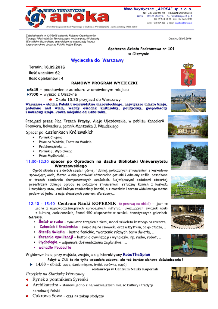 Biuro Turystyczne „AROKA” sp. z o. o. NIP 739-350-98-49 REGON: 280055343 adres: 10-578 Olsztyn, Al. Piłsudskiego 32 p. 4 tel. 89 534 14 56 fax: 89 722 30 05 kom: 512 357 865 e-mail: [email protected] VIII Wydział Gospodarczy Sądu Rejonowego w Olsztynie nr KRS 0000242712 kapitał zakładowy 50 000 złotych Zaświadczenie nr 120/2005 wpisu do Rejestru Organizatorów Turystyki i Pośredników Turystycznych wydane przez Wojewodę Warmińsko-Mazurskiego zezwalające na organizację imprez turystycznych na obszarze Polski i krajów Europy Olsztyn, 05.09.2016 Społeczna Szkoła Podstawowa nr 101 w Olsztynie W Wyycciieecczzkkaa ddoo W Waarrsszzaaw wyy TTeerrm miinn:: 1166..0099..22001166 IIlloośśćć uucczznniióów w:: 6622 IIlloośśćć ooppiieekkuunnóów w :: 44 RAMOWY PROGRAM WYCIECZKI 6:45 – podstawienie autokaru w umówionym miejscu 7:00 – wyjazd z Olsztyna Około 10.30 przyjazd do Warszawy W W w o P o k w o w ó d w m o w k o n w k m o k u Waaarrrssszzzaaaw waaa ––– sssttto ollliiicccaaa P Po olllsssk kiii iii w wo ojjjeeew wó ód dzzztttw waaa m maaazzzo ow wiiieeeccck kiiieeegggo o,,, n naaajjjw wiiięęęk kssszzzeee m miiiaaasssttto ok krrraaajjju u,,, p p o o o n n d W W n y o o d k k u u n y p o y n y o p o d y po ołłło ożżżo on neee n naaad d W Wiiisssłłłąąą... W Waaażżżn ny y o ośśśrrro od deeek k k ku ullltttu urrraaallln ny y,,, p po ollliiittty yccczzzn ny y,,, gggo osssp po od daaarrrccczzzy y iii n n u k o w y k u P w m k o d 1 3 2 3 o k u naaau uk ko ow wy yk krrraaajjju u... P Prrraaaw waaa m miiieeejjjsssk kiiieee o od d1 13 32 23 3 rrro ok ku u... PPrrzzeejjaazzdd pprrzzeezz PPllaacc TTrrzzeecchh KKrrzzyyżżyy,, A Alleejjee U Ujjaazzddoowwsskkiiee,, ww ppoobblliiżżuu KKaanncceellaarriii PPrreem i e r a , B e l w e d e r u , p o m n i k M a r s z a ł k a J . P i ł s u miera, Belwederu, pomnik Marszałka J. Piłsuddsskkiieeggoo Spacer po Łazienkach Królewskich Pomnik Chopina Pałac na Wodzie, Teatr na Wodzie Podchorążówka, …. Pomnik J. Wybickiego Pałac Myślenicki, … 11:30–12:20 spacer po Ogrodach na dachu Biblioteki Uniwersytetu Warszawskiego Ogród składa się z dwóch części: górnej i dolnej, połączonych strumieniem z kaskadowo spływającą wodą. Można w nim podziwiać różnorodne gatunki i odmiany roślin, posadzone w trzech odmiennie skomponowanych częściach. Największymi ozdobami otwartej przestrzeni dolnego ogrodu są połączone strumieniem: sztuczny kamień z kaskadą i zarybiony staw, nad którym zamieszkały kaczki, a z mostków i tarasu widokowego można podziwiać jedną z najciekawszych panoram Warszawy... 12:40 – 15:40 Centrum Nauki KOPERNIK (z przerwą na obiad) – jest to jedna z najnowocześniejszych europejskich instytucji ukazujących związek nauki z kulturą, codziennością. Ponad 450 eksponatów w sześciu tematycznych galeriach. Galerie: ŚŚwwiiaatt ww rrruuuccchhhuuu – symulator trzęsienia ziemi, model szkieletu kostnego na rowerze, CCzzłłoowwiieekk ii śśrrooddoowwiisskkoo – skupia się na człowieku oraz wszystkim, co go otacza, … SSttrreeffaa śśwwiiaattłłaa – lustro fenickie, tworzenie różnych barw światła, … KKoorrzzeenniiee ccyywwiilliizzaaccjjii – historia cywilizacji i wynalazki, np. radio, robot, … H Hyyddrroollooggiiaa – wspaniałe doświadczenia żeglarskie, … wahadło Foucaulta W głównym holu, przy wejściu, znajduje się interaktywny RoboTheSpian Pobyt w CNK to nie tylko wspaniała zabawa, ale też bardzo ciekawe doświadczenia ! 14.00 – obiad: zupa, danie mięsne, frytki, surówka, napój restauracja w Centrum Nauki Kopernik Przejście na Starówkę Warszawy Rynek z pomnikiem Syrenki Archikatedra - stanowi jedno z najważniejszych miejsc kultury i tradycji narodowej Polski Cukrowa Sowa – czas na zakup słodyczy Około godziny 17-ej wyjazd do Olsztyna. Planowany powrót do Olsztyna około godziny 20:30. CCEEN NAA:: 112200 PPLLN N//uucczz.. Cena zawiera: przewóz autokarem oraz busem klasy turystycznej (klimatyzacja, pasy bezpieczeństwa, radio, nagłośnienie) bilety wstępu : CNK pilota na trasie 4 opiekunów obiad – restauracja w Centrum Nauki Kopernik ubezpieczenie NNW Z życzeniami wspaniałych wrażeń!!! Stanisław Lipka