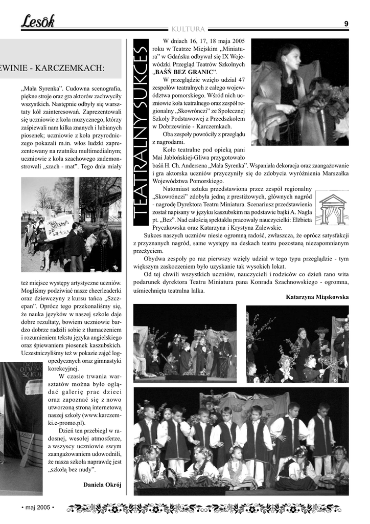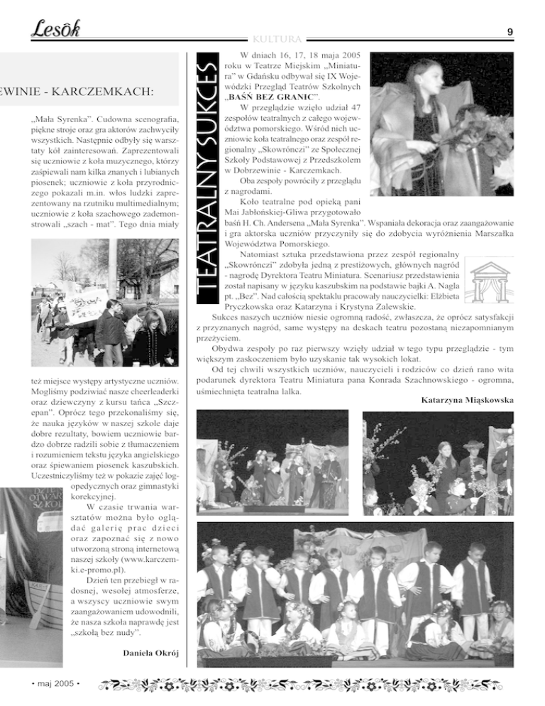 kultura „Mała Syrenka”. Cudowna scenografia, piękne stroje oraz gra aktorów zachwyciły wszystkich. Następnie odbyły się warsztaty kół zainteresowań. Zaprezentowali się uczniowie z koła muzycznego, którzy zaśpiewali nam kilka znanych i lubianych piosenek; uczniowie z koła przyrodniczego pokazali m.in. włos ludzki zaprezentowany na rzutniku multimedialnym; uczniowie z koła szachowego zademonstrowali „szach - mat”. Tego dnia miały też miejsce występy artystyczne uczniów. Mogliśmy podziwiać nasze cheerleaderki oraz dziewczyny z kursu tańca „Szczepan”. Oprócz tego przekonaliśmy się, że nauka języków w naszej szkole daje dobre rezultaty, bowiem uczniowie bardzo dobrze radzili sobie z tłumaczeniem i rozumieniem tekstu języka angielskiego oraz śpiewaniem piosenek kaszubskich. Uczestniczyliśmy też w pokazie zajęć logopedycznych oraz gimnastyki korekcyjnej. W czasie trwania warsztatów można było oglądać galerię prac dzieci oraz zapoznać się z nowo utworzoną stroną internetową naszej szkoły (www.karczemki.e-promo.pl). Dzień ten przebiegł w radosnej, wesołej atmosferze, a wszyscy uczniowie swym zaangażowaniem udowodnili, że nasza szkoła naprawdę jest „szkołą bez nudy”. Daniela Okrój • maj 2005 • W dniach 16, 17, 18 maja 2005 roku w Teatrze Miejskim „Miniatura” w Gdańsku odbywał się IX Wojewódzki Przegląd Teatrów Szkolnych „BAŚŃ BEZ GRANIC”. W przeglądzie wzięło udział 47 zespołów teatralnych z całego województwa pomorskiego. Wśród nich uczniowie koła teatralnego oraz zespół regionalny „Skowrónczi” ze Społecznej Szkoły Podstawowej z Przedszkolem w Dobrzewinie - Karczemkach. Oba zespoły powróciły z przeglądu z nagrodami. Koło teatralne pod opieką pani Mai Jabłońskiej-Gliwa przygotowało baśń H. Ch. Andersena „Mała Syrenka”. Wspaniała dekoracja oraz zaangażowanie i gra aktorska uczniów przyczyniły się do zdobycia wyróżnienia Marszałka Województwa Pomorskiego. Natomiast sztuka przedstawiona przez zespół regionalny „Skowrónczi” zdobyła jedną z prestiżowych, głównych nagród - nagrodę Dyrektora Teatru Miniatura. Scenariusz przedstawienia został napisany w języku kaszubskim na podstawie bajki A. Nagla pt. „Bez”. Nad całością spektaklu pracowały nauczycielki: Elżbieta Pryczkowska oraz Katarzyna i Krystyna Zalewskie. Sukces naszych uczniów niesie ogromną radość, zwłaszcza, że oprócz satysfakcji z przyznanych nagród, same występy na deskach teatru pozostaną niezapomnianym przeżyciem. Obydwa zespoły po raz pierwszy wzięły udział w tego typu przeglądzie - tym większym zaskoczeniem było uzyskanie tak wysokich lokat. Od tej chwili wszystkich uczniów, nauczycieli i rodziców co dzień rano wita podarunek dyrektora Teatru Miniatura pana Konrada Szachnowskiego - ogromna, uśmiechnięta teatralna lalka. Katarzyna Miąskowska TEATRALNY SUKCES EWINIE - KARCZEMKACH: 9 10 ekologia Słowa św. Franciszka towarzyszyły uczestnikom turnieju, który po raz drugi odbył się 22 kwietnia w Gimnazjum w Szemudzie. Dzieci i młodzież z terenu gminy Szemud po raz kolejny wykazały się znajomością zjawisk i procesów zagrażających naszej Planecie oraz sposobów przeciwdziałania im. Chcą uczyć się mądrze gospodarować zasobami przyrody zgodnie z zasadami ekorozwoju, aby przyszłym pokoleniom pozostawić czystą i piękną Ziemię. W turnieju brały udział pięcioosobowe drużyny ze szkół podstawowych: z Bojana, Jeleńskiej Huty, Koleczkowa, Łebieńskiej Huty, Łebna i Szemuda oraz gimnazjów: Bojana, Kielna i Szemuda. W odpowiedni nastrój wprowadziła wszystkich inscenizacja pt. „Sprawa dla reportera” w wykonaniu koła teatralnego Gimnazjum w Szemudzie. Następnie rozpoczął się I etap turnieju, do którego drużyny przygotowywały się kilka tygodni wcześniej. Obejmował on prezentację w pięciu kategoriach: plakat pt. „Chrońmy naszą Matkę-Ziemię”, piosenka ekologiczna, Tobie została powierzona Ziemia - rządź nią z mądrością Św. Franciszek z Asyżu II Gminny Turniej Ekologiczny „Ziemia naszym wspólnym domem” II etap turnieju. Drużyny odpowiadały pisemnie na trzy zagadki przyrodnicze oraz ustnie na dwa pytania. W tym etapie nie wszystkim drużynom udało się uzyskać maksymalną liczbę punktów. Ten etap zadecydował o końcowej punktacji W kategorii szkół podstawowych: I miejsce zajęła drużyna z Szemuda II miejsce z Bojana III miejsce z Łebieńskiej Huty. W kategorii gimnazjów: I miejsce zajęła drużyna z Szemuda II miejsce z Kielna III miejsce z Bojana. Turniej zakończył się rozdaniem nagród, które ufundował Urząd Gminy w Szemudzie oraz pan Ryszard Tomys. Tradycyjnie każda z drużyn otrzymała drzewko, które posadzi przy swojej szkole. W miłej atmosferze wszyscy uczestnicy pożegnali się wyrażając chęć udziału w następnym turnieju za rok. Wszystkim uczestnikom turnieju za wzorową postawę ekologiczną, opiekunom za przygotowanie drużyn, a jury za owocną pracę składam podziękowanie. Elżbieta Pozańska fraszka lub wiersz, hasło w formie transparentu ułożonego przez drużynę i „śmieciuszka” - zabawka wykonana z odpadów trafiających do kosza na śmieci. Kolejno każda drużyna prezentowała swoje pomysły i prace, które oceniało jury w składzie: przewodnicząca - Beata Węzeł, sekretarz - Joanna Bielińska, członkowie: Zenon Gołąbek, Przemysław Górski i Alicja Szarafin-Grządkowska. Jury wspierali swoją wiedzą przyrodniczą panowie Ryszard Tomys z Leśnictwa w Przetoczynie i Krzysztof Jankowski z Leśnictwa w Kamieniu. Po każdej konkurencji podczas przyznawania punktów przez jury na sali wyczuwało się dreszczyk emocji, który udzielał się również komisji konkursowej. Po krótkiej przerwie odbył się • maj • 2005 • 11 wycieczki P od takim hasłem 5 kwietnia 2005 r. gimnazjaliści z Kielna wyruszyli na rajd rowerowy. Uczestnikami wyprawy byl