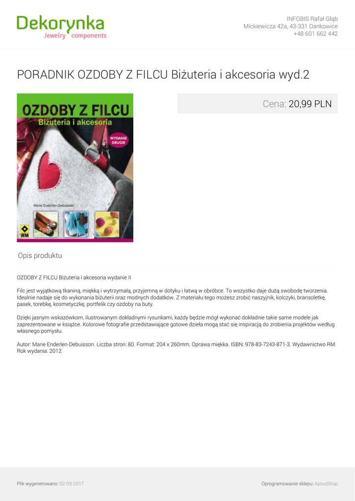 INFOBIS Rafał Głąb Mickiewicza 42a, 43-331 Dankowice +48 601 662 442 PORADNIK OZDOBY Z FILCU Biżuteria i akcesoria wyd.2 Cena: 20,99 PLN Opis produktu OZDOBY Z FILCU Biżuteria i akcesoria wydanie II Filc jest wyjątkową tkaniną, miękką i wytrzymałą, przyjemną w dotyku i łatwą w obróbce. To wszystko daje dużą swobodę tworzenia. Idealnie nadaje się do wykonania biżuterii oraz modnych dodatków. Z materiału tego możesz zrobić naszyjnik, kolczyki, bransoletkę, pasek, torebkę, kosmetyczkę, portfelik czy ozdoby na buty. Dzięki jasnym wskazówkom, ilustrowanym dokładnymi rysunkami, każdy będzie mógł wykonać dokładnie takie same modele jak zaprezentowane w książce. Kolorowe fotografie przedstawiające gotowe dzieła mogą stać się inspiracją do zrobienia projektów według własnego pomysłu. Autor: Marie Enderlen-Debuisson. Liczba stron: 80. Format: 204 x 260mm. Oprawa miękka. ISBN: 978-83-7243-871-3. Wydawnictwo RM. Rok wydania: 2012. Plik wygenerowano: 02-03-2017 Oprogramowanie sklepu: AptusShop INFOBIS Rafał Głąb Mickiewicza 42a, 43-331 Dankowice +48 601 662 442 Galeria Plik wygenerowano: 02-03-2017 Powered by TCPDF (www.tcpdf.org) Oprogramowanie sklepu: AptusShop