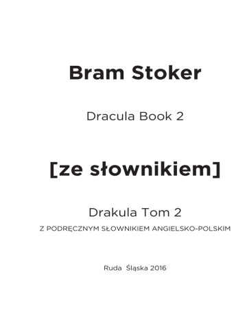 Bram Stoker Dracula Book 2 [ze słownikiem] Drakula Tom 2 Z PODRĘCZNYM SŁOWNIKIEM ANGIELSKO-POLSKIM Ruda Śląska 2016 CONTENTS Vocabulary of Most Common Words...................................................................................... 7 Chapter 15. Dr. Seward’s Diary ................................................................................................... 47 Chapter 16. Dr. Seward’s Diary ................................................................................................... 71 Chapter 17. Dr. Seward’s Diary ................................................................................................... 89 Chapter 18. Dr. Seward’s Diary ................................................................................................... 111 Chapter 19. Jonathan Harker’s Journal ................................................................................... 139 Chapter 20. Jonathan Harker’s Journal.................................................................................. 161 Chapter 21. Dr. Seward’s Diary ................................................................................................... 185 Chapter 22. Jonathan Harker’s Journal .................................................................................. 209 Chapter 23. Dr. Seward’s Diary .................................................................................................. 231 Chapter 24. Dr. Seward’s Phonograph Diary, spoken by Van Helsing ..................... 255 Chapter 25. Dr. Seward’s Diary .................................................................................................. 279 Chapter 26. Dr. Seward’s Diary .................................................................................................. 305 Chapter 27. Mina Harker’s Journal............................................................................................ 333 Vocabulary.......................................................................................................................................... 363 Chapter 15. Dr. Seward’s Diary FOR a while sheer anger mastered me; it was as if he had during her life struck Lucy on the face. I smote the table hard and rose up as I said to him:— “Dr. Van Helsing, are you mad?” He raised his head and looked at me, and somehow the tenderness of his face calmed me at once. “Would I were!” he said. “Madness were easy to bear compared with truth like this. Oh, my friend, why, think you, did I go so far round, why take so long to tell you so simple a thing? Was it because I hate you and have hated you all my life? Was it because I wished to give you pain? Was it that I wanted, now so late, revenge for that time when you saved my life, and from a fearful death? Ah no!” “Forgive me,” said I. He went on:— “My friend, it was because I wished to be gentle in the breaking to you, for I know you have loved that so sweet lady. But even yet I do not expect you to believe. It is so hard to accept at once any abstract truth, that we may doubt such to be possible when we have always believed the ‘no’ of it; it is more hard still to accept so sad a concrete truth, and of such a one as Miss Lucy. To-night I go to prove it. Dare you come with me?” This staggered me. A man does not like to prove such a truth; Byron excepted from the category, jealousy. abstract - abstrakcja calmed - (calm) spokojny category - kategoria concrete - betonowy, konkretny dare - RGZDů\ýVLęRœPLHOLý PLHýF]HOQRœý dr - doktor fearful - VWUDV]OLZ\SU]HVWUDV]RQ\ forgive - SU]HEDF]\ý jealousy - ]D]GURœý madness - V]DOHľVWZR revenge - ]HPVWDUHZDQů smote - ZDOQĊýXGHU]Dý]GXůĊ VLâĊ staggered - VWDJJHUVâDQLDýVLę ]DWDF]DýVLęFKZLDýVLę]GXPLHý tenderness - F]XâRœý ZUDůOLZRœýGHOLNDWQRœý abhorred - DEKRUF]XýOXEPLHý RGUD]ęGRF]HJRœ awake - EXG]LýVLęXœZLDGRPLý VRELHREXG]LýSU]HEXG]RQ\ bandage - ]DEDQGDůRZDý RSDWU]\ýEDQGDů bog - ]QDOHŭýVLęZPDUWZ\P punkcie; bagno, torfowisko churchyard - FPHQWDU] SU]\NRœFLHOQ\ coffin - trumna; coffin-man JUDEDU] dread - VWUDFKOęN hasten - SU]\œSLHV]DýSRQDJODý SRSęG]Dý hesitation - wahanie jumping - MXPSVNDNDý ZVNRF]\ýVNRNMXPSXS]U\ZDýVLę madman - V]DOHQLHF misty - PJOLVW\PJOLœFLH ordeal - PęND plucked - SOXFNUZDýV]DUSDý ]U\ZDý RVNXEDý propose - SURSRQRZDý ]DSURSRQRZDý]DPLHU]Dý RœZLDGF]\ý punctures - SXQFWXUHSU]HELFLH G]LXUDQDNâXFLH sank - VLQN]DWRQĊýWRQĊý ]OHZEęGĊF\Z]DSDœFL similarity - SRGRELHľVWZR spend - Z\GDZDýVSęG]Dý wydatek tomb - grób tussock - NęSa 'UDFXOD%RRN “And prove the very truth he most abhorred.” He saw my hesitation, and spoke:— “The logic is simple, no madman’s logic this time, jumping from tussock to tussock in a misty bog. If it be not true, then proof will be relief; at worst it will not harm. If it be true! Ah, there is the dread; yet very dread should help my cause, for in it is some need of belief. Come, I tell you what I propose: first, that we go off now and see that child in the hospital. Dr. Vincent, of the North Hospital, where the papers say the child is, is friend of mine, and I think of yours since you were in class at Amsterdam. He will let two scientists see his case, if he will not let two friends. We shall tell him nothing, but only that we wish to learn. And then——” “And then?” He took a key from his pocket and held it up. “And then we spend the night, you and I, in the churchyard where Lucy lies. This is the key that lock the tomb. I had it from the coffin-man to give to Arthur.” My heart sank within me, for I felt that there was some fearful ordeal before us. I could do nothing, however, so I plucked up what heart I could and said that we had better hasten, as the afternoon was passing.... We found the child awake. It had had a sleep and taken some food, and altogether was going on well. Dr. Vincent took the bandage from its throat, and showed us the