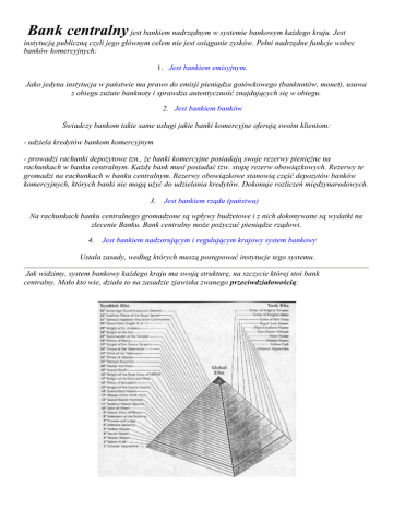 Bank centralny jest bankiem nadrzędnym w systemie bankowym każdego kraju. Jest instytucją publiczną czyli jego głównym celem nie jest osiąganie zysków. Pełni nadrzędne funkcje wobec banków komercyjnych: 1. Jest bankiem emisyjnym. Jako jedyna instytucja w państwie ma prawo do emisji pieniądza gotówkowego (banknotów, monet), usuwa z obiegu zużute banknoty i sprawdza autentyczność znajdujących się w obiegu. 2. Jest bankiem banków Świadczy bankom takie same usługi jakie banki komercyjne oferują swoim klientom: - udziela kredytów bankom komercyjnym - prowadzi rachunki depozytowe tzn., że banki komercyjne posiadają swoje rezerwy pieniężne na rachunkach w banku centralnym. Każdy bank musi posiadać tzw. stopę rezerw obowiązkowych. Rezerwy te gromadzi na rachunkach w banku centralnym. Rezerwy obowiązkowe stanowią część depozytów banków komercyjnych, których banki nie mogą użyć do udzielania kredytów. Dokonuje rozliczeń międzynarodowych. 3. Jest bankiem rządu (państwa) Na rachunkach banku centralnego gromadzone są wpływy budżetowe i z nich dokonywane są wydatki na zlecenie Banku. Bank centralny może pożyczać pieniądze rządowi. 4. Jest bankiem nadzorującym i regulującym krajowy system bankowy Ustala zasady, według których muszą postępować instytucje tego systemu. Jak widzimy, system bankowy każdego kraju ma swoją strukturę, na szczycie której stoi bank centralny. Mało kto wie, działa to na zasadzie zjawiska zwanego przeciwdziałowością: Klasyczny przykład przeciwdziałowości. Przypuśćmy, że pracujesz w instytucji, na której czele stoi garstka ludzi, w porównaniu z liczbą pracowników w miarę schodzenia po stopniach hierarchii. Oznacza to, że każdą instytucję można przyrównać do piramidy, na której czubku jest mała liczba osób, która dokładnie zna zamiary owej instytucji i narzuca w dół piramidy polecenia, które mają wykonywać niższe szczeble zawierające ludzi, którzy jedynie znają swoje zadania. Kiedy pracujesz np. na posterunku policji, nie wiesz co się dzieje w gabinecie komendanta, a co dopiero jeszcze wyżej. Osoba pracująca przy kasie w banku nie wie co się dzieje w gabinecie dyrektora, a co dopiero na szczeblu zarządu i jeszcze wyżej. To zjawisko występuje w życiu codziennym każdego z nas: w szkole, w pracy, w urzędzie itp. Oznacza to, że z definicji musi istnieć ostateczny szczyt, złożony z poszczególnych szczytów banków, mediów, wojska czy wywiadu, tzw. piramida globalna, na której szczycie stoi jeszcze mniejsza (!) ilość ludzi, zatem skoro posiadają oni media i banki, podejmują decyzje polityczne z ukrycia, nie eksponowani przez media należące do nich! Jak każda instytucja (piramida) ma swoje zamiary, o których pracownicy nie zawsze są uprzedzani, najczęściej jest to wprowadzanie coraz to bardziej rygorystycznych przepisów, których pracownicy nie zadający pytań mają się trzymać. Nawet jeżeli coś zakwestionujesz, możesz pożegnać się z premią lub awansem przez najbliższy rok, dostaniesz naganę, lub po prostu: zostaniesz wyrzucony z pracy. W piramidzie globalnej i ludziom stojącym na jej szczycie, chodzi więc o...coraz większą cenralizację władzy, a przy tym usuwanie ludzi stojących na ich drodze! Jak prostą czynnością jest przywłaszczanie polityków przez media? Wygląda to tak: "Sfinansuję twoją kampanię, pod warunkiem, że spełnisz moje żądania". Czy po tym przykładzie dalej jesteś w stanie się łudzić, że korporacje medialne dają amerykańskim politykom wybór? Dlatego największe koncerny medialne i amerykański bank centralny - Bank Rezerw Federalnych, oraz Bank Światowy w Waszyngtonie, udzielający pożyczek z odsetkami innym krajom, stanowiące szczyt piramidy globalnej (ponieważ amerykański bank centralny jest najpotężniejszym bankiem centralnym świata) należą do...prywatnych bankierów i przedsiębiorców, zaledwie 13 rodzin! Zaś szczyt Banku Rezerw Federalnych, Komitet Otwartego Rynku, spotykający się potajemnie co 3 tygodnie w Waszyngtonie, w celu podejmowania najważniejszych decyzji związanch z polityką finansową, liczy 12 osób! (jest to w porównaniu z niższym szczeblem liczącym około 120 osób, jeszcze mniej - tak działa przeciwdziałowość). Oto jaką potęgą są pieniądze we współczesnym świecie, jak potrafią włącznie z mediami, w prosty sposób, zapewnić kilku ludziom władzę wręcz dyktatorską, podporządkowując nawet rząd, a zatem, jako ze szczytu piramidy wychodzą rozkazy przenikające niżej, od nich też zależy wybuch wojny; bo czy owe koncerny naftowe, należące do tych samych ludzi mających wielkie znaczenie w dziedzinie gospodarki - a przez to i wpływy polityczne, nie miały by interesu w przejęciu złóż roponośnych innego kraju, który poniekąd jest bogaty w owy surowiec, np. Iraku albo Afganistanu? Amerykańscy prezydenci nie ślubują więc posłuszeństwa konstytucji, którą notorycznie łamią, ale posłuszeństwo korporacjom i bankom, bo kto finansuje im kampanie wyborcze? Nikt inny, jak banki, jeżeli zatem to one decydują, komu udzielić pomocy wyborczej przed wyborami, praktycznie one obsadzają polityków na stanowiska. "Zwycięzcy nikt nie będzie pytał, czy mówił prawdę" - Adolf Hitler "Głosujący nic nie znaczą, przeliczający głosy decydują o wszystkim" - Józef Stalin "Wy macie rację, ale to my mamy karabiny" - Mao Tse Tung Aby zrozumieć stan rzeczy, trzeba wiedzieć, że banki centralne krajów G8, praktycznie rządzących światem, są PRYWATNE, nie rządowe! Skoro bankierzy ci nie zostali wybrani przez obywateli USA, czy ta władza wzieła im się z powietrza? Jak więc ją zyskali?...Za pomocą kłamstwa. W 1910r., trzy lata przed wdrożeniem Federal Reserve Act (Ustawy o rezerwie federalnej), na wyspie Jeckyll odbyło się spotkanie prywatnych bankowców, w celu sfałszowania owej ustawy dla centralizacji banków, które mia