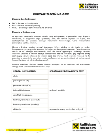 RODZAJE ZLECEŃ NA GPW Zlecenia bez limitu ceny: PKC - zlecenie po każdej cenie PCR - zlecenie po cenie rynkowej PCRO - zlecenie po cenie rynkowej na otwarcie Zlecenie z limitem ceny W tego typu zleceniach, inwestor określa cenę maksymalną, w przypadku chęci kupna i minimalną, w przypadku chęci sprzedaży, jaką jest wstanie zapłacić za kupno, lub zaakceptować za sprzedaż danego instrumentu finansowego. Cena maksymalna (minimalna) jest tzw. limitem. Zleceń z limitem powinni używać inwestorzy, którzy wiedzą co się dzieje na rynku. Priorytetem w tym przypadku jest cena, która jest ustalana przez inwestora. Zlecenie czeka w arkusz aż do pełnego zrealizowania, albo do czasu wygaśnięcia zadanego terminu ważności. Zlecenie z limitem zostaje zrealizowane dopiero wówczas, gdy napotka ofertę spełniającą warunki zlecenia (z limitem bądź bez limitu). Jeżeli warunki rynkowe na to pozwolą, to zlecenie to oczywiście może zrealizować się po cenie niższej od maksymalnej (kupno) i wyższej niż minimalna (sprzedaż). Podczas składania zlecenia należy również pamiętać, że w zależności od instrumentu istnieją różne sposoby określania limitu ceny: RODZAJ INSTRUMENTU SPOSÓB OKREŚLENIA LIMITU CENY akcje prawa poboru (PP) prawa do akcji (PDA) jednostki indeksowe w złotych polskich certyfikaty inwestycyjne kontrakty terminowe (na waluty) kontrakty terminowe (na akcje) obligacje w procentach ceny nominalnej obligacji opcje indeksowe w punktach kontrakty terminowe (na indeksy) PKC - zlecenie po każdej cenie Ten rodzaj zlecenia powinien być wybierany przede wszystkim, gdy Inwestorowi zależy na natychmiastowej i pełnej realizacji zlecenia, gdyż zawsze musi ono realizować się w całości – w innym przypadku dochodzi do równoważenia rynku. W zleceniu PKC Inwestor nie ustala limitu ceny, natomiast jest ono realizowane po najkorzystniejszej cenie, która jest dostępna w arkuszu zleceń. Zlecenia tego typu powinny być stosowane tylko wówczas, gdy Inwestor ma silne przekonanie, że ceny instrumentu gwałtownie wzrosną lub w przypadku wątpliwości, że później uda się dokonać zamierzonej transakcji. W innej sytuacji ten rodzaj zlecenia nie jest zalecany. Dodatkowo możliwe jest, że zlecenie nie będzie zrealizowane po jednej, najkorzystniejszej cenie. Wtedy transakcja zostanie dokonana przy kilku różnych (coraz mniej korzystnych) cenach. PRZYKŁAD Inwestor składa zlecenie kupna na 2500 akcji spółki "A" - jest przekonany o gwałtownym wzroście cen akcji, dlatego zależy mu na szybkiej realizacji - składa zatem zlecenie PKC. Arkusz zleceń przed transakcją wygląda następująco: liczba zleceń kupna wolumen kupna limity kupna limity sprzedaży wolumen sprzedaży liczba zleceń sprzedaży 3 1150 23,35 23,50 1500 4 5 2300 23,30 23,79 900 2 2 560 23,13 23,90 500 2 1 50 22,90 24,10 2653 3 Ponieważ Inwestor złożył zlecenie PKC, transakcja dokona się natychmiast - dokona on zakupu 2500 akcji spółki "A", z czego: 1500 akcji po 23,50; 900 akcji po 23,79 oraz 100 akcji po 23,90. Jak nietrudno zauważyć, Inwestor musiał zapłacić coraz więcej za kolejne akcje. Gdyby złożył zlecenie z limitem ceny, a jego przewidywania dotyczące wzrostu ich wartości potwierdziłby się, mógłby nie zdążyć zakupić akcji na czas. Po tej transakcji arkusz zleceń będzie wyglądał jak poniżej: liczba zleceń kupna wolumen kupna limity kupna limity sprzedaży wolumen sprzedaży liczba zleceń sprzedaży 3 1150 23,35 23,90 400 1 5 2300 23,30 24,10 2653 3 2 560 23,13 1 50 22,90 PCR - zlecenie po cenie rynkowej Działanie tego zlecenia jest podobne do zlecenia PKC. Zlecenie po cenie rynkowej wywołuje transakcję po najlepszej dostępnej cenie, a jeśli po tej cenie nie ma wystarczającej liczby dostępnych akcji do pełnej jego realizacji, zlecenie zostaje zapisane z taką ceną w arkuszu zleceń (z limitem) i oczekuje na przeciwną stronę transakcji. Zlecenie PCR jest zatem bezpieczniejsze od PKC dla Inwestora gdy priorytetem jest cena transakcji, gdyż nie jest on narażony na zakup lub sprzedaż po coraz mniej korzystnych dla siebie cenach. Jeżeli Inwestor chce mieć jednak pewność co do natychmiastowej realizacji, powinien zastosować zlecenie PKC. PRZYKŁAD Inwestor chce kupić 2000 akcji spółki "A" - tym razem decyduje się na złożenie zlecenia PCR. Dla lepszego zobrazowania różnicy pomiędzy zleceniem PKC a PCR, arkusz zleceń wygląda tak samo jak w poprzednim przykładzie: liczba zleceń kupna wolumen kupna limity kupna limity sprzedaży wolumen sprzedaży liczba zleceń sprzedaży 3 1150 23,35 23,50 1500 4 5 2300 23,30 23,79 900 2 2 560 23,13 23,90 500 2 1 50 22,90 24,10 2653 3 Inwestor złożył zlecenie PCR, więc transakcja zostanie dokonana po najlepszej cenie rynkowej. W arkuszu zleceń nie ma wystarczającej liczby akcji do sprzedaży po kursie 23,50 (najlepszej obecnie ofercie rynkowej, po której Inwestor może zakupić akcje), dlatego zlecenie nie zostanie wykonane w całości - jego pozostała część zostanie zapisana w arkuszu zleceń. Po transakcji arkusz zleceń przyjmie następującą formę: liczba zleceń kupna wolumen kupna limity kupna limity sprzedaży wolumen sprzedaży liczba zleceń sprzedaży 1 500 23,50 23,79 900 2 3 1150 23,35 23,90 500 2 5 2300 23,30 24,10 2653 3 2 560 23,13 1 50 22,90 PCRO - zlecenie po cenie rynkowej na otwarcie Zlecenie PCRO działa w sposób identyczny ze zleceniem PCR z jednym tylko wyjątkiem kurs transakcji, to tym razem jeden z poniżej wymienionych kursów: kurs otwarcia kurs zamknięcia kurs ustalony na fixingu notowań jednolitych kurs ustalony w trakcie równoważenia Który z kursów zostanie wybrany do zlecenia PCRO zależy od momentu, w którym zlecenie zostanie złożone - np. jeśli odbędzie się to w godzinach od 8:00 do 9:00 w systemie notowań ciągłych na akcje, wtedy kursem w zleceniu będzie kurs otwarcia danego waloru. Kiedy można składać poszczególne zleceni