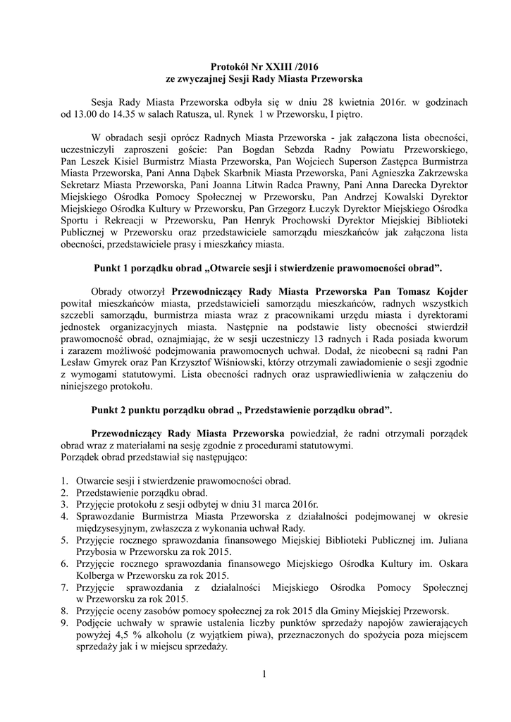 Protokół Nr XXIII /2016 ze zwyczajnej Sesji Rady Miasta Przeworska Sesja Rady Miasta Przeworska odbyła się w dniu 28 kwietnia 2016r. w godzinach od 13.00 do 14.35 w salach Ratusza, ul. Rynek 1 w Przeworsku, I piętro. W obradach sesji oprócz Radnych Miasta Przeworska - jak załączona lista obecności, uczestniczyli zaproszeni goście: Pan Bogdan Sebzda Radny Powiatu Przeworskiego, Pan Leszek Kisiel Burmistrz Miasta Przeworska, Pan Wojciech Superson Zastępca Burmistrza Miasta Przeworska, Pani Anna Dąbek Skarbnik Miasta Przeworska, Pani Agnieszka Zakrzewska Sekretarz Miasta Przeworska, Pani Joanna Litwin Radca Prawny, Pani Anna Darecka Dyrektor Miejskiego Ośrodka Pomocy Społecznej w Przeworsku, Pan Andrzej Kowalski Dyrektor Miejskiego Ośrodka Kultury w Przeworsku, Pan Grzegorz Łuczyk Dyrektor Miejskiego Ośrodka Sportu i Rekreacji w Przeworsku, Pan Henryk Prochowski Dyrektor Miejskiej Biblioteki Publicznej w Przeworsku oraz przedstawiciele samorządu mieszkańców jak załączona lista obecności, przedstawiciele prasy i mieszkańcy miasta. Punkt 1 porządku obrad „Otwarcie sesji i stwierdzenie prawomocności obrad”. Obrady otworzył Przewodniczący Rady Miasta Przeworska Pan Tomasz Kojder powitał mieszkańców miasta, przedstawicieli samorządu mieszkańców, radnych wszystkich szczebli samorządu, burmistrza miasta wraz z pracownikami urzędu miasta i dyrektorami jednostek organizacyjnych miasta. Następnie na podstawie listy obecności stwierdził prawomocność obrad, oznajmiając, że w sesji uczestniczy 13 radnych i Rada posiada kworum i zarazem możliwość podejmowania prawomocnych uchwał. Dodał, że nieobecni są radni Pan Lesław Gmyrek oraz Pan Krzysztof Wiśniowski, którzy otrzymali zawiadomienie o sesji zgodnie z wymogami statutowymi. Lista obecności radnych oraz usprawiedliwienia w załączeniu do niniejszego protokołu. Punkt 2 punktu porządku obrad „ Przedstawienie porządku obrad”. Przewodniczący Rady Miasta Przeworska powiedział, że radni otrzymali porządek obrad wraz z materiałami na sesję zgodnie z procedurami statutowymi. Porządek obrad przedstawiał się następująco: 1. 2. 3. 4. 5. 6. 7. 8. 9. Otwarcie sesji i stwierdzenie prawomocności obrad. Przedstawienie porządku obrad. Przyjęcie protokołu z sesji odbytej w dniu 31 marca 2016r. Sprawozdanie Burmistrza Miasta Przeworska z działalności podejmowanej w okresie międzysesyjnym, zwłaszcza z wykonania uchwał Rady. Przyjęcie rocznego sprawozdania finansowego Miejskiej Biblioteki Publicznej im. Juliana Przybosia w Przeworsku za rok 2015. Przyjęcie rocznego sprawozdania finansowego Miejskiego Ośrodka Kultury im. Oskara Kolberga w Przeworsku za rok 2015. Przyjęcie sprawozdania z działalności Miejskiego Ośrodka Pomocy Społecznej w Przeworsku za rok 2015. Przyjęcie oceny zasobów pomocy społecznej za rok 2015 dla Gminy Miejskiej Przeworsk. Podjęcie uchwały w sprawie ustalenia liczby punktów sprzedaży napojów zawierających powyżej 4,5 % alkoholu (z wyjątkiem piwa), przeznaczonych do spożycia poza miejscem sprzedaży jak i w miejscu sprzedaży. 1 10. Podjęcie uchwały w sprawie ustanowienia 43 pomników przyrody w Zespole PałacowoParkowym w Przeworsku na działce nr ewidencyjny 244/6. 11. Podjęcie uchwały w sprawie wyrażenia zgody na wydzierżawienie nieruchomości na czas nieoznaczony w trybie bezprzetargowym. 12. Podjęcie uchwały w sprawie wyrażenia zgody na ustanowienie służebności przesyłu. 13. Podjęcie uchwały w sprawie wyrażenia zgody na ustanowienie służebności przesyłu. 14. Podjęcie uchwały w sprawie wyrażenia zgody na ustanowienie służebności przesyłu. 15. Podjęcie uchwały w sprawie wyrażenia zgody na zawarcie umowy nieodpłatnego użyczenia. 16. Podjęcie uchwały w sprawie wyrażenia zgody na przyjęcie darowizny od Powiatu Przeworskiego. 17. Podjęcie uchwały w sprawie wyrażenia zgody na dokonanie darowizny nieruchomości na rzecz Powiatu Przeworskiego. 18. Interpelacje i zapytania radnych. 19. Odpowiedzi na interpelacje i wnioski zgłoszone na poprzednich sesjach i posiedzeniach Komisji Rady. 20. Wolne wnioski i informacje. 21. Zakończenie sesji. Punkt 3 porządku obrad „Przyjęcie protokołu z sesji odbytej w dniu 31 marca 2016r.” Przewodniczący Rady Miasta oświadczył, że protokół z sesji Rady Miasta odbytej w dniu 31 marca 2016 r. wyłożony był na posiedzeniach komisji oraz w Biurze Obsługi Rady Miasta. Zapytał radnych czy mają uwagi do sporządzonego protokołu. Wobec braku uwag do protokołu poddał przyjęcie protokołu pod głosowanie. Protokół z ww. sesji został przyjęty wynikiem głosów: za - 13, przeciw - 0, wstrzymało się - 0. Po stwierdzeniu że, protokół z sesji odbytej w dniu 31 marca 2016r. został przyjęty, Przewodniczący Rady przeszedł do kolejnego punktu porządku obrad. Punkt 4 porządku obrad „Sprawozdanie Burmistrza Miasta Przeworska z działalności podejmowanej w okresie międzysesyjnym, zwłaszcza z wykonania uchwał Rady”. Przewodniczący Rady Miasta poprosił Burmistrza Miasta Przeworska o przedstawienie sprawozdania. Burmistrz Miasta Przeworska Pan Leszek Kisiel powitał wszystkich zebranych na sesji Rady Miasta, po czym powiedział, że uchwały podjęte na sesji w dniu 31 marca 2016r są zrealizowane, bądź w trakcie realizacji. Następnie powiedział że: - w okresie międzysesyjnym przygotowane były projekty uchwał na dzisiejsze posiedzenie rady, - odbyło się spotkanie z Marszałkiem Województwa Podkarpackiego Panem Władysławem Ortylem ws. planowanej budowy nowego przebiegu drogi wojewódzkiej 835 oraz projektu kolei metropolitalnej, a w jej ramach remontu kładki i budowy parkingu przy stacji PKP, - brał udział w spotkaniu z Wicemarszałkiem Województwa Podkarpackiego Panem Bogdanem Romaniukiem ws. planowanej budowy nowego przebiegu drogi wojewódzkiej 835 i wzajemnych rozliczeń finansowych. Dodał że, droga wojewódzka nr 835 w granicach miasta ma d