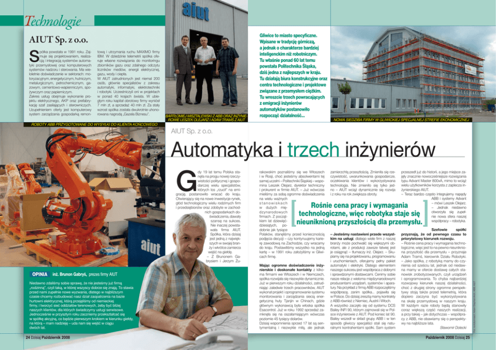 Technologie AIUT Sp. z o.o. S półka powstała w 1991 roku. Zajmuje się projektowaniem, realizacją i integracją systemów automatyki przemysłowej oraz komputerowych systemów nadzoru i sterowania. Ma wieloletnie doświadczenie w sektorach: motoryzacyjnym, energetycznym, hutniczym, metalurgicznym, petrochemicznym, gazowym, cementowo-wapienniczym, spożywczym oraz papierniczym. Zakres usług obejmuje wykonanie projektu elektrycznego, AKP oraz prefabrykację szaf zasilających i sterowniczych. Uzupełnieniem oferty jest komputerowy system zarządzania gospodarką remon- tową i utrzymania ruchu MAXIMO firmy IBM. W dziedzinie telemetrii spółka oferuje własne rozwiązania do monitoringu zbiorników gazu oraz zdalnego odczytu liczników mediów, energii elektrycznej, gazu, wody i ciepła. W AIUT zatrudnionych jest niemal 200 osób, głównie specjalistów z zakresu automatyki, informatyki, elektrotechniki i robotyki. Uczestniczyli oni w projektach w ponad 40 krajach świata. W ubiegłym roku kapitał obrotowy firmy wyniósł 7 mln zł, a sprzedaż 40 mln zł. Za stały wzrost spółka została dwukrotnie uhonorowana nagrodą „Gazela Biznesu”. Bartłomiej Misztalewski z ABB oraz inżynierowie Leszek Olejarz i Adam Tramś z AIUT Gliwice to miasto specyficzne. Wpisane w tradycję górniczą, a jednak o charakterze bardziej inteligenckim niż robotniczym. Tu właśnie ponad 60 lat temu powstała Politechnika Śląska, dziś jedna z najlepszych w kraju. Tu działają biura konstrukcyjne oraz centra technologiczne i projektowe związane z przemysłem ciężkim. Tu wreszcie trzech powracających z emigracji inżynierów automatyków postanowiło rozpocząć działalność... Nowa siedziba firmy w Gliwickiej Specjalnej Strefie Ekonomicznej Roboty ABB przygotowane do wysyłki do klienta końcowego AIUT Sp. z o.o. Automatyka i trzech inżynierów OPINIA inż. Brunon Gabryś, prezes firmy AIUT Niedawno zdaliśmy sobie sprawę, że nie jesteśmy już firmą „rodzinną”, czyli taką, w której wszyscy dobrze się znają. To stawia przed nami zupełnie nowe wyzwania, dlatego w najbliższym czasie chcemy rozbudować nasz dział zaopatrzenia na bazie hurtowni elektrycznej, którą przejęliśmy od niemieckiej firmy, i tworzyć sieć oddziałów terenowych, żeby być bliżej naszych klientów, dla których świadczymy usługi serwisowe. Jednocześnie w przyszłym roku zaczniemy przekształcać się w spółkę akcyjną, co będzie pierwszym krokiem w kierunku giełdy, na którą – mam nadzieję – uda nam się wejść w ciągu dwóch lat. 24 Dzisiaj Październik 2008 rakowskim poznaliśmy się we Włoszech i w Rosji, choć jesteśmy absolwentami tej samej uczelni – Politechniki Śląskiej – wspomina Leszek Olejarz, dyrektor techniczny i prokurent w firmie AIUT. – Już wówczas mieliśmy za sobą ogromne doświadczenia na wielu ważnych stanowiskach w dużych międzynarodowych firmach. Z początkiem lat dziewięćdziesiątych, podobnie jak tysiące Polaków, stanęliśmy przed koniecznością podjęcia decyzji – czy kontynuujemy karierę zawodową na Zachodzie, czy wracamy do kraju. Postawiliśmy wszystko na jedną kartę – w 1991 roku założyliśmy w Gliwicach firmę. zamierzchłą przeszłością. Zmieniła się rzeczywistość, uwarunkowania gospodarcze, oczekiwania klientów i wykorzystywana technologia. Nie zmieniło się tylko jedno – AIUT wciąż dynamicznie się rozwija i z roku na rok zwiększa obroty. przeszedł już do historii, a jego miejsce zajęły znacznie nowocześniejsze rozwiązania typu Advant Master 800xA, mimo to wciąż wielu użytkowników korzysta z zaplecza inżynierskiego AIUT. – Teraz bardzo często integrujemy napędy ABB i systemy Advant – mówi Leszek Olejarz. – Jednak niedawno otworzyła się zupełnie nowa sfera naszej współpracy – robotyka. Rośnie cena pracy i wymagania technologiczne, więc robotyka staje się nieuniknioną przyszłością dla przemysłu. Mając ogromne doświadczenie inżynierskie i doskonałe kontakty z kilkoma firmami we Włoszech i w Niemczech, spółka rozwijała się niezwykle dynamicznie. Już w pierwszym roku działalności, zatrudniając zaledwie trzech pracowników, AIUT wykonał projekt i oprogramowanie systemu monitorowania i zarządzania siecią energetyczną huty Tjanjin w Chinach, gdzie głównym wykonawcą była włoska spółka Esacontrol. Już w roku 1992 sprzedaż zamknęła się na oszałamiającym wówczas poziomie 45 tysięcy dolarów. Dzisiaj wspomnienia sprzed 17 lat są sentymentalną i niezwykle miłą, ale jednak – Jesteśmy nastawieni przede wszystkim na usługi, dlatego wiele firm z naszej branży może pochwalić się większymi obrotami, ale z produkcji zawsze łatwiej jest je osiągnąć – tłumaczy inż. Olejarz. – Skupiamy się na projektowaniu, programowaniu i uruchomieniach, oferujemy pełny pakiet automatyki i elektryki. Dlatego elementem naszego sukcesu jest współpraca z dobrymi i sprawdzonymi dostawcami. Cenimy sobie nasze relacje z wieloma międzynarodowymi producentami urządzeń, systemów i aparatury. Na przykład z firmą ABB rozpoczęliśmy współpracę, zanim spółka... pojawiła się w Polsce. Do dzisiaj zresztą mamy kontrakty z ABB również z Niemiec, Austrii i Włoch. A wszystko zaczęło się od systemu DCS Bailey INFI 90, którym zajmowali się w Polsce inżynierowie z AIUT. Pod koniec lat 90. Bailey wszedł w skład grupy ABB i w ten sposób gliwiccy specjaliści stali się naturalnymi kontrahentami spółki. Sam system Szefowie spółki przyznają, że od pewnego czasu to priorytetowy kierunek rozwoju. – Rośnie cena pracy i wymagania technologiczne, więc jest to na pewno nieunikniona przyszłość dla przemysłu – przyznaje Adam Tramś, kierownik Działu Robotyki. – Jako spółka, z robotyką mamy do czynienia od sześciu lat, jednak od niedawna mamy w ofercie dostawę całych stanowisk zrobotyzowanych, czyli urządzeń i oprogramowania. To chyb