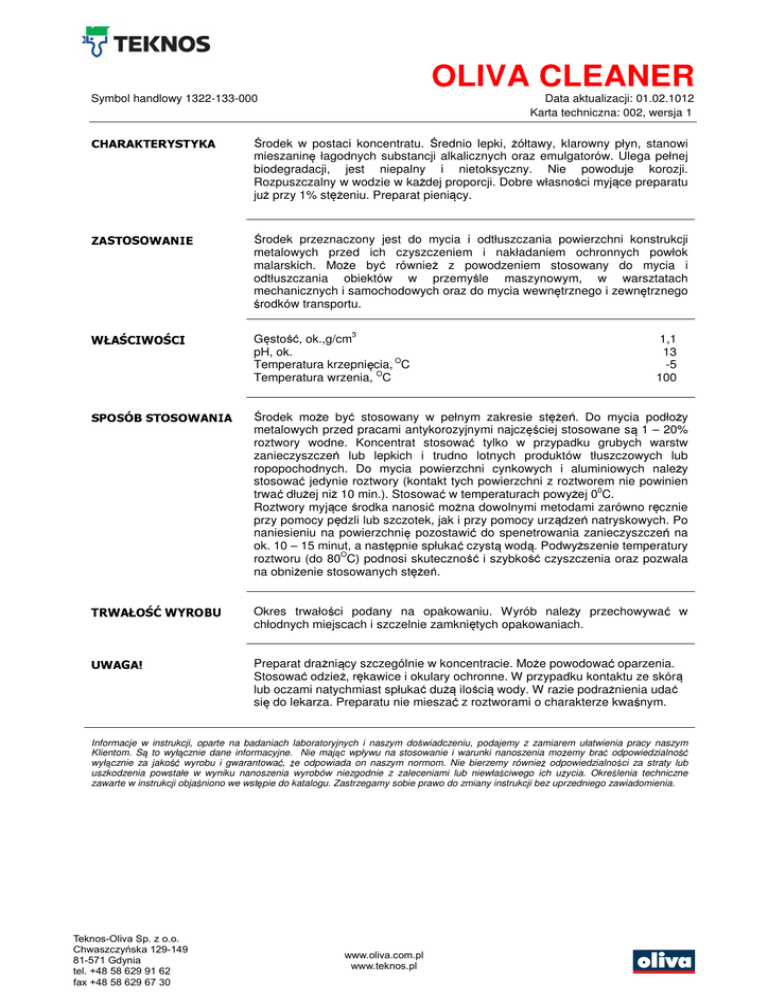 OLIVA CLEANER Symbol handlowy 1322-133-000 Data aktualizacji: 01.02.1012 Karta techniczna: 002, wersja 1 rodek w postaci koncentratu. rednio lepki, ółtawy, klarowny płyn, stanowi mieszanin łagodnych substancji alkalicznych oraz emulgatorów. Ulega pełnej biodegradacji, jest niepalny i nietoksyczny. Nie powoduje korozji. Rozpuszczalny w wodzie w ka dej proporcji. Dobre własnoci myjce preparatu ju przy 1% st eniu. Preparat pienicy. rodek przeznaczony jest do mycia i odtłuszczania powierzchni konstrukcji metalowych przed ich czyszczeniem i nakładaniem ochronnych powłok malarskich. Mo e by równie z powodzeniem stosowany do mycia i odtłuszczania obiektów w przemyle maszynowym, w warsztatach mechanicznych i samochodowych oraz do mycia wewntrznego i zewntrznego rodków transportu. Gsto, ok.,g/cm3 pH, ok. Temperatura krzepnicia, OC Temperatura wrzenia, OC rodek mo e by stosowany w pełnym zakresie st e. Do mycia podło y metalowych przed pracami antykorozyjnymi najczciej stosowane s 1 – 20% roztwory wodne. Koncentrat stosowa tylko w przypadku grubych warstw zanieczyszcze lub lepkich i trudno lotnych produktów tłuszczowych lub ropopochodnych. Do mycia powierzchni cynkowych i aluminiowych nale y stosowa jedynie roztwory (kontakt tych powierzchni z roztworem nie powinien trwa dłu ej ni 10 min.). Stosowa w temperaturach powy ej 00C. Roztwory myjce rodka nanosi mo na dowolnymi metodami zarówno rcznie przy pomocy pdzli lub szczotek, jak i przy pomocy urzdze natryskowych. Po naniesieniu na powierzchni pozostawi do spenetrowania zanieczyszcze na ok. 10 – 15 minut, a nastpnie spłuka czyst wod. Podwy szenie temperatury roztworu (do 80OC) podnosi skuteczno i szybko czyszczenia oraz pozwala na obni enie stosowanych st e. Okres trwałoci podany na opakowaniu. Wyrób nale y przechowywa w chłodnych miejscach i szczelnie zamknitych opakowaniach. Preparat dra nicy szczególnie w koncentracie. Mo e powodowa oparzenia. Stosowa odzie , rkawice i okulary ochronne. W przypadku kontaktu ze skór lub oczami natychmiast spłuka du iloci wody. W razie podra nienia uda si do lekarza. Preparatu nie miesza z roztworami o charakterze kwanym. 1,1 13 -5 100 Informacje w instrukcji, oparte na badaniach laboratoryjnych i naszym do wiadczeniu, podajemy z zamiarem ułatwienia pracy naszym Klientom. S to wył cznie dane informacyjne. Nie maj c wpływu na stosowanie i warunki nanoszenia mo emy bra odpowiedzialno wył cznie za jako wyrobu i gwarantowa , e odpowiada on naszym normom. Nie bierzemy równie odpowiedzialno ci za straty lub uszkodzenia powstałe w wyniku nanoszenia wyrobów niezgodnie z zaleceniami lub niewła ciwego ich u ycia. Okre lenia techniczne zawarte w instrukcji obja niono we wst pie do katalogu. Zastrzegamy sobie prawo do zmiany instrukcji bez uprzedniego zawiadomienia. ! ! Teknos-Oliva Sp. z o.o. Chwaszczyńska 129-149 81-571 Gdynia tel. +48 58 629 91 62 fax +48 58 629 67 30 ! " www.oliva.com.pl www.teknos.pl !