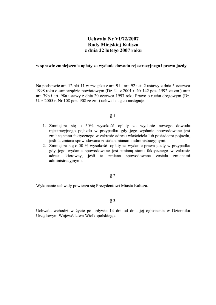 Uchwała Nr VI/72/2007 Rady Miejskiej Kalisza z dnia 22 lutego 2007 roku w sprawie zmniejszenia opłaty za wydanie dowodu rejestracyjnego i prawa jazdy Na podstawie art. 12 pkt 11 w związku z art. 91 i art. 92 ust. 2 ustawy z dnia 5 czerwca 1998 roku o samorządzie powiatowym (Dz. U. z 2001 r. Nr 142 poz. 1592 ze zm.) oraz art. 79b i art. 98a ustawy z dnia 20 czerwca 1997 roku Prawo o ruchu drogowym (Dz. U. z 2005 r. Nr 108 poz. 908 ze zm.) uchwala się co następuje: § 1. 1. Zmniejsza się o 50% wysokość opłaty za wydanie nowego dowodu rejestracyjnego pojazdu w przypadku gdy jego wydanie spowodowane jest zmianą stanu faktycznego w zakresie adresu właściciela lub posiadacza pojazdu, jeśli ta zmiana spowodowana została zmianami administracyjnymi. 2. Zmniejsza się o 50 % wysokość opłaty za wydanie prawa jazdy w przypadku gdy jego wydanie spowodowane jest zmianą stanu faktycznego w zakresie adresu kierowcy, jeśli ta zmiana spowodowana została zmianami administracyjnymi. § 2. Wykonanie uchwały powierza się Prezydentowi Miasta Kalisza. § 3. Uchwała wchodzi w życie po upływie 14 dni od dnia jej ogłoszenia w Dzienniku Urzędowym Województwa Wielkopolskiego. Uzasadnienie do uchwały Nr VI/72/2007Rady Miejskiej Kalisza z dnia 22 lutego 2007 roku w sprawie zmniejszenia opłaty za wydanie dowodu rejestracyjnego i prawa jazdy Wysokość opłaty za wydanie dowodu rejestracyjnego reguluje rozporządzenie Ministra Infrastruktury z dnia 22 grudnia 2003 roku w sprawie wysokości opłat za wydanie dowodu rejestracyjnego, pozwolenia czasowego i tablic (tablicy) rejestracyjnych pojazdów (Dz. U. Nr 230 poz. 2302 ze zm.). Aktualnie opłata ta wynosi 48 zł. Wysokość opłaty za wydanie prawa jazdy reguluje rozporządzenie Ministra Infrastruktury z dnia 11 grudnia 2003 roku w sprawie wysokości opłat i stawek wynagrodzenia za sprawdzenie kwalifikacji oraz za wydanie dokumentów w tych sprawach (Dz. U. Nr 219 poz.2162 ze zm.). Aktualnie opłata ta wynosi 70 zł. W dniu 3 stycznia 2007 r weszła w życie ustawa z dnia 17 listopada 2006 roku o zmianie ustawy o transporcie drogowym oraz o zmianie ustawy – Prawo o ruchu drogowym (Dz. U. Nr 235 poz.1701). Ustawodawca nowelizując ustawę Prawo o ruchu drogowym upoważnił radę powiatu do zmniejszenia lub zwolnienia z opłaty za wydanie dowodu rejestracyjnego pojazdu i prawa jazdy w przypadku, gdy wydanie tych dokumentów związane jest ze zmianą administracyjną adresu właściciela pojazdu czy też kierowcy. Obowiązek zgłaszania zmian danych dot. właściciela pojazdu i kierowcy wynika z ustawy z dnia 20 czerwca 1997 roku Prawo o ruchu drogowym (Dz. U. z 2005 r Nr 108 poz. 908 ze zm.)i tak zgodnie z: - art. 78 ust. 2 pkt 2 ustawy właściciel pojazdu zarejestrowanego jest zobowiązany zawiadomić w terminie 30 dni starostę o zmianie stanu faktycznego wymagającej zmiany danych zamieszczonych w dowodzie rejestracyjnym – zmiana ta skutkuje wymianą dowodu rejestracyjnego, - art. 98 ust.1 ustawy osoba posiadająca uprawnienia do kierowania pojazdem jest zobowiązana niezwłocznie zawiadomić starostę o zmianie stanu faktycznego wymagającego zmiany danych zawartych w prawie jazdy - również ta zmiana skutkuje wymianą prawa jazdy. Zmniejszenie opłat za wydanie dowodu rejestracyjnego i prawa jazdy o 50 % z jednej strony pozwoli zmniejszyć obciążenie finansowe osób wymieniających te dokumenty, a z drugiej strony pozwoli w znacznej mierze pokryć koszty wyprodukowania tych dokumentów jakie zobowiązani jesteśmy ponosić na rzecz Polskiej Wytwórni Papierów Wartościowych . Aktualnie opłaty te wynoszą za dowód rejestracyjny 20,22 zł + 22% VAT i za prawo jazdy 37,82 zł + 22% VAT.