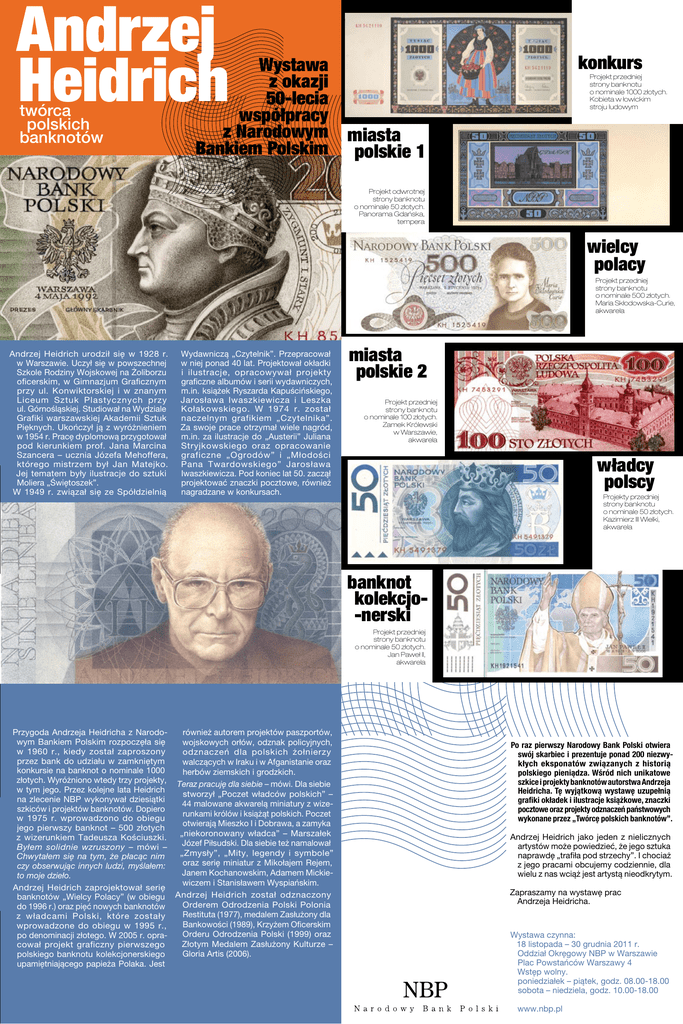 Andrzej Heidrich twórca polskich banknotów Wystawa z okazji 50-lecia współpracy z Narodowym Bankiem Polskim konkurs Projekt przedniej strony banknotu o nominale 1000 złotych. Kobieta w łowickim stroju ludowym miasta polskie 1 Projekt odwrotnej strony banknotu o nominale 50 złotych. Panorama Gdańska, tempera wielcy polacy Projekt przedniej strony banknotu o nominale 500 złotych. Maria Skłodowska-Curie, akwarela Andrzej Heidrich urodził się w 1928 r. w Warszawie. Uczył się w powszechnej Szkole Rodziny Wojskowej na Żoliborzu oficerskim, w Gimnazjum Graficznym przy ul. Konwiktorskiej i w znanym Liceum Sztuk Plastycznych przy ul. Górnośląskiej. Studiował na Wydziale Grafiki warszawskiej Akademii Sztuk Pięknych. Ukończył ją z wyróżnieniem w 1954 r. Pracę dyplomową przygotował pod kierunkiem prof. Jana Marcina Szancera – ucznia Józefa Mehoffera, którego mistrzem był Jan Matejko. Jej tematem były ilustracje do sztuki Moliera „Świętoszek”. W 1949 r. związał się ze Spółdzielnią Wydawniczą „Czytelnik”. Przepracował w niej ponad 40 lat. Projektował okładki i ilustracje, opracowywał projekty graficzne albumów i serii wydawniczych, m.in. książek Ryszarda Kapuścińskiego, Jarosława Iwaszkiewicza i Leszka Kołakowskiego. W 1974 r. został naczelnym grafikiem „Czytelnika”. Za swoje prace otrzymał wiele nagród, m.in. za ilustracje do „Austerii” Juliana Stryjkowskiego oraz opracowanie graficzne „Ogrodów” i „Młodości Pana Twardowskiego” Jarosława Iwaszkiewicza. Pod koniec lat 50. zaczął projektować znaczki pocztowe, również nagradzane w konkursach. miasta polskie 2 Projekt przedniej strony banknotu o nominale 100 złotych. Zamek Królewski w Warszawie, akwarela władcy polscy Projekty przedniej strony banknotu o nominale 50 złotych. Kazimierz III Wielki, akwarela banknot kolekcjo-nerski Projekt przedniej strony banknotu o nominale 50 złotych. Jan Paweł II, akwarela Przygoda Andrzeja Heidricha z Narodorównież autorem projektów paszportów, wym Bankiem Polskim rozpoczęła się wojskowych orłów, odznak policyjnych, w 1960 r., kiedy został zaproszony odznaczeń dla polskich żołnierzy przez bank do udziału w zamkniętym walczących w Iraku i w Afganistanie oraz konkursie na banknot o nominale 1000 herbów ziemskich i grodzkich. złotych. Wyróżniono wtedy trzy projekty, Teraz pracuję dla siebie – mówi. Dla siebie w tym jego. Przez kolejne lata Heidrich stworzył „Poczet władców polskich” – na zlecenie NBP wykonywał dziesiątki 44 malowane akwarelą miniatury z wizeszkiców i projektów banknotów. Dopiero runkami królów i książąt polskich. Poczet w 1975 r. wprowadzono do obiegu otwierają Mieszko I i Dobrawa, a zamyka jego pierwszy banknot – 500 złotych „niekoronowany władca” – Marszałek z wizerunkiem Tadeusza Kościuszki. Józef Piłsudski. Dla siebie też namalował Byłem solidnie wzruszony – mówi – „Zmysły”, „Mity, legendy i symbole” Chwytałem się na tym, że płacąc nim oraz serię miniatur z Mikołajem Rejem, czy obserwując innych ludzi, myślałem: Janem Kochanowskim, Adamem Mickieto moje dzieło. wiczem i Stanisławem Wyspiańskim. Andrzej Heidrich zaprojektował serię banknotów „Wielcy Polacy” (w obiegu Andrzej Heidrich został odznaczony Orderem Odrodzenia Polski Polonia do 1996 r.) oraz pięć nowych banknotów Restituta (1977), medalem Zasłużony dla z władcami Polski, które zostały Bankowości (1989), Krzyżem Oficerskim wprowadzone do obiegu w 1995 r., Orderu Odrodzenia Polski (1999) oraz po denominacji złotego. W 2005 r. opraZłotym Medalem Zasłużony Kulturze – cował projekt graficzny pierwszego Gloria Artis (2006). polskiego banknotu kolekcjonerskiego upamiętniającego papieża Polaka. Jest Po raz pierwszy Narodowy Bank Polski otwiera swój skarbiec i prezentuje ponad 200 niezwykłych eksponatów związanych z historią polskiego pieniądza. Wśród nich unikatowe szkice i projekty banknotów autorstwa Andrzeja Heidricha. Tę wyjątkową wystawę uzupełnią grafiki okładek i ilustracje książkowe, znaczki pocztowe oraz projekty odznaczeń państwowych wykonane przez „Twórcę polskich banknotów”. Andrzej Heidrich jako jeden z nielicznych artystów może powiedzieć, że jego sztuka naprawdę „trafiła pod strzechy”. I chociaż z jego pracami obcujemy codziennie, dla wielu z nas wciąż jest artystą nieodkrytym. Zapraszamy na wystawę prac Andrzeja Heidricha. Wystawa czynna: 18 listopada – 30 grudnia 2011 r. Oddział Okręgowy NBP w Warszawie Plac Powstańców Warszawy 4 Wstęp wolny. poniedziałek – piątek, godz. 08.00-18.00 sobota – niedziela, godz. 10.00-18.00 www.nbp.pl Projekt konkursowego banknotu o nominale 1000 złotych autorstwa Andrzeja Heidricha. Kobieta w łowickim stroju ludowym.