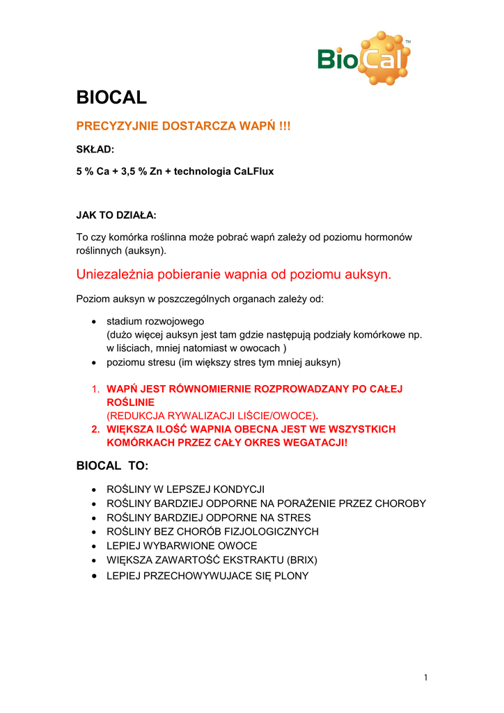BIOCAL PRECYZYJNIE DOSTARCZA WAPŃ !!! SKŁAD: 5 % Ca + 3,5 % Zn + technologia CaLFlux JAK TO DZIAŁA: To czy komórka roślinna może pobrać wapń zależy od poziomu hormonów roślinnych (auksyn). Uniezależnia pobieranie wapnia od poziomu auksyn. Poziom auksyn w poszczególnych organach zależy od: stadium rozwojowego (dużo więcej auksyn jest tam gdzie następują podziały komórkowe np. w liściach, mniej natomiast w owocach ) poziomu stresu (im większy stres tym mniej auksyn) 1. WAPŃ JEST RÓWNOMIERNIE ROZPROWADZANY PO CAŁEJ ROŚLINIE (REDUKCJA RYWALIZACJI LIŚCIE/OWOCE). 2. WIĘKSZA ILOŚĆ WAPNIA OBECNA JEST WE WSZYSTKICH KOMÓRKACH PRZEZ CAŁY OKRES WEGATACJI! BIOCAL TO: ROŚLINY W LEPSZEJ KONDYCJI ROŚLINY BARDZIEJ ODPORNE NA PORAŻENIE PRZEZ CHOROBY ROŚLINY BARDZIEJ ODPORNE NA STRES ROŚLINY BEZ CHORÓB FIZJOLOGICZNYCH LEPIEJ WYBARWIONE OWOCE WIĘKSZA ZAWARTOŚĆ EKSTRAKTU (BRIX) LEPIEJ PRZECHOWYWUJACE SIĘ PLONY GŁÓWNE ZASTOSOWANIA: WARZYWA KAPUSTA PEKIŃSKA, GŁOWIASTA, BRUKSELKA, KALAFIOR o OGRANICZENIE TIPBURNU o BARDZIEJ RÓWNOMIERNY WZROST o LEPSZE PRZECHOWYWANIE SAŁATY o ELIMINACJA ZAMIERANIA BRZEGÓW LIŚCI o DŁUŻSZE PRZECHOWYWANIE SELER o ELIMINACJA SUCHEJ ZGNILIZNY LIŚCI SERCOWYCH POMIDOR o ELIMINACJA SUCHEJ ZGNILIZNY o WIĘKSZA ZAWARTOŚĆ EKSTRAKTU (BRIX) o LEPSZE WYRÓWNANIE PAPRYKA o ELIMINACJA SUCHEJ ZGNILIZNY OGÓREK o LEPSZA JĘDRNOŚĆ OWOCÓW o WYRÓWNANIE PLONU SADOWNICTWO TRUSKAWKA o MNIEJSZE PORAŻENIE PRZEZ SZARĄ PLEŚŃ o WIĘKSZA JĘDRNOŚĆ o WIĘKSZA ZAWARTOŚĆ EKSTRAKTU (BRIX) o LEPSZE WYRÓWNANIE o DUŻO WIĘKSZA TRWAŁOŚĆ W TRANSPORCIE MALINA o MNIEJSZE PORAŻENIE PRZEZ SZARĄ PLEŚŃ o WIĘKSZA JĘDRNOŚĆ o WIĘKSZA ZAWARTOŚĆ EKSTRAKTU (BRIX) o LEPSZE WYRÓWNANIE o DUŻO WIĘKSZA TRWAŁOŚĆ W TRANSPORCIE ŚLIWA o LEPSZE WYRÓWNANIE PLONU o LEPSZA JĘDRNOŚĆ o DŁUŻSZE PRZECHOWYWANIE GRUSZA o ELIMINACJA CHORÓB FIZJOLOGICZNYCH o LEPSZE WŁAŚCIWOŚCI PRZECHOWALNICZE CZEREŚNIA o POPRAWA ODPORNOŚCI NA PĘKANIE o LEPSZE WYRÓWNANIE PLONU o LEPSZE WŁAŚCIWOŚCI PRZECHOWALNICZE JABŁOŃ o ELIMINACJA CHORÓB FIZJOLOGICZNYCH o LEPSZE PRZECHOWYWANIE o MNIEJSZE STRATY JĘDRNOŚCI PODCZAS PRZECHOWYWANIA o LEPSZE WYBARWIENIE OWOCÓW POPRAWA WYBARWIENIA OWOCÓW MOŻE ZOSTAĆ ZAKŁÓCONA PRZEZ INNE NAWOZY DOLISTNE STOSOWANE W TRAKCIE SEZONU WEGETACYJNEGO! W PRZYPADKU STOSOWANIA BIOCAL'u ORAZ SALETRY WAPNIOWEJ, NIE UZYSKAMY EFEKTU POPRAWY WYBARWIENIA A WRĘCZ MOŻE WYSTAPIĆ JEGO POGORSZENIE! JEST TO ZWIĄZANE Z WYJĄTKOWO DOBRYM WYKORZYSTANIEM JONÓW NO3, KTÓRE POBUDZAJA ROŚLINĘ DO CIĄGŁEGO WZROSTU ! DLACZEGO BIOCAL ? ZWIĘKSZA ZAWARTOŚĆ WAPNIA TAM GDZIE INNI NIE MOGĄ DOTRZEĆ !!! ZALECENIA STOSOWANIA: JABŁONIE: DAWKA 1L/HA 1. 20-30% OTWARTYCH KWIATÓW 2. BEZPOŚREDNIO PO KWITNIENIU (w przypadku braku możliwości wykonania 1 zabiegu, 2 zabieg powinien być wykonany w podwójnej dawce !) 3. 30 DNI PO KWITNIENIU 4. 30 DNI PRZED ZBIOREM PESTKOWE: DAWKA 1 L/HA 1. 2. 3. 4. BIAŁY PĄK OPADANIE PŁATKÓW WZROST ZAWIĄZKÓW 30 DNI PRZED ZBIOREM TRUSKAWKA, MALINA : DAWKA 1L/HA 1. OD POCZATKU KWITNIENIA CO 10 - 14 DNI (MOŻNA ŁACZYĆ Z FUNGICYDAMI NP. POLYVERSUM) KAPUSTNE: DAWKA 1,5L/HA 1. PODLEWANIE ROZSADY – stężenie ok. 0,35% 2. PRZED ZAMKNIĘCIEM GŁÓWEK 3. 2 TYGODNIE PO ZAMKNIĘCIU GŁÓWEK W PRZYPADKU SPODZIEWANEGO WYSTAPIENIA WARUNKÓW KORZYSTNYCH DLA POJAWIENIA SIĘ TIPBURNU NALEŻY WYKONAĆ DODATKOWY ZABIEG PRZED WYSTAPIENIEM TYCH WARUNKÓW ! POMIDOR: DAWKA 1l/HA 1. 2 – 3 ZABIEGI OD POCZĄTKU KWITNIENIA W ODSTEPACH CO 14 DNI MOŻNA MIESZAĆ ZE ŚRODKAMI OCHRONY ROŚLIN I NAWOZAMI DOLISTNYMI NA OGÓLNYCH ZASADACH STOSOWANYCH W MIESZANIU NAWOZÓW.