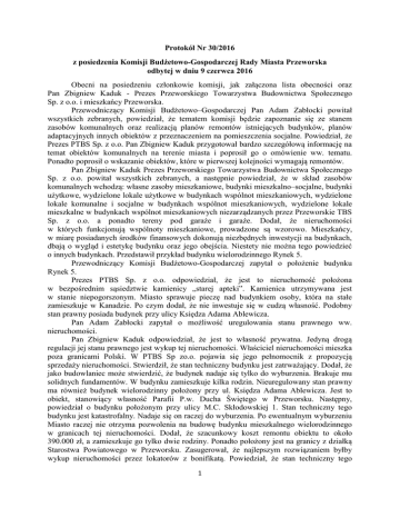 Protokół Nr 30/2016 z posiedzenia Komisji Budżetowo-Gospodarczej Rady Miasta Przeworska odbytej w dniu 9 czerwca 2016 Obecni na posiedzeniu członkowie komisji, jak załączona lista obecności oraz Pan Zbigniew Kaduk - Prezes Przeworskiego Towarzystwa Budownictwa Społecznego Sp. z o.o. i mieszkańcy Przeworska. Przewodniczący Komisji Budżetowo–Gospodarczej Pan Adam Zabłocki powitał wszystkich zebranych, powiedział, że tematem komisji będzie zapoznanie się ze stanem zasobów komunalnych oraz realizacją planów remontów istniejących budynków, planów adaptacyjnych innych obiektów z przeznaczeniem na pomieszczenia socjalne. Powiedział, że Prezes PTBS Sp. z o.o. Pan Zbigniew Kaduk przygotował bardzo szczegółową informację na temat obiektów komunalnych na terenie miasta i poprosił go o omówienie ww. tematu. Ponadto poprosił o wskazanie obiektów, które w pierwszej kolejności wymagają remontów. Pan Zbigniew Kaduk Prezes Przeworskiego Towarzystwa Budownictwa Społecznego Sp. z o.o. powitał wszystkich zebranych, a następnie powiedział, że w skład zasobów komunalnych wchodzą: własne zasoby mieszkaniowe, budynki mieszkalno–socjalne, budynki użytkowe, wydzielone lokale użytkowe w budynkach wspólnot mieszkaniowych, wydzielone lokale komunalne i socjalne w budynkach wspólnot mieszkaniowych, wydzielone lokale mieszkalne w budynkach wspólnot mieszkaniowych niezarządzanych przez Przeworskie TBS Sp. z o.o. a ponadto tereny pod garaże i garaże. Dodał, że nieruchomości w których funkcjonują wspólnoty mieszkaniowe, prowadzone są wzorowo. Mieszkańcy, w miarę posiadanych środków finansowych dokonują niezbędnych inwestycji na budynkach, dbają o wygląd i estetykę budynku oraz jego obejścia. Niestety nie można tego powiedzieć o innych budynkach. Przedstawił przykład budynku wielorodzinnego Rynek 5. Przewodniczący Komisji Budżetowo-Gospodarczej zapytał o położenie budynku Rynek 5. Prezes PTBS Sp. z o.o. odpowiedział, że jest to nieruchomość położona w bezpośrednim sąsiedztwie kamienicy „starej apteki”. Kamienica utrzymywana jest w stanie niepogorszonym. Miasto sprawuje pieczę nad budynkiem osoby, która na stałe zamieszkuje w Kanadzie. Po czym dodał, że nie inwestuje się w cudzą własność. Podobny stan prawny posiada budynek przy ulicy Księdza Adama Ablewicza. Pan Adam Zabłocki zapytał o możliwość uregulowania stanu prawnego ww. nieruchomości. Pan Zbigniew Kaduk odpowiedział, że jest to własność prywatna. Jedyną drogą regulacji jej stanu prawnego jest wykup tej nieruchomości. Właściciel nieruchomości mieszka poza granicami Polski. W PTBS Sp zo.o. pojawia się jego pełnomocnik z propozycją sprzedaży nieruchomości. Stwierdził, że stan techniczny budynku jest zatrważający. Dodał, że jako budowlaniec może stwierdzić, że budynek nadaje się tylko do wyburzenia. Brakuje mu solidnych fundamentów. W budynku zamieszkuje kilka rodzin. Nieuregulowany stan prawny ma również budynek wielorodzinny położony przy ul. Księdza Adama Ablewicza. Jest to obiekt, stanowiący własność Parafii P.w. Ducha Świętego w Przeworsku. Następny, powiedział o budynku położonym przy ulicy M.C. Skłodowskiej 1. Stan techniczny tego budynku jest katastrofalny. Nadaje się on raczej do wyburzenia. Po ewentualnym wyburzeniu Miasto raczej nie otrzyma pozwolenia na budowę budynku mieszkalnego wielorodzinnego w granicach tej nieruchomości. Dodał, że szacunkowy koszt remontu obiektu to około 390.000 zł, a zamieszkuje go tylko dwie rodziny. Ponadto położony jest na granicy z działką Starostwa Powiatowego w Przeworsku. Zasugerował, że najlepszym rozwiązaniem byłby wykup nieruchomości przez lokatorów z bonifikatą. Powiedział, że stan techniczny tego 1 budynku jest stale monitorowany, na dzień dzisiejszy jest on dostateczny. Następnie przeszedł do omówienia stanu technicznego budynku położonego przy ulicy Słowackiego 36. Powiedział, że jest to drewniany budynek zachowany w stanie „ niepogorszonym”. Ze względu na rodzaj konstrukcji oraz wiek budynku remont kapitalny jest nieuzasadniony. Prezes Przeworskiego Towarzystwa Budownictwa Społecznego Sp. z o.o. powiedział, że jedynym budynkiem, w który można zainwestować, jest nieruchomość położona przy ulicy Lwowskiej 19. Budynek zamieszkuje kilka rodzin. Jego remont wyszacowano na około 220.000 zł. W zakres prac niezbędnych do wykonania wchodzi : wykonanie izolacji p. wilg. poziomych i pionowych, remont ścian konstrukcyjnych, częściowa wymiana i naprawa więźby dachowej, wymiana poszycia dachowego z obróbkami blacharskimi, przebudowa kominów, remont elewacji, wymiana stolarki okiennej i drzwiowej. Po czym przeszedł do omówienia stanu technicznego budynków Kasztanowa 1A i 1B. Powiedział, że są to baraki typu „Skopje”. Budynki miały być użytkowane praz krótki okres czasu. PTBS Sp. z o.o. nie widzi zasadności ponoszenia kosztów związanych z gruntownym remontem oraz modernizacją tych obiektów. Poinformował, że w trakcie kontroli Państwowej Straży Pożarnej stwierdzono, że baraki nie są obiektem przeznaczonym do celów mieszkalnych. Przygotowywana jest ekspertyza potwierdzająca ich stan techniczny. Wyjaśnił, że obiekty są utrzymywane w stanie „niepogorszonym”, ich stan techniczny określa się jako dostateczny. Pozwala to na ich użytkowanie z tendencją do powolnego wykwaterowania. Powiedział, że obecnie remontowanym budynkiem jest nieruchomość położona przy ulicy Krakowskiej 21. W roku 2014 obiekt objęto programem remontu kapitalnego. W 2015 roku dokonano naprawy więźby dachowej wraz z całkowitą wymianą poszycia dachowego z obróbkami i przemurowywaniem kominów. Prace wykonano z własnych środków PTBS Sp. z o.o. oraz dotacji od WPKZ w Przemyślu w wysokości 20 000 zł, za łączną kwotę 78 000 zł. Dodał, że w roku 2016 planuje się wykonanie remontu fundamentów wraz z iz