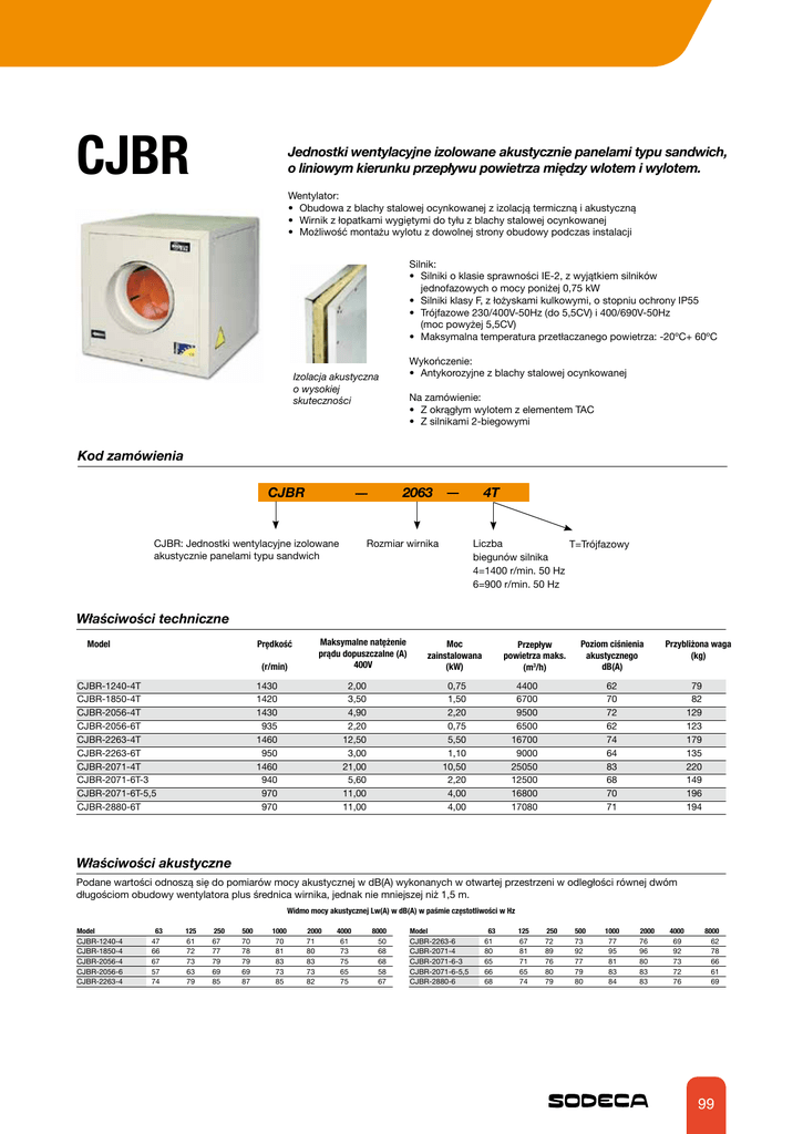 CJBR Jednostki wentylacyjne izolowane akustycznie panelami typu sandwich, o liniowym kierunku przepływu powietrza między wlotem i wylotem. Wentylator: • Obudowa z blachy stalowej ocynkowanej z izolacją termiczną i akustyczną • Wirnik z łopatkami wygiętymi do tyłu z blachy stalowej ocynkowanej • Możliwość montażu wylotu z dowolnej strony obudowy podczas instalacji Silnik: • Silniki o klasie sprawności IE-2, z wyjątkiem silników jednofazowych o mocy poniżej 0,75 kW • Silniki klasy F, z łożyskami kulkowymi, o stopniu ochrony IP55 • Trójfazowe 230/400V-50Hz (do 5,5CV) i 400/690V-50Hz (moc powyżej 5,5CV) • Maksymalna temperatura przetłaczanego powietrza: -20ºC+ 60ºC Wykończenie: • Antykorozyjne z blachy stalowej ocynkowanej Izolacja akustyczna o wysokiej skuteczności Na zamówienie: • Z okrągłym wylotem z elementem TAC • Z silnikami 2-biegowymi Kod zamówienia CJBR 2063 CJBR: Jednostki wentylacyjne izolowane akustycznie panelami typu sandwich 4T Rozmiar wirnika Liczba T=Trójfazowy biegunów silnika 4=1400 r/min. 50 Hz 6=900 r/min. 50 Hz Właściwości techniczne Model Prędkość (r/min) CJBR-1240-4T CJBR-1850-4T CJBR-2056-4T CJBR-2056-6T CJBR-2263-4T CJBR-2263-6T CJBR-2071-4T CJBR-2071-6T-3 CJBR-2071-6T-5,5 CJBR-2880-6T Maksymalne natężenie prądu dopuszczalne (A) 400V 1430 1420 1430 935 1460 950 1460 940 970 970 2,00 3,50 4,90 2,20 12,50 3,00 21,00 5,60 11,00 11,00 Moc zainstalowana (kW) Przepływ powietrza maks. (m3/h) 0,75 1,50 2,20 0,75 5,50 1,10 10,50 2,20 4,00 4,00 Poziom ciśnienia akustycznego dB(A) 4400 6700 9500 6500 16700 9000 25050 12500 16800 17080 Przybliżona waga (kg) 62 70 72 62 74 64 83 68 70 71 79 82 129 123 179 135 220 149 196 194 Właściwości akustyczne Podane wartości odnoszą się do pomiarów mocy akustycznej w dB(A) wykonanych w otwartej przestrzeni w odległości równej dwóm długościom obudowy wentylatora plus średnica wirnika, jednak nie mniejszej niż 1,5 m. Widmo mocy akustycznej Lw(A) w dB(A) w paśmie częstotliwości w Hz Model CJBR-1240-4 CJBR-1850-4 CJBR-2056-4 CJBR-2056-6 CJBR-2263-4 63 47 66 67 57 74 125 61 72 73 63 79 250 67 77 79 69 85 500 70 78 79 69 87 1000 70 81 83 73 85 2000 71 80 83 73 82 4000 61 73 75 65 75 8000 50 68 68 58 67 Model CJBR-2263-6 CJBR-2071-4 CJBR-2071-6-3 CJBR-2071-6-5,5 CJBR-2880-6 63 61 80 65 66 68 125 67 81 71 65 74 250 72 89 76 80 79 500 73 92 77 79 80 1000 77 95 81 83 84 2000 76 96 80 83 83 4000 69 92 73 72 76 8000 62 78 66 61 69 99 Wymiary w mm Model CJBR-1240-6T CJBR-1850-4T CJBR-1850-6T CJBR-2056-4T CJBR-2056-6T CJBR-2263-4T CJBR-2263-6T CJBR-2071-4T CJBR-2071-6T-3 CJBR-2071-6T-5’5 CJBR-2880-6T Krzywe charakterystyczne Q= Przepływ powietrza w m /h, m /s i CFM. 3 3 A 800 800 800 925 925 1000 925 1060 1000 1060 1060 B C D E F 800 400 400 700 640 800 400 400 700 640 800 400 400 700 640 925 462,5 450 825 765 925 462,5 450 825 765 1000 500 630 900 840 925 462,5 560 825 765 1060 530 710 960 900 1000 500 630 900 840 1060 530 710 960 900 1060 530 710 960 900 Akcesoria Pe= Ciśnienie statyczne w mmH2O, Pa i InWG. Patrz rozdział dotyczący akcesoriów. 4T=1500 r/min INT RFT AET 6T=1000 r/min 100 C2V AR
