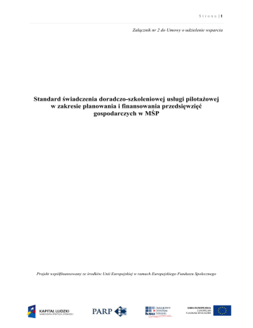 Str o na |1 Załącznik nr 2 do Umowy o udzielenie wsparcia Standard świadczenia doradczo-szkoleniowej usługi pilotażowej w zakresie planowania i finansowania przedsięwzięć gospodarczych w MŚP Projekt współfinansowany ze środków Unii Europejskiej w ramach Europejskiego Funduszu Społecznego Str o na |2 Standard świadczenia doradczo-szkoleniowej usługi pilotażowej w zakresie planowania i finansowania przedsięwzięć gospodarczych w MŚP Definicja: Usługa pilotażowa – doradczo-szkoleniowa usługa pilotażowa w zakresie planowania i finansowania przedsięwzięć gospodarczych w MŚP, powiązana z dostosowaną do potrzeb mikro, małych i średnich przedsiębiorstw Ofertą finansowania zwrotnego, realizowana zgodnie ze Standardem. Usługa pilotażowa ma na celu pomoc MŚP w zarządzaniu przedsięwzięciem gospodarczym, które jest finansowane przy wykorzystaniu produktu finansowego (kredyt, leasing), dostosowanego w ramach projektu przez współpracujące Instytucje Finansowe. Realizacja finansowanego przedsięwzięcia, w tym pomoc doradczo-szkoleniowa, powinna pomóc przedsiębiorcom w procesie przechodzenia ze skali mikro do poziomu małych przedsiębiorstw lub z poziomu przedsiębiorstw małych do średnich. Finansowanie zwrotne - kapitał zewnętrzny przekazany przedsiębiorcy w formie kredytu, pożyczki lub leasingu, z obowiązkiem jego zwrotu po upływie określonego terminu, na określonych w umowie o udzielenie finansowania zwrotnego warunkach. Instytucja finansowa (IF) – instytucja/podmiot udzielający finansowania zwrotnego, która podpisała z PARP porozumienie o współpracy w zakresie zapewnienia dostosowanej do potrzeb i możliwości MŚP Oferty finansowania zwrotnego, powiązanej z doradczo-szkoleniową usługą pilotażową w zakresie planowania i finansowania przedsięwzięć gospodarczych w MŚP w ramach projektu systemowego PARP pt. „Planowanie działań w MŚP a finansowanie zwrotne”. Lista IF współpracujących w ramach projektu może się zmieniać w związku z dołączaniem w czasie jego realizacji nowych instytucji zainteresowanych dostosowaniem Ofert finansowania zwrotnego do potrzeb i możliwości MŚP. Aktualna lista IF będzie publikowana na stronach PARP pod adresem: http://pokl.parp.gov.pl/ w zakładce dot. projektu systemowego PARP pt. „Planowanie działań w MŚP a finansowanie zwrotne”. Oferta finansowania zwrotnego (Oferta FZ) – produkty finansowe (np. kredyt, leasing), przedstawione w Załączniku nr 1 do Standardu (Opis Ofert FZ), przeznaczone na realizację określonego przedsięwzięcia gospodarczego w MŚP, dostosowane przez IF w ramach porozumienia z PARP do potrzeb i możliwości MŚP. Dostosowanie Oferty do potrzeb i możliwości MSP w porównaniu z innymi oferowanymi przez daną IF komercyjnymi produktami/ofertami finansowania zwrotnego polega na spełnieniu przez tę Ofertę co najmniej jednego z poniższych warunków: 1) niższe parametry cenowe oferty (np. marża, prowizja, opłata za rozpatrzenie wniosku); 2) zwiększona dostępność dla sektora MŚP (poprzez złagodzenie wymogów formalnych stawianych podmiotom ubiegającym się o finansowanie, udostępnienie danego finansowania podmiotom, dla których dotychczas nie było ono dostępne, np. podmiotom działającym krócej niż 18 miesięcy); 3) złagodzone warunki wymaganego zabezpieczenia zwrotu finansowania (np. rodzaj zabezpieczenia, stosunek wartości zabezpieczeń do zaciągniętego zobowiązania, wartość LTV w przypadku zabezpieczenia hipotecznego); 4) krótszy okres rozpatrywania wniosku o uzyskanie finansowania. Przed wprowadzeniem Oferty do Projektu PARP dokonuje analizy przedstawionej Oferty w odniesieniu do innych dostępnych na rynku oraz jej komplementarności z dotychczas dostępnymi w Projekcie Ofertami FZ. Przedsięwzięcie gospodarcze – inwestycja, projekt lub inna działalność przedsiębiorstwa o określonym celu, czasie i miejscu realizacji oraz planie działań, służące rozwojowi przedsiębiorstwa, zaplanowane i wdrażane w oparciu o biznesplan. W przedmiotowym projekcie Str o na |3 przedsięwzięcie gospodarcze będzie finansowane lub współfinansowane ze środków pochodzących z Oferty FZ, a przedsiębiorstwo je podejmujące otrzyma pomoc doradczo-szkoleniową w zarządzaniu tym przedsięwzięciem zgodnie z biznesplanem. I. Zasady realizacji usługi pilotażowej w zakresie planowania i finansowania przedsięwzięć gospodarczych w MŚP Usługa pilotażowa świadczona w ramach projektu jest dostępna dla przedsiębiorstw sektora MŚP, które w ciągu ostatnich 3 lat (liczonych do dnia złożenia Wniosku o udzielenie wsparcia) nie korzystały z finansowania zwrotnego na realizację przedsięwzięć gospodarczych (z wyłączeniem kredytów konsumpcyjnych i kredytów w rachunku bieżącym). Możliwość udziału w projekcie średnich firm dotyczy tzw. „małych-średnich”, czyli firm zatrudniających mniej niż 100 pracowników. Ponadto objęcie usługą średnich firm każdorazowo wymaga przedstawienia przez PW do PARP uzasadnienia zawierającego analizę potrzeb danej firmy i wykazanie potrzeby skorzystania przez nią z usługi doradczo-szkoleniowej i dostosowanej Oferty finansowania zwrotnego (np. z uwagi na aktualną sytuację organizacyjną lub finansową firmy, dotychczasowe trudności w pozyskaniu finansowania zwrotnego spowodowane brakiem dostosowanej oferty, skutkujące pogarszaniem się sytuacji firmy/ograniczeniami możliwości rozwoju itp.) oraz wymaga akceptacji PARP. Jednocześnie średnie firmy nie mogą stanowić więcej niż 20% Klientów obsłużonych w ramach danej umowy z PW. 1. 2. 3. 4. 5. Opis Ofert FZ wraz ze szczegółowymi warunkami ich udzielania stanowi Załącznik nr 1 do Standardu. Szczegółowy zakres usługi pilotażowej dla danego Klienta zostanie określony w umowie pomiędzy usługodawcą (PW) i Klientem i będzie polegać akceptacji PARP. Umowa, o której mowa w pkt. 2 reguluje szczegółowy zakr