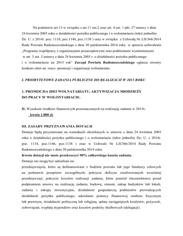Na podstawie art.13 w związku z art.11 ust.2 oraz art. 4 ust. 1 pkt. 27 ustawy z dnia 24 kwietnia 2003 roku o działalności pożytku publicznego i o wolontariacie (tekst jednolity Dz. U. z 2014r. poz. 1118, poz.1146, poz.1138 ) oraz w związku z Uchwałą Nr LII/366/2014 Rady Powiatu Radomszczańskiego z dnia 30 października 2014 roku w sprawie uchwalenia „Programu współpracy z organizacjami pozarządowymi oraz podmiotami wymienionymi w art. 3 ust. 3 ustawy z dnia 24 kwietnia 2003 r. o działalności pożytku publicznego i o wolontariacie na 2015 rok” Zarząd Powiatu Radomszczańskiego ogłasza otwarty konkurs ofert na rzecz promocji i organizacji wolontariatu. I. PRIORYTETOWE ZADANIA PUBLICZNE DO REALIZACJI W 2015 ROKU 1. PROMOCJIA IDEI WOLNATARIATU, AKTYWIZACJA MłODZIEŻY DO PRACY W WOLONTARIACIE. II. Wysokość środków finansowych przeznaczonych na realizację zadania w 2015r. kwota 1.000 zł. III. ZASADY PRZYZNAWANIA DOTACJI Dotacje będą przyznawane na warunkach określonych w ustawie z dnia 24 kwietnia 2003 roku o działalności pożytku publicznego i o wolontariacie (tekst jednolity Dz. U. z 2014r. poz. 1118, poz.1146, poz.1138 ) oraz w Uchwale Nr LII/366/2014 Rady Powiatu Radomszczańskiego z dnia 30 października 2014 roku. Kwota dotacji nie może przekroczyć 90% całkowitego kosztu zadania. Dotacje nie mogą być udzielone na: przedsięwzięcia, które są dofinansowane z budżetu powiatu lub jego funduszy celowych na podstawie przepisów szczególnych, pokrycie deficytu zrealizowanych wcześniej przedsięwzięć, pokrycie kosztów realizacji zadania, które poniósł zleceniobiorca przed podpisaniem umowy na realizację zadania, budowę, remont, zakup budynków lub lokali, zadania i zakupy inwestycyjne, działalność gospodarczą podmiotów prowadzących działalność pożytku publicznego, udzielanie pomocy finansowej osobom fizycznym lub prawnym, działalność polityczną lub religijną, spłatę zaciągniętych kredytów, pożyczek, zobowiązań, wypłatę stypendiów oraz kosztów podróży służbowych (delegacji). W konkursie mogą wziąć udział podmioty uprawnione na podstawie ustawy o działalności pożytku publicznego i o wolontariacie. IV. TERMIN I WARUNKI REALIZACJI ZADANIA Do konkursu mogą być składane oferty, których realizacja zadania rozpocznie się nie wcześniej niż w dniu podpisania umowy i zakończy nie później niż 31.12.2015r. OPIS ZADANIA : Przedmiotem konkursu są działania mające na celu promocję wartości wolontariatu i korzyści z niego płynących , wzmocnienie systemowego podejścia do wolontariatu, kreowanie mody na wolontariat wśród młodzieży , ukierunkowane w szczególności na : a) promocję idei wolontariatu wśród młodzieży , b) aktywizacja młodzieży do pracy w wolontariacie, c) budowanie sieci wymiany doświadczeń w zakresie wolontariatu i inicjatyw lokalnych, d) zwiększenie liczby inicjatyw lokalnych angażujących wolontariuszy – młodzież, mieszkańców, instytucje samorządowe i pomocowe we wspólnym działaniu, e) wolontariat jako integracja pokoleń, f) wolontariat sportowy, g) wolontariat – pierwszy krok na rynek pracy, h) wolontariat pracowniczy. WARUNKI REALIZACJI ZADANIA: Zadanie powinno być realizowane z najwyższą starannością, zgodnie z zawartą umową, obowiązującymi przepisami i standardami. W trakcie realizacji zadania : a) oferent zapewnia niezbędną bazę lokalową ( własną lub użyczoną ) przystosowaną do realizacji zadania, b) oferent zapewnia uczestnikom zadania bezpieczeństwo podczas jego realizacji, c) oferent zapewnia promocję zadania i przeznaczenie na nią co najmniej 3% przyznanej dotacji, d) przedmiot dofinansowania stanowią: koszty poniesione z tytułu zakupu materiałów bezpośrednio służącym realizacji zadania, zakupu usług transportowych i poligraficznych oraz koszty poniesione z tytułu promocji zadania, e) przesunięcia pomiędzy zaplanowanymi rodzajami kosztów nie mogą przekroczyć ogółem 10% przyznanej dotacji, f) wysoką merytoryką wartości przedsięwzięcia, g ) aktywny udział uczestników zajęć w realizowanym zadaniu. W wyniku rozstrzygnięcia Zarząd Powiatu Radomszczańskiego może zlecić wykonanie zadania publicznego jednemu lub kilku podmiotom w granicach łącznej kwoty przeznaczonej na zadanie. W przypadku otrzymania niższej niż wnioskowana kwota oferent zobowiązany jest do przedłożenia korekty kalkulacji przewidywanych kosztów realizacji zadania oraz ewentualnej korekty harmonogramu realizacji zadania . Oferent może zrezygnować z realizacji zadania w formie pisemnej. IV. TERMIN SKŁADANIA OFERT Termin składania ofert do dnia: 25 luty 2015r. (decyduje data wpływu do Starostwa Powiatowego w Radomsku). Oferty należy składać do Starostwa Powiatowego w Radomsku, ul. Leszka Czarnego 22, Biuro Obsługi Klienta - parter, w poniedziałek, wtorek, środę i piątek w godz. 7.30 – 15.30, w czwartek w godz. 7.30 – 16.30. V. TERMIN, TRYB I KRYTERIA STOSOWANE PRZY DOKONYWANIU WYBORU OFERTY 1. Termin dokonania wyboru oferty do dnia: 13 marca 2015r. 2. Komisja działa na zasadach przyjętych w programie współpracy z organizacjami pozarządowymi oraz podmiotami wymienionymi w art. 3 ust. 3 ustawy z dnia 24 kwietnia 2003 r. o działalności pożytku publicznego i o wolontariacie na 2015 rok, który stanowi załącznik do Uchwały Radomszczańskiego. Nr LII/366/2014 z dnia 30.10.2014r. Rady Powiatu 3. Przy wyborze ofert będą brane pod uwagę następujące kryteria: a) możliwość realizacji zadania publicznego przez organizację, b) merytoryczna wartość oferty, proponowana jakość zadania c) budżet zadania, a w nim: przedstawioną kalkulację kosztów realizacji zadania w tym w odniesieniu do zakresu rzeczowego zadania, wysokość wkładu własnego, współudział innych źródeł finansowania, d) możliwość wykonania zadania przez podmiot przedstawiający ofertę, tzn.: zasoby rzeczowe oraz kwalifikacje osób bezpo