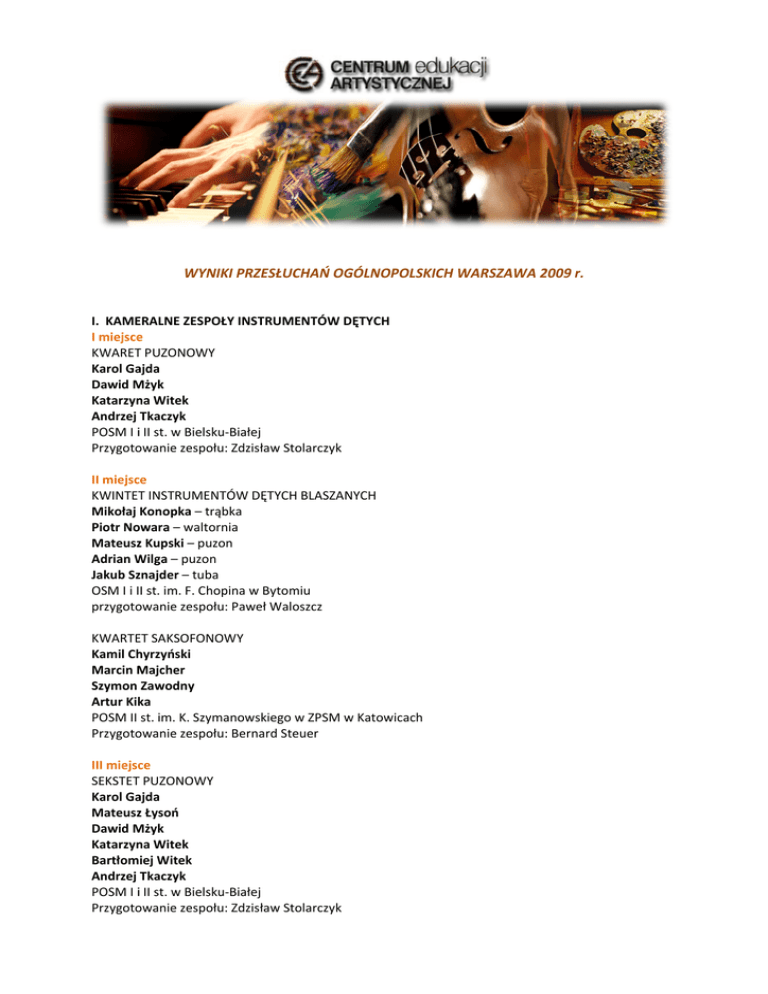 WYN NIKI PRZESŁŁUCHAŃ OG GÓLNOPOLSSKICH WAR RSZAWA 20 009 r. I. KAMEERALNE ZESP POŁY INSTRU UMENTÓW D DĘTYCH I miejsce e KWARETT PUZONOWY Karol Gaajda Dawid M Mżyk Katarzyn na Witek Andrzej Tkaczyk POSM I ii II st. w Bielssku‐Białej Przygoto owanie zespo ołu: Zdzisław w Stolarczyk II miejscce KWINTETT INSTRUMEENTÓW DĘTYYCH BLASZAN NYCH Mikołaj Konopka – ttrąbka Piotr No owara – waltornia Mateuszz Kupski – pu uzon Adrian W Wilga – puzo on Jakub Szznajder – tub ba OSM I i II st. im. F. Ch hopina w Byttomiu przygoto owanie zespo ołu: Paweł W Waloszcz KWARTEET SAKSOFON NOWY Kamil Ch hyrzyński Marcin M Majcher Szymon Zawodny Artur Kikka POSM II st. im. K. Szyymanowskiego w ZPSM w w Katowicach Przygoto owanie zespo ołu: Bernard Steuer III miejscce SEKSTETT PUZONOWYY Karol Gaajda Mateuszz Łysoń Dawid M Mżyk Katarzyn na Witek Bartłomiej Witek Andrzej Tkaczyk POSM I ii II st. w Bielssku‐Białej Przygoto owanie zespo ołu: Zdzisław w Stolarczyk KWARTET INSTRUMENTÓW DĘTYCH BLASZANYCH Paweł Zadrożniak – trąbka Marcin Zarzycki – trąbka Marta Kraska – róg Ewa Harasimiuk – puzon ZPSM nr 4 im. K. Szymanowskiego w Warszawie Przygotowanie zespołu: Wiesław Woźnicki TRIO Emilia Dolińska – flet Marta Dolińska – obój Natalia Łysynkiewicz – fortepian ZSM im. I. Paderewskiego w Białymstoku Przygotowanie zespołu: Urszula Doronowska TRIO Michał Maślak – saksofon altowy Julita Przybylska – saksofon altowy Dorota Jaremczuk – fortepian ZSM II st. im. F. Nowowiejskiego w Szczecinie Przygotowanie zespołu: Ewa Ruszała KWINTET INSTRUMENTÓW DĘTYCH BLASZANYCH Wojciech Siwek – trąbka Piotr Zwierzchowski – trąbka Maja Książkiewicz – róg Jacek Rucz – puzon Krzysztof Żebrowski – tuba ZPSM nr 1 w Warszawie Przygotowanie zespołu: Robert Krajewski II. WIOLONCZELA I KONTRABAS I miejsce Agata Nowak, kl. V – wiolonczela PSM I st. im. Fr. Chopina w Miastku nauczyciel – Kamila Wiśniewska‐Czaja II miejsce Maria Kamila Leszczyńska, kl. IV (II rok nauki) – wiolonczela ZPOSM I i II st. im. G. Bacewicz w Warszawie nauczyciel – Michał Nyżnyk Sebastian Kozub, kl. IV ‐ wiolonczela OSM I i II st. im. K. Lipińskiego w Lublinie nauczyciel – Mirosław Kozub III miejsce Jakub Nakoneczny, kl. IV – wiolonczela POSM I st. nr 1 im. H. Wieniawskiego w Poznaniu nauczyciel – Dorota Hajzer Dominika Chodakowska, kl. V – wiolonczela PSM I st. nr 2 im. Fr. Chopina w Warszawie nauczyciel – Joanna Święs Zofia Miksa, kl. V – wiolonczela ZSM nr 4 im. K. Szymanowskiego w Warszawie nauczyciel – Magdalena Rostworowska Antoni Orłowski, kl. IV – wiolonczela SM I i II st. im. O. Kolberga w Szczecinku nauczyciel – Kamila Wiśniewska‐Czaja Zuzanna Hermanowska, kl. V – wiolonczela . SM I i II st. im. O. Kolberga w Szczecinku nauczyciel – Kamila Wiśniewska‐Czaja Jakub Lemański, kl. V – wiolonczela OSM I i II st.im. H. Wieniawskiego w Łodzi nauczyciel – Robert Fender Jan Lewandowski, kl. III (cykl 4‐letni) – wiolonczela PSM I st. im. J. Garści w Tczewie nauczyciel – Mirosław Czochór Antoni Majewski, kl. V – wiolonczela OSM I st. w PZSM im. A. Rubinsteina w Bydgoszczy nauczyciel – Joanna Otmianowska‐Siarkiewicz III. INSTRUMENTY DĘTE DREWNIANE I miejsce Jagoda Krzemińska – flet PSM I st. w Kluczborku nauczyciel ‐ Karina Kandzia – Maniak Szymon Murawski – klarnet PSM I st. im. F. Chopina w Warszawie nauczyciel ‐ Małgorzata Czachowska II miejsce Justyna Brocka – flet ZSM nr 1 im. K. Szymanowskiego w Rzeszowie nauczyciel ‐ Ewa Bocian Marcel Werbik – klarnet PSM I st. im. F. Chopina w Warszawie nauczyciel ‐ Małgorzata Czachowska Adrian Sadowy – saksofon PSM I st. im. W. Lutosławskiego w Zambrowie nauczyciel ‐ Krzysztof Witkowski III miejsce Daria Branny – flet PSM I i II st. im. I. J. Paderewskiego w Cieszynie nauczyciel – Dorota Parzyk Aleksandra Majda – obój PSM I i II st. im. F. Chopina w Nowym Sączu nauczyciel – Leszek Łopalewski Hubert Bogucki – klarnet SM w Radziejowie nauczyciel ‐ Bogdan Jaskrowski Igor Pluciński – saksofon ZSM im. K. Komedy – Trzcińskiego w Ostrowie Wielkopolskim nauczyciel Piotr Lewek Bolesław Twardziak – klarnet ZPSM nr 1 im. E. Młynarskiego w Warszawie nauczyciel ‐ Artur Pachlewski IV. INSTRUMENTY DĘTE BLASZANE I miejsce Mateusz Targowski – trąbka PSM I st. im. G. Bacewicz w Jaworznie nauczyciel ‐ Jan Jarosz II miejsce Wojciech Grzegorzewski – waltornia PSM I st. im. H. Wieniawskiego w Warszawie nauczyciel – Aleksander Szebesczyk Dominik Karaszewski – waltornia ZPSM nr 4 im. K. Szymanowskiego w Warszawie nauczyciel – Krzysztof Specjał III miejsce Lennard Czakaj – trąbka PBSM I st. w Leśnicy nauczyciel ‐ Klaudiusz Lisoń Marek Stolarczyk – puzon POSM I i II st. im. S. Moniuszki w Bielsku Białej nauczyciel ‐ Zdzisław Stolarczyk V. FORTEPIAN I miejsce Leszek Kawecki SM I st. im. G. Bacewicz we Wrocławiu nauczyciel ‐ Irena Maciukiewicz‐Schmidt II miejsce Ewa Bukała PSM I st. im. W. Kilara w Wodzisławiu Śląskim nauczyciel ‐ Urszula Kubecka Marian Michalski ZSM im. I.J. Paderewskiego w Tarnowie nauczyciel ‐ Anna Szojer III miejsce Magdalena Nizioł PSM I i II st. w Suwałkach nauczyciel ‐ Anna Borkowska Maria Zdziebkowska POSM I st. nr 1 im. H. Wieniawskiego w Poznaniu nauczyciel ‐ Anna Karowska VI. ZESPOŁY KAMERALNE SZKÓŁ MUZYCZNYCH II STOPNIA I miejsce TRIO FORTEPIANOWE Joanna Kacperek – fortepian Patrycja Mynarska – skrzypce Aleksander Tomaszkiewicz – wiolonczela OSM II st. im. Z. Brzewskiego w ZPSM nr 1 w Warszawie Przygotowanie zespołu: Krystyna Makowska – Ławrynowicz „MUZ KWARTET” Dominika Modelska – I skrzypce Karolina Mikołajczyk – II skrzypce Agata Struzik – III skrzypce Agata Janczy – IV skrzypce OSM II st. im. Z. Brzewskiego w ZPSM nr 1 w Warszawie Przygotowanie zespołu: Andrzej Gębski II miejsce TRIO FORTEPIANOWE Anna Banaś – wiolonczela Roma Tic – skrzy