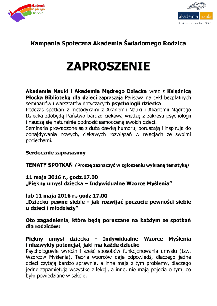 Kampania Społeczna Akademia Świadomego Rodzica ZAPROSZENIE Akademia Nauki i Akademia Mądrego Dziecka wraz z Książnicą Płocką Biblioteką dla dzieci zapraszają Państwa na cykl bezpłatnych seminariów i warsztatów dotyczących psychologii dziecka. Podczas spotkań z metodykami z Akademii Nauki i Akademii Mądrego Dziecka zdobędą Państwo bardzo ciekawą wiedzę z zakresu psychologii i nauczą się naturalnie podnosić samoocenę swoich dzieci. Seminaria prowadzone są z dużą dawką humoru, poruszają i inspirują do odnajdywania nowych, ciekawych rozwiązań w relacjach ze swoimi pociechami. Serdecznie zapraszamy TEMATY SPOTKAŃ /Proszę zaznaczyć w zgłoszeniu wybraną tematykę/ 11 maja 2016 r., godz.17.00 „Piękny umysł dziecka – Indywidualne Wzorce Myślenia” lub 11 maja 2016 r., godz.17.00 „Dziecko pewne siebie - jak rozwijać poczucie pewności siebie u dzieci i młodzieży” Oto zagadnienia, które będą poruszane na każdym ze spotkań dla rodziców: Piękny umysł dziecka - Indywidualne Wzorce Myślenia i niezwykły potencjał, jaki ma każde dziecko Psychologowie wyróżnili sześć sposobów funkcjonowania umysłu (tzw. Wzorców Myślenia). Teoria wzorców daje odpowiedź, dlaczego jedne dzieci czytają bardzo sprawnie, a inne mają z tym problemy, dlaczego jedne zapamiętują wszystko z lekcji, a inne, nie mają pojęcia o tym, co było powiedziane w szkole. Podczas spotkania, odkryją Państwo, jakim Wzorcem Myślenia posługuje się wasze Dziecko (ale również partner życiowy czy szef). Omówimy potencjały, które ma każdy wzorzec. Odnajdziemy klucz do lepszej komunikacji z dzieckiem oraz do rozumienia własnych i dziecięcych potrzeb. Odkryjemy sposób docierania i wzmacniania tego, co w dziecku działa na „plus”. Dotrzemy do skutecznych i prostych sposobów aktywizacji i wsparcia naturalnego potencjału każdego z sześciu wzorców. Dziecko pewne siebie - jak rozwijać poczucie pewności siebie u dzieci i młodzieży Podczas warsztatów poznają Państwo proste i ciekawe techniki, które pomogą rozwijać u swojego dziecka poczucie pewności siebie, umiejętność wyznaczania celów i odwagę do ich realizacji. Dowiedzą się, skąd się bierze utrata poczucia pewności siebie i jakie narzędzia można wykorzystać w sytuacjach problemowych, jak pomóc dziecku wyjść z negatywnej roli i dotrzeć do jego zasobów. Jak wspierać dziecko w budowaniu pozytywnego wizerunku własnej osoby? Co robić, gdy pojawiają się trudności? Odkryją Państwo proste sposoby i otrzymają praktyczne wskazówki. Aby zapisać się na warsztaty, należy wypełnić formularz zgłoszeniowy, który znajduje się na stronie www.ksiaznicaplocka.pl W odpowiedzi na zgłoszenie wyślemy Państwu potwierdzenie zgłoszenia oraz niezbędne informacje dotyczące warsztatów. W razie potrzeby prosimy dzwonić pod numer 24 262 27 69. Zgłoszenia przyjmujemy do 5 maja br. Ilość miejsc jest ograniczona i o zapisie będzie decydowała kolejność zgłoszeń. Serdecznie zapraszamy!
