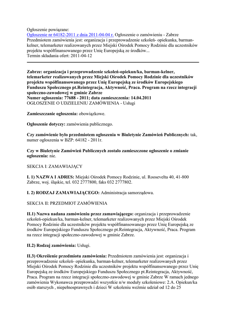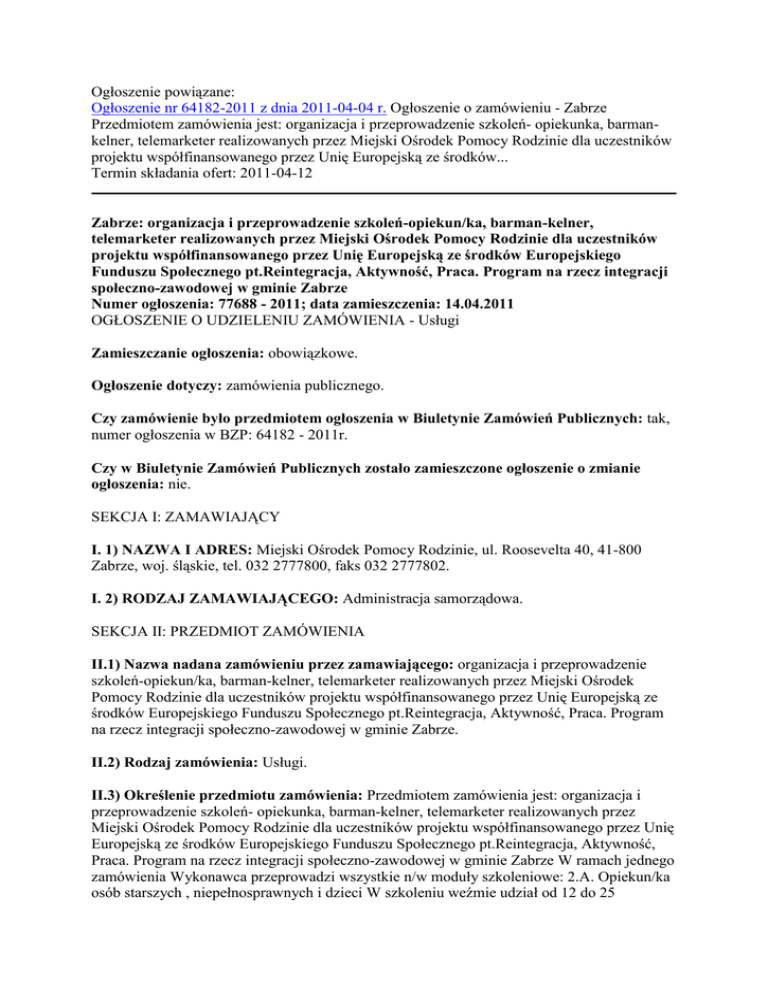 Ogłoszenie powiązane: Ogłoszenie nr 64182-2011 z dnia 2011-04-04 r. Ogłoszenie o zamówieniu - Zabrze Przedmiotem zamówienia jest: organizacja i przeprowadzenie szkoleń- opiekunka, barmankelner, telemarketer realizowanych przez Miejski Ośrodek Pomocy Rodzinie dla uczestników projektu współfinansowanego przez Unię Europejską ze środków... Termin składania ofert: 2011-04-12 Zabrze: organizacja i przeprowadzenie szkoleń-opiekun/ka, barman-kelner, telemarketer realizowanych przez Miejski Ośrodek Pomocy Rodzinie dla uczestników projektu współfinansowanego przez Unię Europejską ze środków Europejskiego Funduszu Społecznego pt.Reintegracja, Aktywność, Praca. Program na rzecz integracji społeczno-zawodowej w gminie Zabrze Numer ogłoszenia: 77688 - 2011; data zamieszczenia: 14.04.2011 OGŁOSZENIE O UDZIELENIU ZAMÓWIENIA - Usługi Zamieszczanie ogłoszenia: obowiązkowe. Ogłoszenie dotyczy: zamówienia publicznego. Czy zamówienie było przedmiotem ogłoszenia w Biuletynie Zamówień Publicznych: tak, numer ogłoszenia w BZP: 64182 - 2011r. Czy w Biuletynie Zamówień Publicznych zostało zamieszczone ogłoszenie o zmianie ogłoszenia: nie. SEKCJA I: ZAMAWIAJĄCY I. 1) NAZWA I ADRES: Miejski Ośrodek Pomocy Rodzinie, ul. Roosevelta 40, 41-800 Zabrze, woj. śląskie, tel. 032 2777800, faks 032 2777802. I. 2) RODZAJ ZAMAWIAJĄCEGO: Administracja samorządowa. SEKCJA II: PRZEDMIOT ZAMÓWIENIA II.1) Nazwa nadana zamówieniu przez zamawiającego: organizacja i przeprowadzenie szkoleń-opiekun/ka, barman-kelner, telemarketer realizowanych przez Miejski Ośrodek Pomocy Rodzinie dla uczestników projektu współfinansowanego przez Unię Europejską ze środków Europejskiego Funduszu Społecznego pt.Reintegracja, Aktywność, Praca. Program na rzecz integracji społeczno-zawodowej w gminie Zabrze. II.2) Rodzaj zamówienia: Usługi. II.3) Określenie przedmiotu zamówienia: Przedmiotem zamówienia jest: organizacja i przeprowadzenie szkoleń- opiekunka, barman-kelner, telemarketer realizowanych przez Miejski Ośrodek Pomocy Rodzinie dla uczestników projektu współfinansowanego przez Unię Europejską ze środków Europejskiego Funduszu Społecznego pt.Reintegracja, Aktywność, Praca. Program na rzecz integracji społeczno-zawodowej w gminie Zabrze W ramach jednego zamówienia Wykonawca przeprowadzi wszystkie n/w moduły szkoleniowe: 2.A. Opiekun/ka osób starszych , niepełnosprawnych i dzieci W szkoleniu weźmie udział od 12 do 25 uczestników projektu systemowego . Program powinien zawierać m.in. zagadnienia dotyczące usług pielęgniarsko - opiekuńczych tj. m.in. higieny i pielęgnacji podopiecznych, pierwsza pomoc, komunikacja i współpraca z podopiecznym i jego rodziną, organizowanie opieki zdrowotnej i czasu wolnego podopiecznemu w opiece domowej, zasady etyki zawodowej, wiedza teoretyczna na temat wieku podeszłego, niemowlęcego i dziecięcego, pielęgnowanie dziecka zdrowego, obserwowanie i kontrolowanie prawidłowego rozwoju psychicznego i fizycznego dziecka. Dolegliwości w okresie choroby i ich przyczyny, przygotowywanie posiłków, podstawy prawne. Opieka nad osobą niepełnosprawną. Czas trwania - 100 godzin z czego minimum 50 godzin praktycznych. Organizator kursu zapewnia : sprzęt niezbędny do przeprowadzenia szkolenia, materiały szkoleniowe w tym jeden dodatkowy do dokumentacji projektu, egzamin wewnętrzny. 2.B. Barman-Kelner W szkoleniu weźmie udział od 3 do 10 uczestników projektu systemowego . Program powinien zawierać m.in. zagadnienia dotyczące : podstawowe wiadomości o zakładach gastronomicznych, poziom i kultura obsługi klienta, zasady serwowania dań zasadniczych oraz napoi i koktajli, praca za barem, organizacja przyjęć bankietów. Minimum sanitarne. Podstawy obsługi kasy fiskalnej, zasady żywienia, zasady bhp w miejscu pracy. Czas trwania - 90 godzin z czego minimum 50 godzin praktycznych. Organizator kursu zapewnia : sprzęt niezbędny do przeprowadzenia szkolenia, stanowiska kasowe w ilości 1 na dwóch uczestników, materiały szkoleniowe w tym jeden dodatkowy do dokumentacji projektu, egzamin wewnętrzny, W koszt kursu należy doliczyć opłatę za materiały i sprzęt niezbędny do przeprowadzenia szkolenia, opłatę za badania lekarskie wymagane do książeczki SANEPIDU, które należy przeprowadzić na początku szkolenia. W przypadku negatywnego wyniku badań Zamawiający zapłaci jedynie za koszt badań lekarskich na podstawie przedstawione faktury. 2.C. Telemarketer W szkoleniu weźmie udział od 1 do 10 uczestników projektu systemowego . Program powinien zawierać m.in. zagadnienia dotyczące : metod identyfikacji i docierania do Klientów, zachowanie się podczas pierwszego kontaktu z klientem, analiza potrzeb klienta, skuteczna prezentacja usługi - sprzedaży towaru, umiejętność negocjowania, techniki skutecznej sprzedaży. Czas trwania - 20 godzin Organizator kursu zapewnia : sprzęt niezbędny do przeprowadzenia szkolenia. 1.Realizacja szkolenia odbywać się będzie na przestrzeni 5 dni w tygodniu od poniedziałku do piątku. 2. Dzienny wymiar godzin dydaktycznych nie powinien przekroczyć 5 godzin lekcyjnych ( 1 godzina lekcyjna = 45 minut) z uwzględnieniem przerwy kawowej 15 minut oraz przerwy na obiad 30 minut. 3. Miejsce realizacji szkolenia - pomieszczenia i ośrodki na terenie miasta Zabrze 4. Warunki lokalowe, sale szkoleniowe oraz wykorzystywany sprzęt muszą spełniać wymogi prawne w zakresie BHP i p.poż. Zapewnione pomieszczenie/sala wyposażona będzie w odpowiednią do liczby uczestników liczbę stolików i miejsc siedzących, właściwie oświetloną, ogrzewaną, przewietrzaną i odizolowaną od innych pomieszczeń. 5. Organizator kursu zapewnia w kosztach zajęć teoretycznych i praktycznych usługę cateringu rozumianą jako przygotowanie i serwowanie posiłków, przez które Zamawiający rozumie podanie uczestnikom szkolenia w trakcie jednego dnia szkolenia praktycznego i teoretyczn