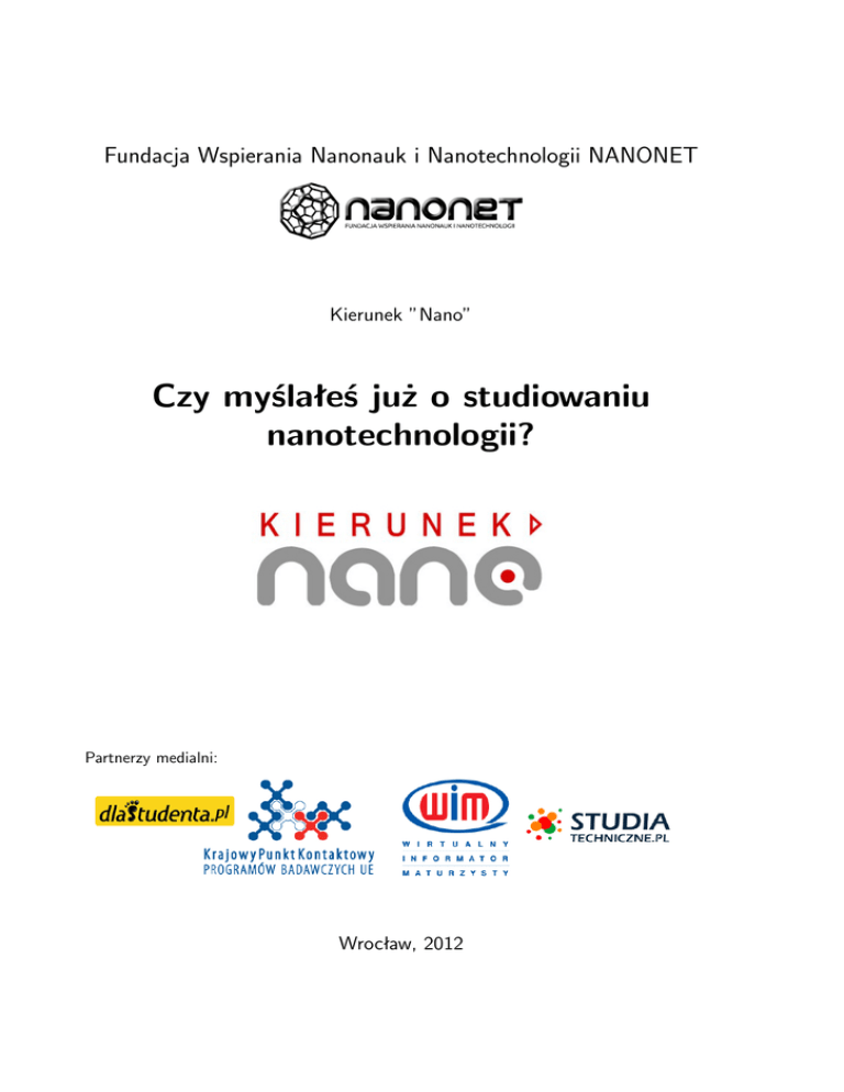 Fundacja Wspierania Nanonauk i Nanotechnologii NANONET Kierunek ”Nano” Czy myślałeś już o studiowaniu nanotechnologii? Partnerzy medialni: Wrocław, 2012 Niezwykle dynamiczny rozwój współczesnej cywilizacji stawia przed nami wyzwania projektowania coraz to bardziej zaawansowanych materiałów. Równocześnie, jak nigdy przedtem, postęp nauki otwiera przed nami możliwości świadomego kształtowania ich struktury i własności już na poziomie atomowym. Nanotechnologia czyli nauka, która zajmuje się tworzeniem materiałów w takiej skali jest dziś jedną z najszybciej rozwijających się gałęzi wiedzy. Znajduje coraz szersze zastosowania w wielu dziedzinach życia (technika, medycyna). Szybko upowszechnia się jako samodzielny kierunek akademicki. Staje się podstawą wielu programów rozwojowych oraz narodowych strategii, które w nanotechnologii widzą fundament budowy społeczeństwa opartego na wiedzy i motor postępu iście na miarę XXI wieku. To właśnie głównie w rozwoju nanotechnologii upatruje się dziś szansy na zwiększenie konkurencyjności europejskiej gospodarki i doszlusowanie do czołówki globalnego wyścigu. W tym świetle nanotechnologia jest bez wątpienia roztropnym krokiem w przyszłość. Ale czy wiesz, gdzie w Polsce można studiować „nanotechnologię”? Oferta której uczelni jest w tym względzie najlepiej dopasowana do Twoich indywidulanych potrzeb i osobistych wymagań? Który spośród dostępnych kierunków najpełniej odpowiada Twoim oczekiwaniom, da Ci poczucie rozwoju i rozbudzi zainteresowania? Należy pamiętać, że nanotechnologia to interdyscyplinarna dziedzina nauki łącząca w sobie wiele dyscyplin podstawowych i dlatego w zależności od wybranego kierunku nacisk na określony profil kształcenia może się nieco różnić. Aby pomóc Ci znaleźć odpowiedź na powyższe pytania nasza Fundacja Wspierania Nanonauk i Nanotechnologii Nanonet zainicjowała w marcu 2012 roku projekt którego, celem było opracowanie kompletnej oferty dydaktycznej polskich uczelni. Projekt nosił tytuł “Kierunek Nano” i jego owocem jest niniejszy informator. Nie bez satysfakcji oddajemy go teraz w ręce czytelnika. Wierzymy, że zebrane przez nas i w przyjazny sposób przedstawione zestawienie kierunków, specjalizacji, perspektyw dalszego rozwoju i zatrudnienia, możliwości udziału w pracach badawczych i wyjazdach zagranicznych pozwolą każdemu przyszłemu studentowi dokonać bardziej świadomego wyboru swojego zawodu. Na stronie www. nanonet. pl dostępnych jest ponadto więcej informacji związanych z rozwojem nauki w nanoskali. Zachęcamy do odwiedzenia naszej strony. Fundacja Nanonet działa od 2006 roku, posiada status Organizacji Pożytku Publicznego. Jest cenionym propagatorem i rzecznikiem nauki w Polsce a także coraz częściej zagranicą. Fundacja w swych szeregach zrzesza wielu doświadczonych badaczy, początkujących adeptów nauki, przedstawicieli przemysłu, a także znaczącą grupę zwyczajnych miłośników postępu. Nanonet nieustannie podejmuje nowe działania, jest inspiratorem wielu przedsięwzięć, projektów służących promocji i rozwojowi nanotechnologii. Za swe osiągnięcia otrzymała wiele prestiżowych nagród min. jest laureatem VII edycji konkursu Popularyzator Nauki. Skład zespołu projektowego: Agata Mendys, Zuzanna Jarosz, Rafał Mech, Monika Michalska, Anna Mączka, Monika Mech, Michał Ksionek, Konrad Ptasiński, Dominika Januszkiewicz, Natalia Florek, Adam Szatkowski. Korekta i skład publikacji: Katarzyna Maksymow, Paweł Czaja, Monika Michalska, Agata Mendys, Adam Szatkowski. Opracowanie graficzne plakatu oraz logo projektu „Kierunek Nano”: Dobromił Nosek. Zachęcamy do zaglądania na naszą stronę - www. nanonet. pl w poszukiwaniu najnowszych informacji z nanoświata. Kontakt: [email protected] Spis treści Spis treści i Województwo Dolnośląskie Politechnika Wrocławska . . . . . . . . . . . . . . . . . . . . . . . . . . . 1 1 Województwo Lubuskie 13 Uniwersytet Zielonogórski . . . . . . . . . . . . . . . . . . . . . . . . . . 13 Województwo Łódzkie 17 Politechnika Łódzka . . . . . . . . . . . . . . . . . . . . . . . . . . . . . . 17 Województwo Małopolskie 19 Uniwersytet Jagielloński . . . . . . . . . . . . . . . . . . . . . . . . . . . 19 Akademia Górniczo-Hutnicza . . . . . . . . . . . . . . . . . . . . . . . . 23 Województwo Mazowieckie 29 Politechnika Warszawska . . . . . . . . . . . . . . . . . . . . . . . . . . . 29 Uniwersytet Warszawski . . . . . . . . . . . . . . . . . . . . . . . . . . . 31 Województwo Podkarpackie 35 Politechnika Rzeszowska . . . . . . . . . . . . . . . . . . . . . . . . . . . 35 Uniwersytet Rzeszowski . . . . . . . . . . . . . . . . . . . . . . . . . . . 37 Województwo Podlaskie 41 Politechnika Białostocka . . . . . . . . . . . . . . . . . . . . . . . . . . . 41 Województwo Pomorskie 49 Politechnika Gdańska . . . . . . . . . . . . . . . . . . . . . . . . . . . . . 49 Akademia Pomorska w Słupsku . . . . . . . . . . . . . . . . . . . . . . . 51 Uniwersytet Gdański . . . . . . . . . . . . . . . . . . . . . . . . . . . . . 52 Województwo Śląskie 55 i ii Politechnika Śląska . . . . . . . . . . . . . . . . . . . . . . . . . . . . . . 55 Województwo Świętokrzyskie 63 Uniwersytet Jana Kochanowskiego w Kielcach . . . . . . . . . . . . . . . 63 Województwo Wielkopolskie 67 Politechnika Poznańska . . . . . . . . . . . . . . . . . . . . . . . . . . . . 67 Uniwersytet im. Adama Mickiewicza w Poznaniu . . . . . . . . . . . . . 69 Województwo Zachodniopomorskie 71 Uniwersytet Szczeciński . . . . . . . . . . . . . . . . . . . . . . . . . . . 71 Zachodniopomorski Uniwersytet Technologiczny . . . . . . . . . . . . . . 73 Województwo Dolnośląskie Politechnika Wrocławska Fizyka Techniczna, specjalność: nanoinżynieria Jednostka prowadząca: Wydział Podstawowych Problemów Techniki Rodzaj studiów: I, II stopnia, stacjonarne Opis kier