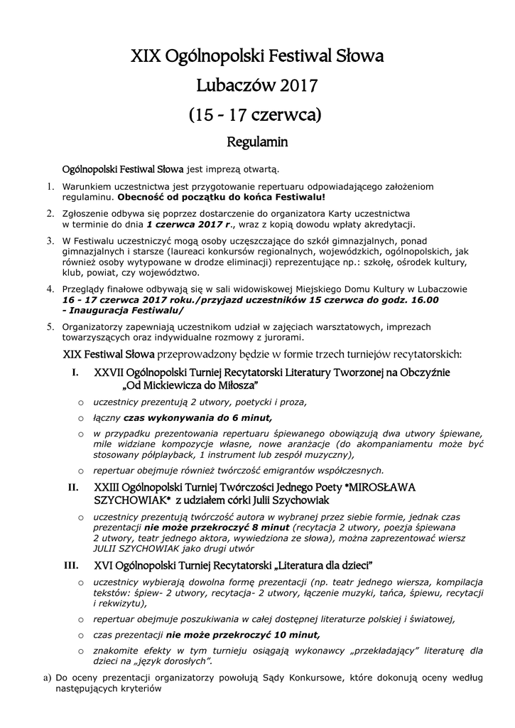 XIX Ogólnopolski Festiwal Słowa Lubaczów 2017 (15 - 17 czerwca) Regulamin Ogólnopolski Festiwal Słowa jest imprezą otwartą. 1. Warunkiem uczestnictwa jest przygotowanie repertuaru odpowiadającego założeniom regulaminu. Obecność od początku do końca Festiwalu! 2. Zgłoszenie odbywa się poprzez dostarczenie do organizatora Karty uczestnictwa w terminie do dnia 1 czerwca 2017 r., wraz z kopią dowodu wpłaty akredytacji. 3. W Festiwalu uczestniczyć mogą osoby uczęszczające do szkół gimnazjalnych, ponad gimnazjalnych i starsze (laureaci konkursów regionalnych, wojewódzkich, ogólnopolskich, jak również osoby wytypowane w drodze eliminacji) reprezentujące np.: szkołę, ośrodek kultury, klub, powiat, czy województwo. 4. Przeglądy finałowe odbywają się w sali widowiskowej Miejskiego Domu Kultury w Lubaczowie 16 - 17 czerwca 2017 roku./przyjazd uczestników 15 czerwca do godz. 16.00 - Inauguracja Festiwalu/ 5. Organizatorzy zapewniają uczestnikom udział w zajęciach warsztatowych, imprezach towarzyszących oraz indywidualne rozmowy z jurorami. XIX Festiwal Słowa przeprowadzony będzie w formie trzech turniejów recytatorskich: I. XXVII Ogólnopolski Turniej Recytatorski Literatury Tworzonej na Obczyźnie „Od Mickiewicza do Miłosza” o uczestnicy prezentują 2 utwory, poetycki i proza, o łączny czas wykonywania do 6 minut, o w przypadku prezentowania repertuaru śpiewanego obowiązują dwa utwory śpiewane, mile widziane kompozycje własne, nowe aranżacje (do akompaniamentu może być stosowany półplayback, 1 instrument lub zespół muzyczny), o repertuar obejmuje również twórczość emigrantów współczesnych. II. XXIII Ogólnopolski Turniej Twórczości Jednego Poety *MIROSŁAWA SZYCHOWIAK* z udziałem córki Julii Szychowiak o uczestnicy prezentują twórczość autora w wybranej przez siebie formie, jednak czas prezentacji nie może przekroczyć 8 minut (recytacja 2 utwory, poezja śpiewana 2 utwory, teatr jednego aktora, wywiedziona ze słowa), można zaprezentować wiersz JULII SZYCHOWIAK jako drugi utwór III. XVI Ogólnopolski Turniej Recytatorski „Literatura dla dzieci” o uczestnicy wybierają dowolna formę prezentacji (np. teatr jednego wiersza, kompilacja tekstów: śpiew- 2 utwory, recytacja- 2 utwory, łączenie muzyki, tańca, śpiewu, recytacji i rekwizytu), o repertuar obejmuje poszukiwania w całej dostępnej literaturze polskiej i światowej, o czas prezentacji nie może przekroczyć 10 minut, o znakomite efekty w tym turnieju osiągają wykonawcy „przekładający” literaturę dla dzieci na „język dorosłych”. a) Do oceny prezentacji organizatorzy powołują Sądy Konkursowe, które dokonują oceny według następujących kryteriów o ogólny wyraz artystyczny, o dobór repertuaru (do możliwości wykonawczych oraz wartości artystyczne) o kultura słowa, o interpretacja utworów, o zgodność muzyki z charakterem prezentacji, b) Każdy uczestnik może wystąpić we wszystkich trzech Turniejach Festiwalowych, c) W każdym Turnieju jury przyzna nagrody główne (pieniężne i rzeczowe) oraz nagrody specjalne i wyróżnienia, d) Jury przyzna również GRAND PRIX uczestnikowi trzech Turniejów Festiwalowych oraz NAGRODĘ PUBLICZNOŚCI i NAGRODĘ INSTRUKTORSKĄ. ZASADY ORGANIZACYJNE - Organizatorem Konkursu jest Miejski Dom Kultury im. Aleksandra Sas Bandrowskiego w Lubaczowie - Sekretariat Festiwalu - Miejski Dom Kultury w Lubaczowie ul. M. Konopnickiej 2 37-600 Lubaczów tel. 016 632 96 35 fax. 016 632 14 97 mail: [email protected], www.mdklubaczow.pl - Dyrektor Festiwalu - Andrzej Kindrat - dyrektor MDK - Konsultacja programowa - organizator Festiwalu - Grażyna Bielec [email protected] - wykonawcy, instruktorzy, nauczyciele, muzycy, akompaniatorzy pokrywają częściowe koszty pobytu w wysokości 130 zł od osoby. Wpłat należy dokonywać na konto Miejskiego Domu Kultury w Lubaczowie: 83 9101 0003 2001 0011 8747 0001 - organizatorzy zapewniają pełne wyżywienie i zakwaterowanie w internacie Zespołu Szkół w Oleszycach, oraz bezpłatny udział w imprezach festiwalowych, - uczestnicy przyjeżdżają na własny koszt, - uczestnicy zgłaszają na karcie potrzeby techniczne dla prawidłowego przebiegu prezentacji, - organizator dysponuje pełnym oświetleniem sceny, fortepianem Bechstein, nagłośnieniem. Celem Festiwalu jest: 1. Popularyzacja i poznanie twórczości wybitnych autorów. 2. Inspirowanie do poszukiwań repertuarowych. 3. Utrwalanie piękna polskiego języka i kultury żywego słowa. 4. Doskonalenie umiejętności warsztatowych wykonawców. 5. Stworzenie okazji do prezentacji autorskich pomysłów scenicznych. 6. Umożliwienie spotkania i rozmów wokół istotnych wartości współczesnego człowieka, wyrażanych poprzez sztukę recytatorską.