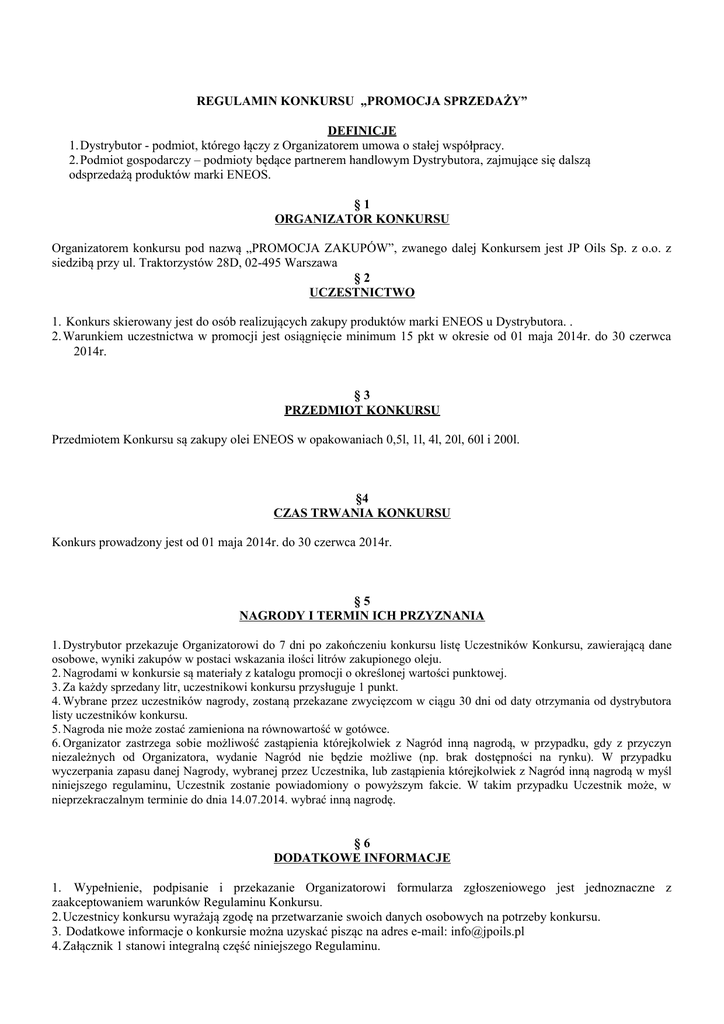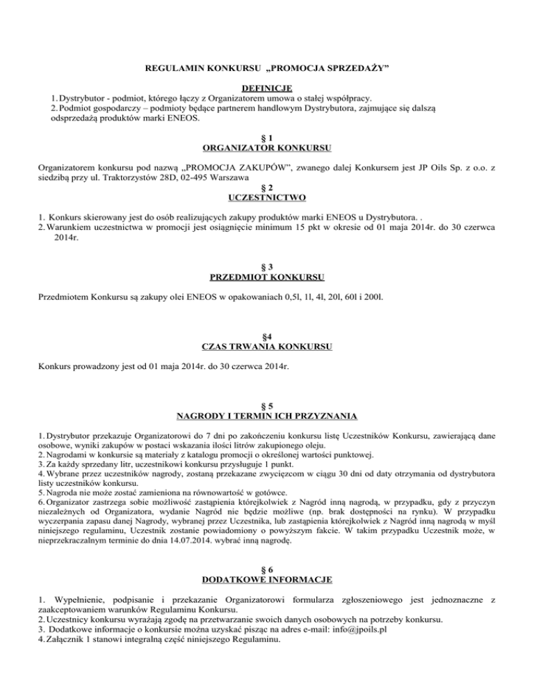 REGULAMIN KONKURSU „PROMOCJA SPRZEDAŻY” DEFINICJE 1. Dystrybutor - podmiot, którego łączy z Organizatorem umowa o stałej współpracy. 2. Podmiot gospodarczy – podmioty będące partnerem handlowym Dystrybutora, zajmujące się dalszą odsprzedażą produktów marki ENEOS. §1 ORGANIZATOR KONKURSU Organizatorem konkursu pod nazwą „PROMOCJA ZAKUPÓW”, zwanego dalej Konkursem jest JP Oils Sp. z o.o. z siedzibą przy ul. Traktorzystów 28D, 02-495 Warszawa §2 UCZESTNICTWO 1. Konkurs skierowany jest do osób realizujących zakupy produktów marki ENEOS u Dystrybutora. . 2. Warunkiem uczestnictwa w promocji jest osiągnięcie minimum 15 pkt w okresie od 01 maja 2014r. do 30 czerwca 2014r. §3 PRZEDMIOT KONKURSU Przedmiotem Konkursu są zakupy olei ENEOS w opakowaniach 0,5l, 1l, 4l, 20l, 60l i 200l. §4 CZAS TRWANIA KONKURSU Konkurs prowadzony jest od 01 maja 2014r. do 30 czerwca 2014r. §5 NAGRODY I TERMIN ICH PRZYZNANIA 1. Dystrybutor przekazuje Organizatorowi do 7 dni po zakończeniu konkursu listę Uczestników Konkursu, zawierającą dane osobowe, wyniki zakupów w postaci wskazania ilości litrów zakupionego oleju. 2. Nagrodami w konkursie są materiały z katalogu promocji o określonej wartości punktowej. 3. Za każdy sprzedany litr, uczestnikowi konkursu przysługuje 1 punkt. 4. Wybrane przez uczestników nagrody, zostaną przekazane zwycięzcom w ciągu 30 dni od daty otrzymania od dystrybutora listy uczestników konkursu. 5. Nagroda nie może zostać zamieniona na równowartość w gotówce. 6. Organizator zastrzega sobie możliwość zastąpienia którejkolwiek z Nagród inną nagrodą, w przypadku, gdy z przyczyn niezależnych od Organizatora, wydanie Nagród nie będzie możliwe (np. brak dostępności na rynku). W przypadku wyczerpania zapasu danej Nagrody, wybranej przez Uczestnika, lub zastąpienia którejkolwiek z Nagród inną nagrodą w myśl niniejszego regulaminu, Uczestnik zostanie powiadomiony o powyższym fakcie. W takim przypadku Uczestnik może, w nieprzekraczalnym terminie do dnia 14.07.2014. wybrać inną nagrodę. §6 DODATKOWE INFORMACJE 1. Wypełnienie, podpisanie i przekazanie Organizatorowi formularza zgłoszeniowego jest jednoznaczne z zaakceptowaniem warunków Regulaminu Konkursu. 2. Uczestnicy konkursu wyrażają zgodę na przetwarzanie swoich danych osobowych na potrzeby konkursu. 3. Dodatkowe informacje o konkursie można uzyskać pisząc na adres e-mail: [email protected] 4. Załącznik 1 stanowi integralną część niniejszego Regulaminu.