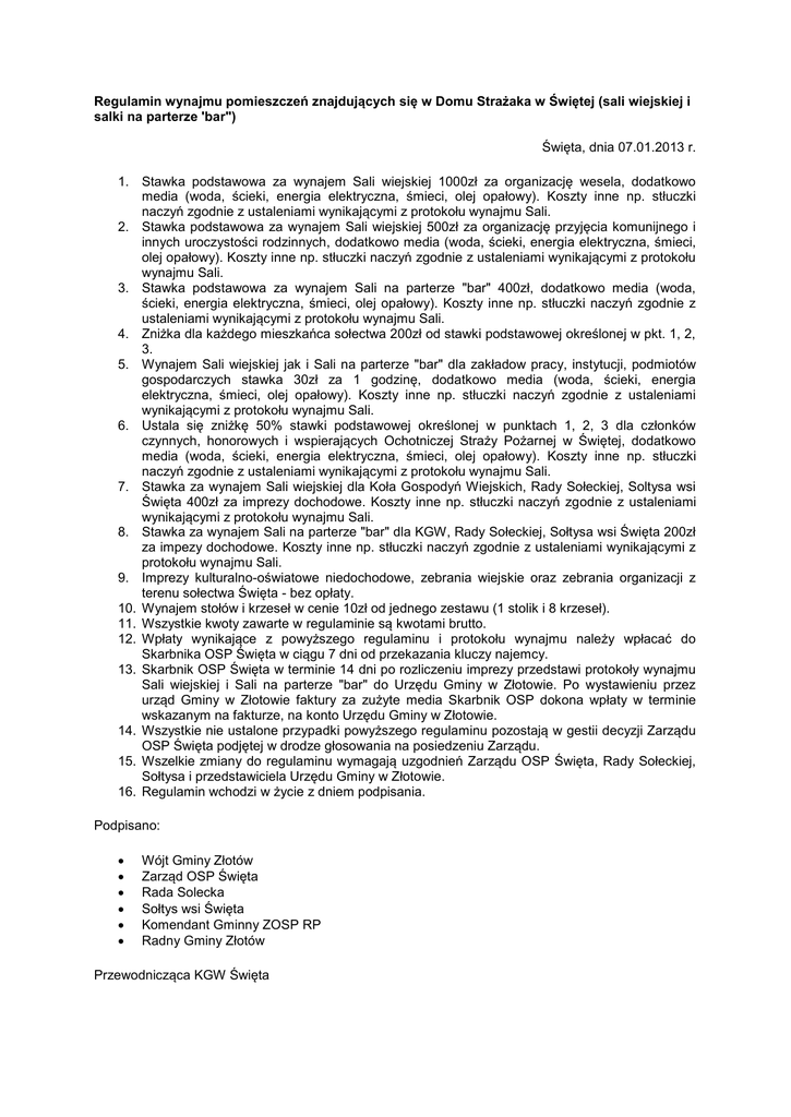 Regulamin wynajmu pomieszczeń znajdujących się w Domu Strażaka w Świętej (sali wiejskiej i salki na parterze 'bar") Święta, dnia 07.01.2013 r. 1. Stawka podstawowa za wynajem Sali wiejskiej 1000zł za organizację wesela, dodatkowo media (woda, ścieki, energia elektryczna, śmieci, olej opałowy). Koszty inne np. stłuczki naczyń zgodnie z ustaleniami wynikającymi z protokołu wynajmu Sali. 2. Stawka podstawowa za wynajem Sali wiejskiej 500zł za organizację przyjęcia komunijnego i innych uroczystości rodzinnych, dodatkowo media (woda, ścieki, energia elektryczna, śmieci, olej opałowy). Koszty inne np. stłuczki naczyń zgodnie z ustaleniami wynikającymi z protokołu wynajmu Sali. 3. Stawka podstawowa za wynajem Sali na parterze "bar" 400zł, dodatkowo media (woda, ścieki, energia elektryczna, śmieci, olej opałowy). Koszty inne np. stłuczki naczyń zgodnie z ustaleniami wynikającymi z protokołu wynajmu Sali. 4. Zniżka dla każdego mieszkańca sołectwa 200zł od stawki podstawowej określonej w pkt. 1, 2, 3. 5. Wynajem Sali wiejskiej jak i Sali na parterze "bar" dla zakładow pracy, instytucji, podmiotów gospodarczych stawka 30zł za 1 godzinę, dodatkowo media (woda, ścieki, energia elektryczna, śmieci, olej opałowy). Koszty inne np. stłuczki naczyń zgodnie z ustaleniami wynikającymi z protokołu wynajmu Sali. 6. Ustala się zniżkę 50% stawki podstawowej określonej w punktach 1, 2, 3 dla członków czynnych, honorowych i wspierających Ochotniczej Straży Pożarnej w Świętej, dodatkowo media (woda, ścieki, energia elektryczna, śmieci, olej opałowy). Koszty inne np. stłuczki naczyń zgodnie z ustaleniami wynikającymi z protokołu wynajmu Sali. 7. Stawka za wynajem Sali wiejskiej dla Koła Gospodyń Wiejskich, Rady Sołeckiej, Soltysa wsi Święta 400zł za imprezy dochodowe. Koszty inne np. stłuczki naczyń zgodnie z ustaleniami wynikającymi z protokołu wynajmu Sali. 8. Stawka za wynajem Sali na parterze "bar" dla KGW, Rady Sołeckiej, Sołtysa wsi Święta 200zł za impezy dochodowe. Koszty inne np. stłuczki naczyń zgodnie z ustaleniami wynikającymi z protokołu wynajmu Sali. 9. Imprezy kulturalno-oświatowe niedochodowe, zebrania wiejskie oraz zebrania organizacji z terenu sołectwa Święta - bez opłaty. 10. Wynajem stołów i krzeseł w cenie 10zł od jednego zestawu (1 stolik i 8 krzeseł). 11. Wszystkie kwoty zawarte w regulaminie są kwotami brutto. 12. Wpłaty wynikające z powyższego regulaminu i protokołu wynajmu należy wpłacać do Skarbnika OSP Święta w ciągu 7 dni od przekazania kluczy najemcy. 13. Skarbnik OSP Święta w terminie 14 dni po rozliczeniu imprezy przedstawi protokoły wynajmu Sali wiejskiej i Sali na parterze "bar" do Urzędu Gminy w Złotowie. Po wystawieniu przez urząd Gminy w Złotowie faktury za zużyte media Skarbnik OSP dokona wpłaty w terminie wskazanym na fakturze, na konto Urzędu Gminy w Złotowie. 14. Wszystkie nie ustalone przypadki powyższego regulaminu pozostają w gestii decyzji Zarządu OSP Święta podjętej w drodze głosowania na posiedzeniu Zarządu. 15. Wszelkie zmiany do regulaminu wymagają uzgodnień Zarządu OSP Święta, Rady Sołeckiej, Sołtysa i przedstawiciela Urzędu Gminy w Złotowie. 16. Regulamin wchodzi w życie z dniem podpisania. Podpisano: Wójt Gminy Złotów Zarząd OSP Święta Rada Solecka Sołtys wsi Święta Komendant Gminny ZOSP RP Radny Gminy Złotów Przewodnicząca KGW Święta